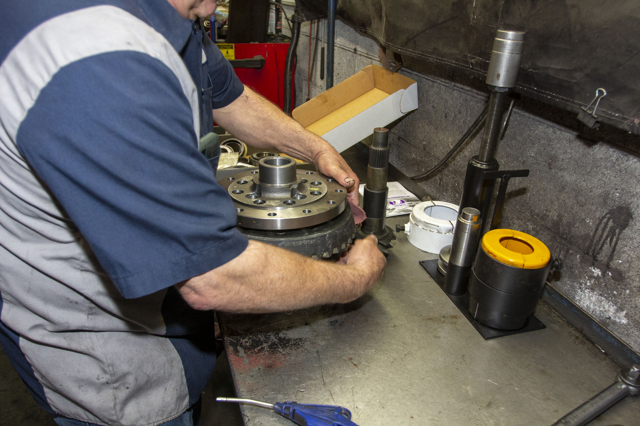 Before the new parts are installed in the axle housing, James set to work cleaning out all of the old gunk and smoothing the cover gasket mating surface with a polishing disc. This needs to be done before installing the differential as to not contaminate the new parts.