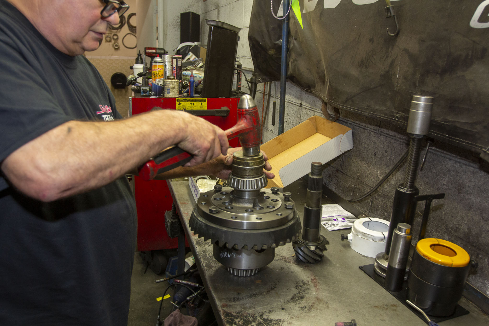 With the housing clean, the new pinion bearing races can be installed. Driving them into the housing requires a steady hand and a special punch.