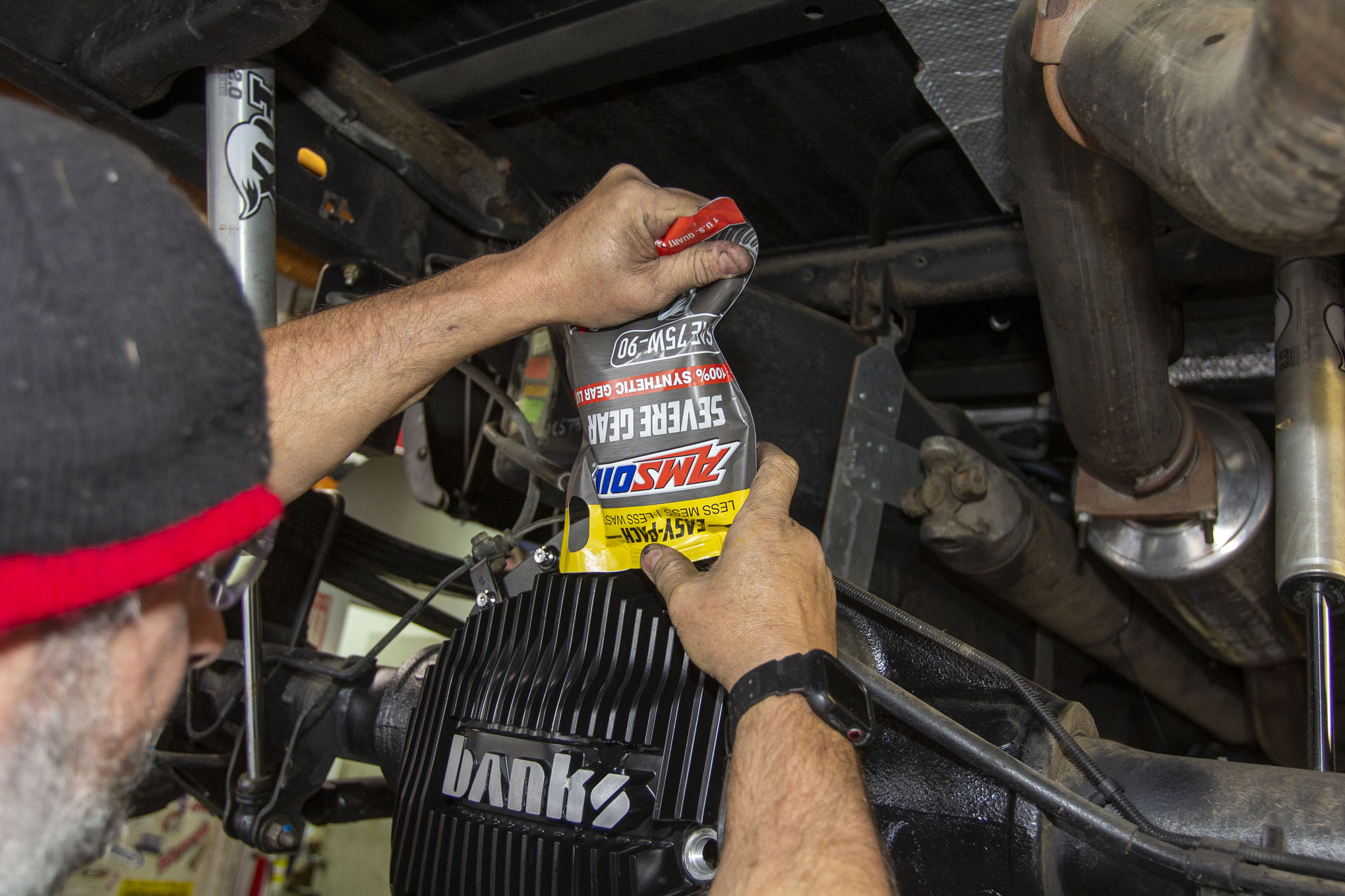 Before heading out on the first test drive, we filled the axle with four quarts of Amsoil 75W-90 Severe Gear oil. Packed in the company's new Easy Pack sack, the lube is easily squeezed into the differential's fill hole.