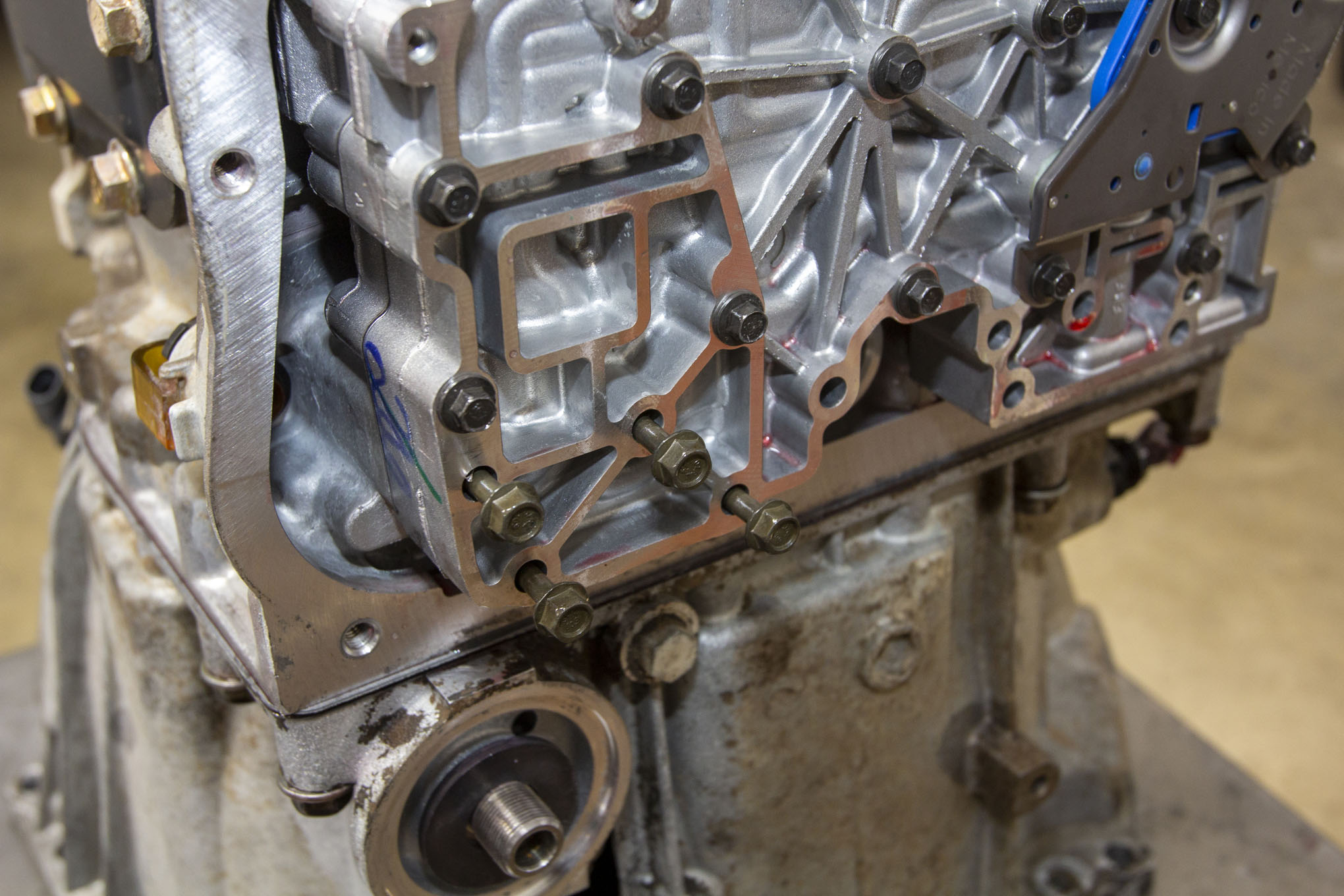 Seen here are the four bolts in the valve body. The factory bolts are longer, and thus, if used, will cause catastrophic (their words, not ours) damage to the transmission.
