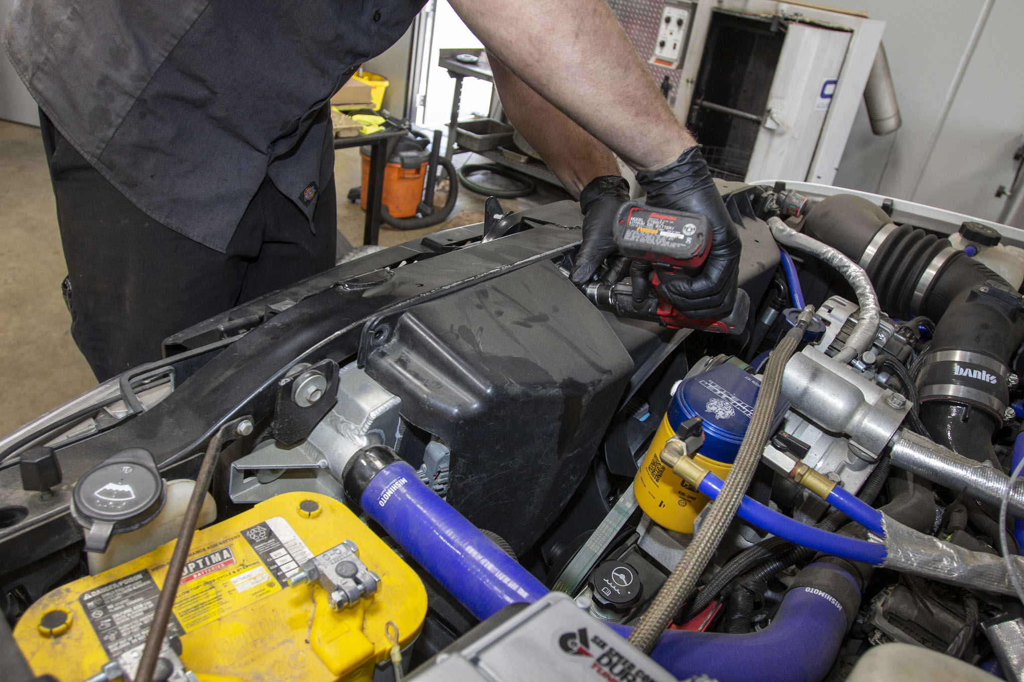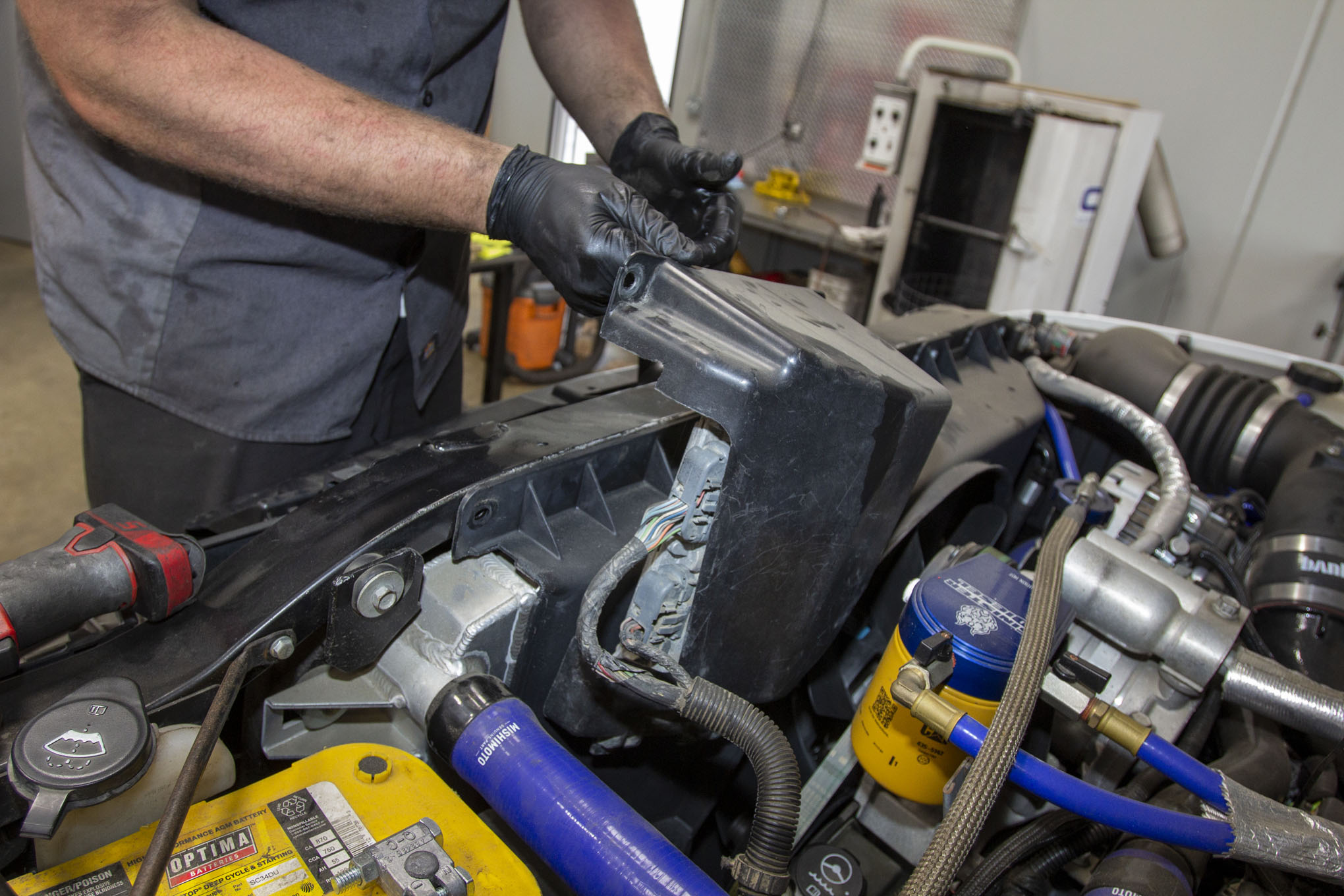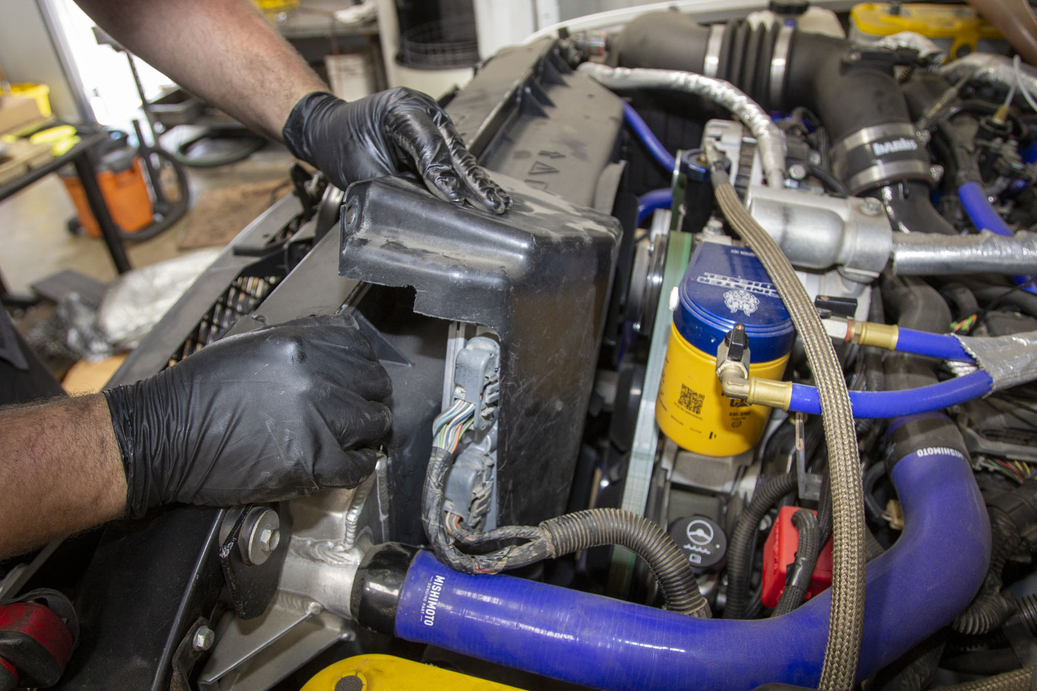 With the valve body install wrapped up, we turned to the other half of the conversion, the transmission control module. On early five-speed trucks, the TCM is located under a black cover bolted to the driver side of the fan shroud.
