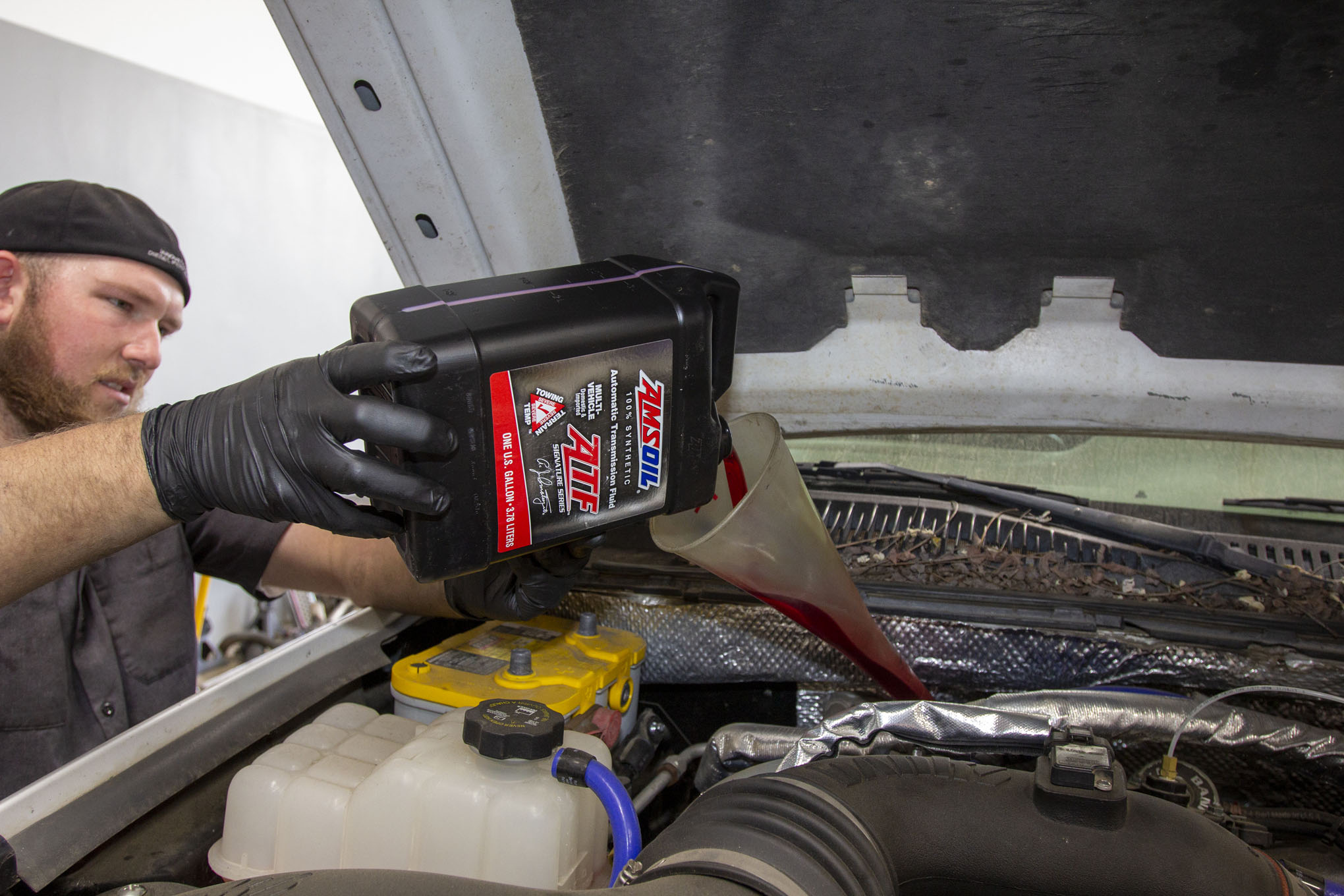 The first step to installing the conversion, no matter where or how you do it, is to drain the fluid. Because we had previously installed a PPE deep pan, that meant draining into a 5-gallon bucket. Always dispose of old fluid properly.