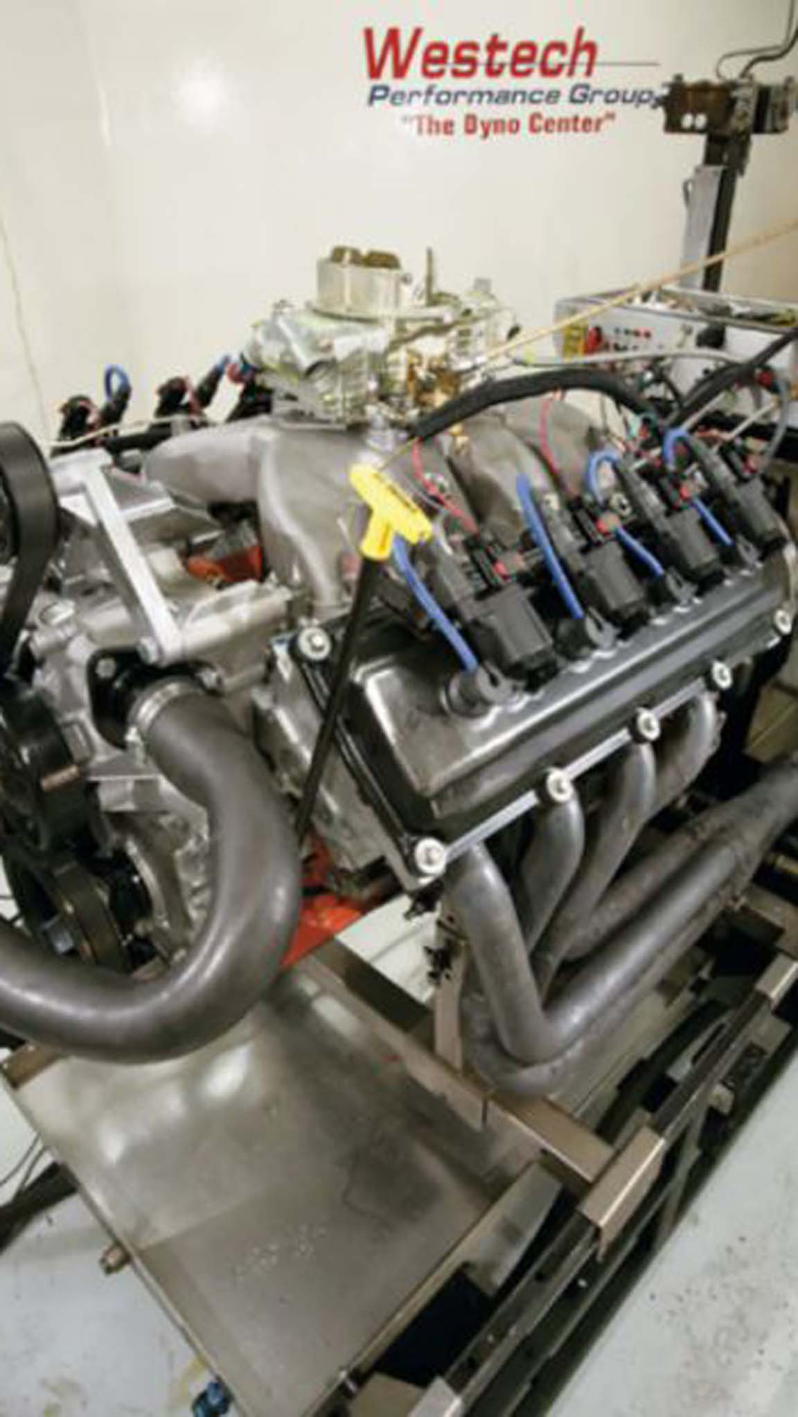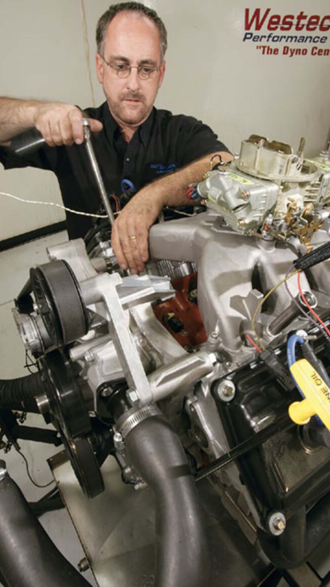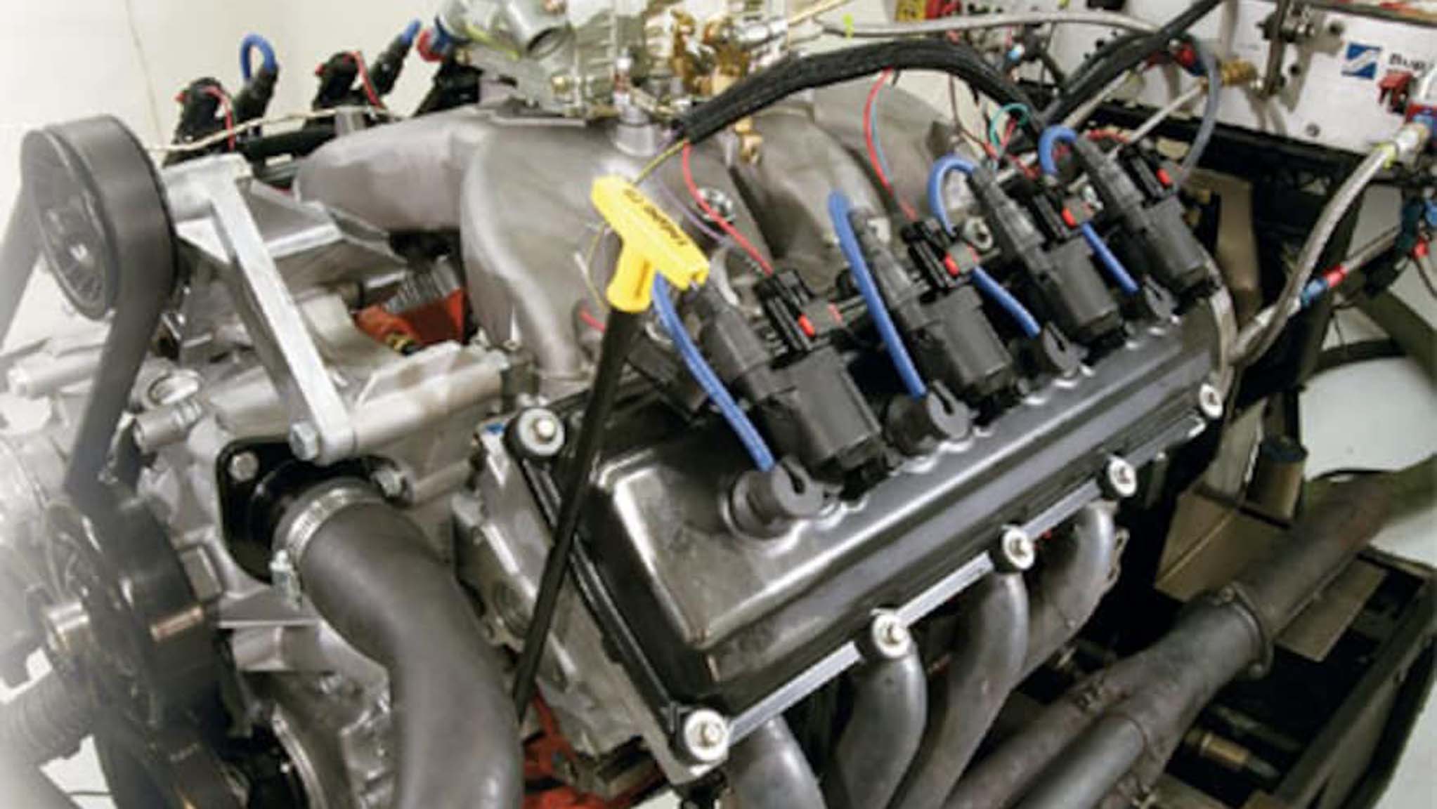 The crew at Westech Performance Group mounted the engine to their SuperFlow 901 dyno, bolted on a set of dyno headers, and our next job was the ignition. Our Hemi was an earlier (pre-2006) version with the crossover waste spark system, which fires the second plug on the exhaust stroke for emissions purposes. XV's kit comes with the required short spark plug wire, which connects the coil pack to the second plug of the same cylinder, firing both plugs simultaneously. We pulled the XV harness and controller from the pack, and it plugged right into the Hemi just as claimed, only requiring an additional ground and switched ignition connection. Hooking up this system makes the old Mopar electronic ignition look complicated. With that, we were assured that the engine was ready to run, and it was. Too easy.