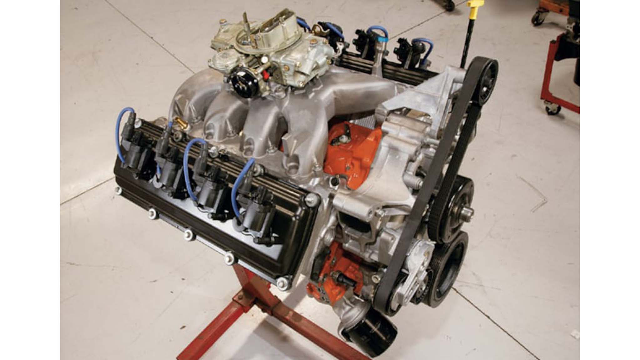 With everything already precalibrated, there was nothing left to do but warm up the engine and pull the throttle handle for our power numbers. With the totally stock engine running through a set of headers and the XV intake, carb, and ignition, we were shocked by just how docile and smooth the engine sounded and ran. With the OEM cam, the stock idle was in sharp contrast to the formidable power we found. Peak power came in at 371 hp at 5,800-5,900 rpm, while peak torque was recorded at 366 lb-ft at 4,800 rpm. It just goes to show the power potential in those new Hemi heads; these kinds of numbers would require a well-built old-style 360, with a fair bit of cam chop to get there.