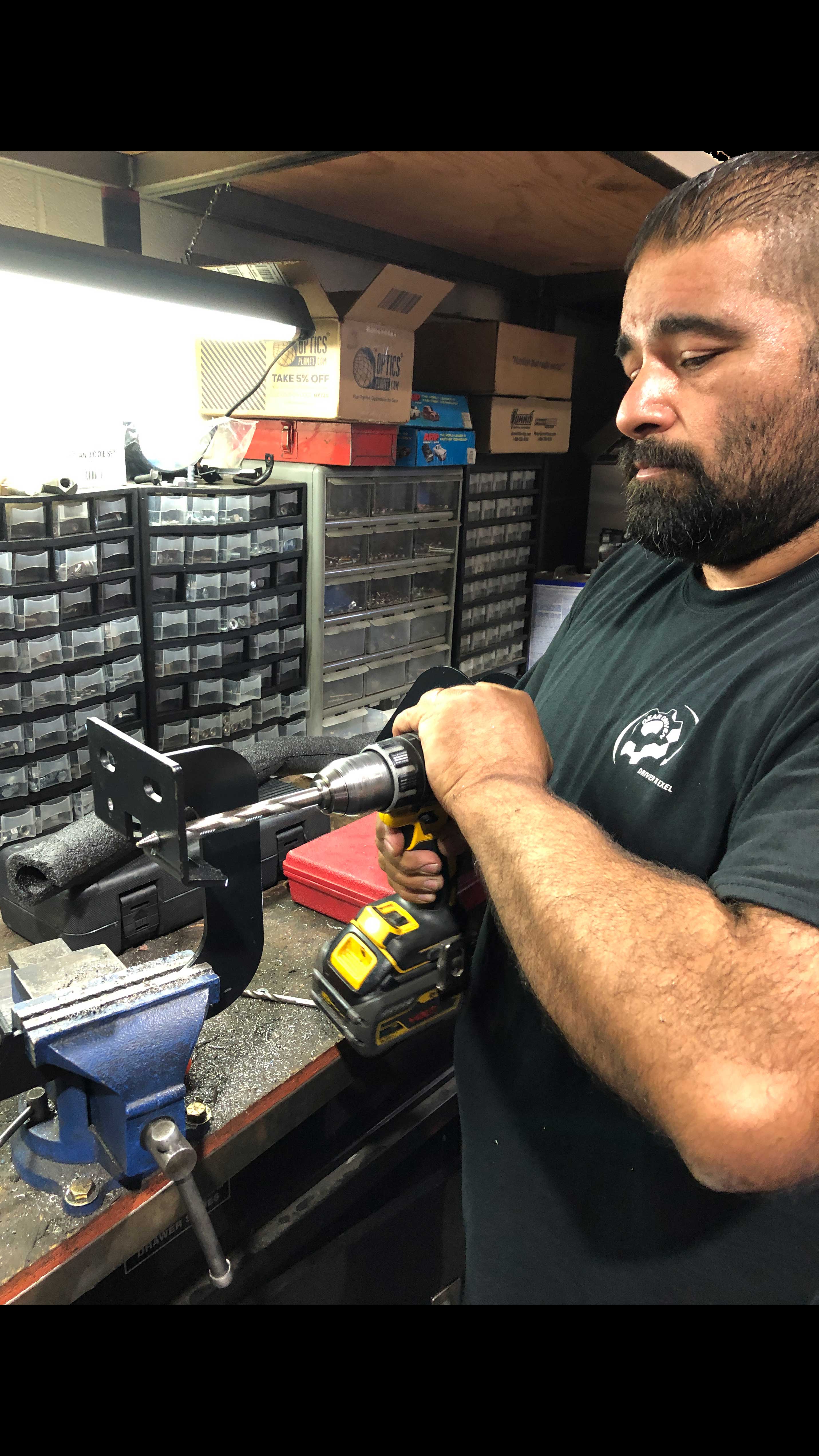 Universal kits typically need adjustments. After mock installing the rails to confirm position, Saul "The Surgeon" Gutierrez of Gear Driven Automotive makes additional holes in the mounting brackets.