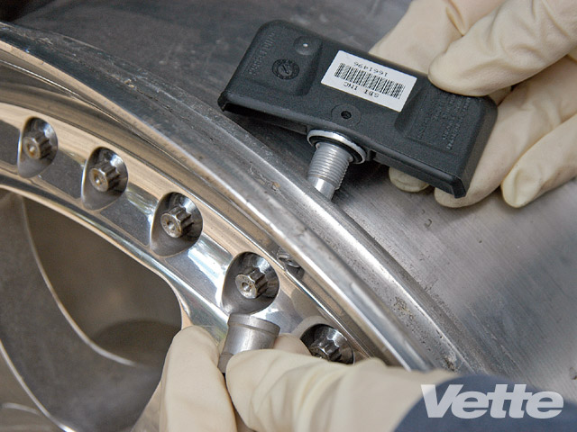 If you have an aftermarket wheel that will not accept your C5/C6's valve-stem-mounted wheel sensor, don't despair. The sensor can be mounted on the inside center of the wheel, similar to the C4 configuration. Some aftermarket companies, such as Forgeline, offer a bracket system if you don't want to use epoxy on your sensors.