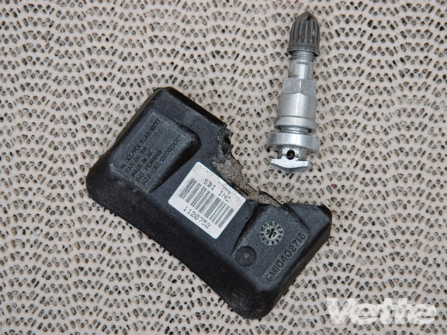 This sensor has been ruined by tire-mounting equipment. Be sure that your tire center has the correct equipment and is experienced with late-model Corvettes.