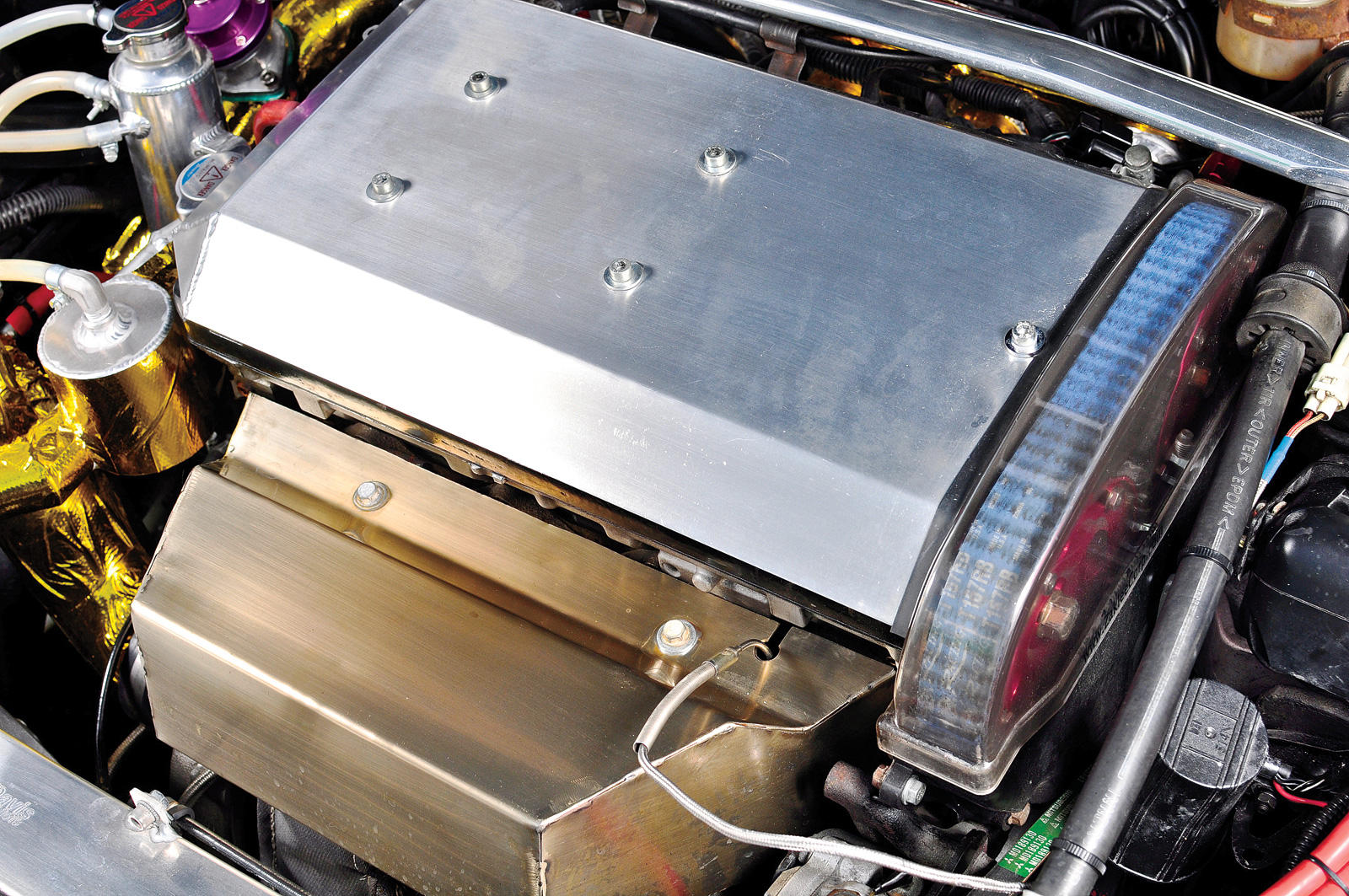 Engine ModificationsMagnus Motorsports 2.3L stroker short-block; Street intake manifold and heat barrier gasket; TEM ported/machined head with custom lightened valvetrain; Kiggly hydraulic lash adjuster pressure regulator; Forced Performance FP4R2 camshafts; FP3150 ball bearing turbo and race cast exhaust manifold; PtP turbo blanket; custom exhaust manifold heat shield; DEI Reflect-A-Gold-wrapped main water line, 2.5" intercooler piping, intake piping, and custom coolant swirl pot; Evo 3 oil filter housing; Fidanza cam gears; Fluidampr harmonic damper; Sparktech coil-on-plug ignition system; FIC 1,150cc fuel injectors; Bosch 044 fuel pump (fed by a DW300 in-tank lift pump); 034 Motorsports fuel surge tank; Boomba Racing 75mm Evo TB; Apexi Power intake air filter; custom Bell Intercoolers intercooler; custom Ron Davis dual-pass radiator w/ integrated oil cooler and custom ducting; GReddy coolant surge tank; NGR Type-S BOV; custom 3" O2 housing w/ internal 44mm Tial wastegate; custom 3" V-band SS exhaust; 3-quart Accusump; Avid Racing 90A billet motor mounts