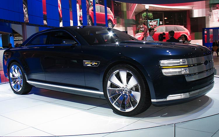 When rumors began swirling that Ford had begun development of a four-door Mustang, the automaker immediately jumped up and down and said it was not going there, ever. Mustang would remain a 2+2 coupe, now and forever, was the response from Dearborn. But that hasn't stopped Ford from using a stretched Mustang chassis as the basis for its new four-door Interceptor concept for the Detroit show. Underneath the Interceptor's clamshell shaker hood rests a 400 horsepower, 5.0-liter Ford Racing V-8 Cammer engine capable of running on E-85 ethanol. Like the Mustang it's based upon, the Interceptor Concept is rear drive and uses a six-speed gearbox. Design elements include a three-bar front grille, flush mounted door handles, a minimalist interior with opposing speedometer and tachometer needles and what Ford calls a 'squircle' (professionally square circles) theme for both the interior and exterior. Squircle? If you say so, Ford. Hidden audio and climate controls are incorporated inside the Interceptor along with headrests mounted on the roof instead of the seat.