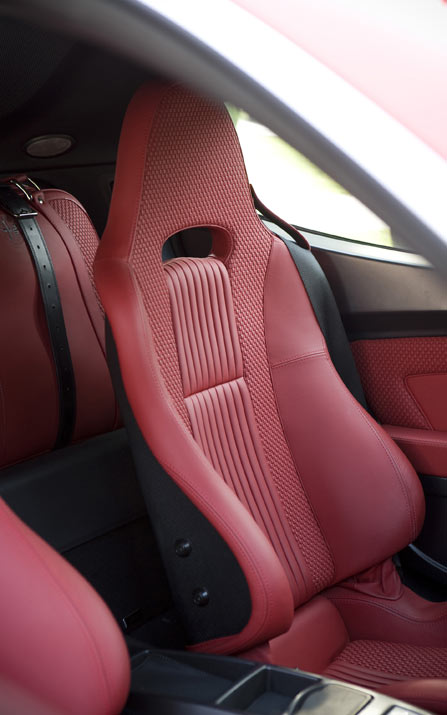 The 8C may borrow much of its DNA, but it feels unique. Engage the starter button on the carbon-fiber center console (save for some attractive aluminum trim and the leather seat coverings, nearly the entire cockpit is made of the stuff) and the V-8 bolts to life with a distinctive low baritone (thanks in part to high-angle valves and tuned silencers). Press the Sport button and butterflies in the exhaust open, expanding the timbre (Sport mode also increases the electronic throttle's responsiveness, cuts shift speed in half-to just 0.2 second-and loosens the reins of the electronic stability-control system). Nothing by Maserati or Ferrari sounds quite like this Alfa Romeo.