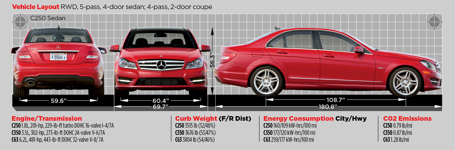 Fastest:(tie) Mercedes-Benz C63; CLS63 AMG: 0-60 mph 3.7; 3.8 sec, quarter mile 12.1;