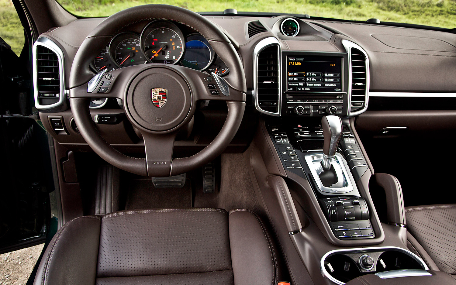 Another welcome but pricey addition was the $3980 air suspension with self-leveling height adjustment and Porsche's Active Suspension Management, which came in handy once the pavement met the dirt. "Good ground clearance even with the air suspension not raised all the way up," noted associate online editor Benson Kong. Off-road mode and hill descent control further prepped the Cayenne for dirt duty, with the switches located on the button-cluttered center driveline tunnel, which looks like something you'd find aboard the Starship Enterprise. Although button placement was logical, it took quite a bit of time getting used to, but the same can't be said about the paddle shifters, which were buttons located in an awkward position on the steering wheel instead of actual paddles on the back of the steering wheel where they should be.