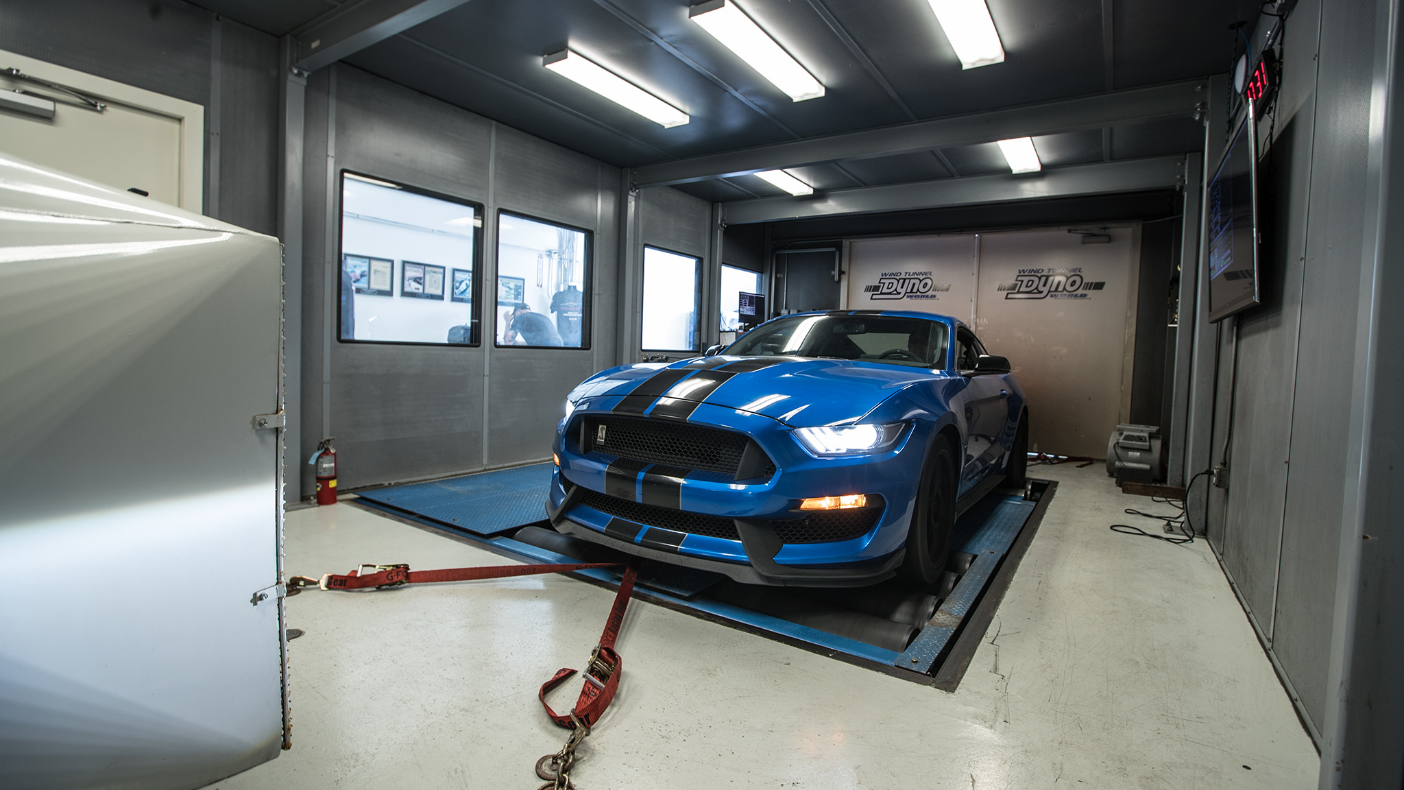 In the 2019 GT350 and GT350R, the Voodoo is rated at 526 horsepower and 429 lb-ft of torque at the crank. We decided to take the GT350 from our Best Driver's Car competition and strap it to a dyno to find out how much power it's making at the wheels. Drivetrain losses are exceedingly difficult to measure but we'll estimate a 15-percent loss between what the engine is producing at the crank and how much power makes it to the road. Based on Ford's numbers, we should be expecting a dyno readout of 447 hp and 366 lb-ft of torque at the wheels.