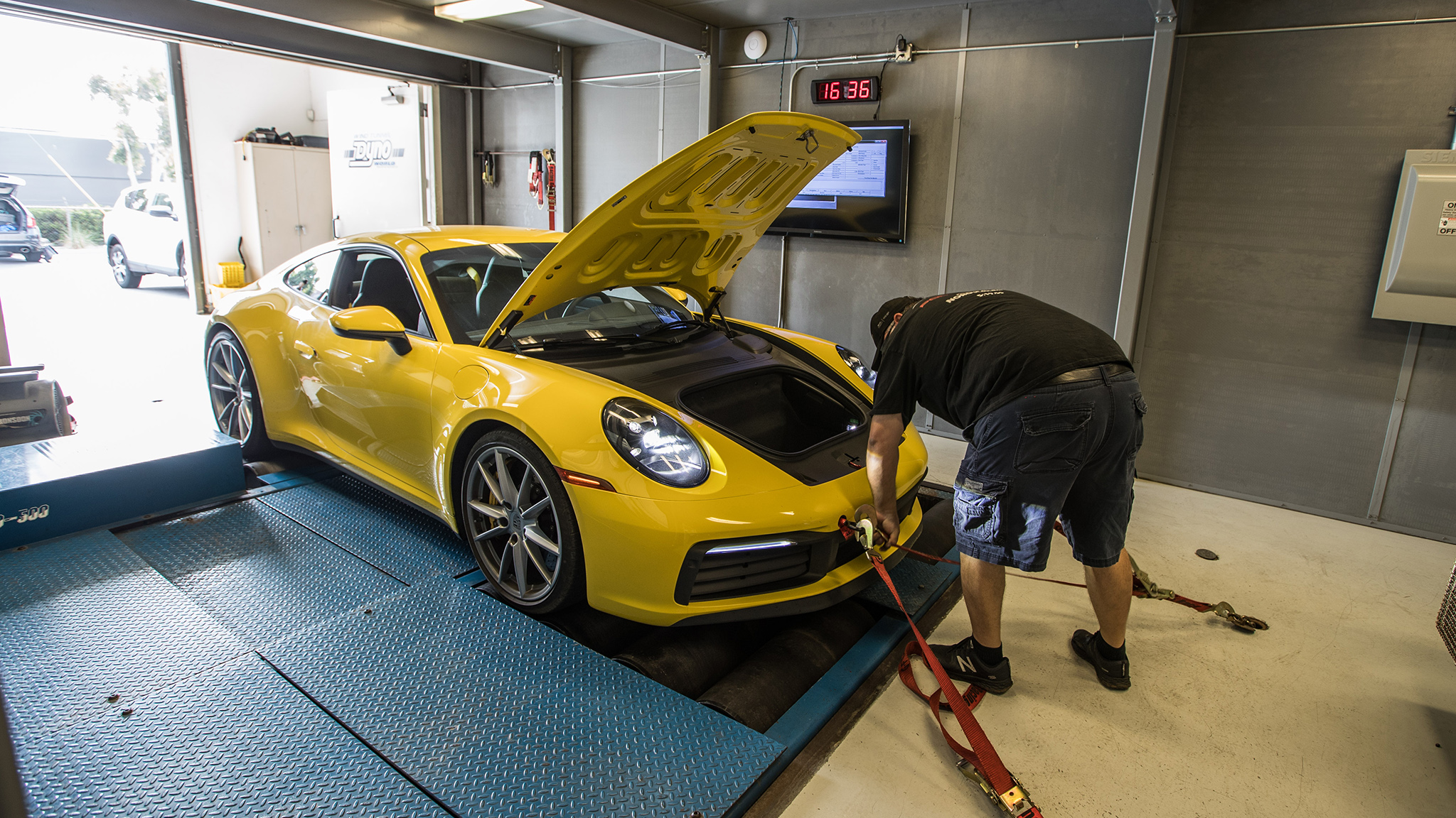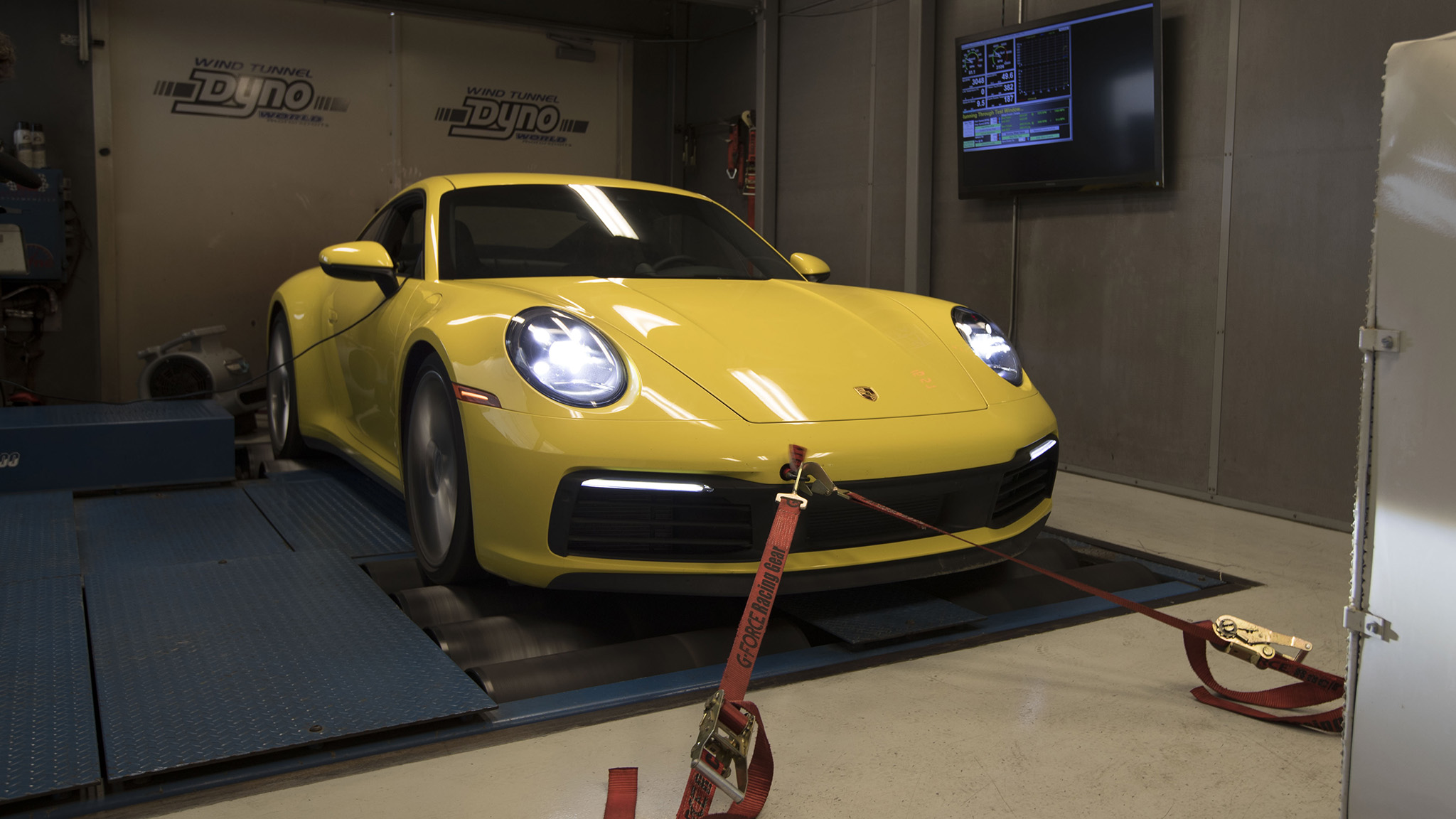 We took a Racing Yellow 2020 911 Carrera S to a dyno to find out. Porsche claims 443 hp and 390 lb-ft of torque from the twin-turbocharged 3.0-liter flat-six, but keep in mind, those numbers are rated at the crank. Those specs won't directly translate to the numbers this Porsche will put down on the dyno. A dynamometer measures how much power and torque make it to the ground, or in this case, the cylindrical drums on which the car is driving during dyno testing.