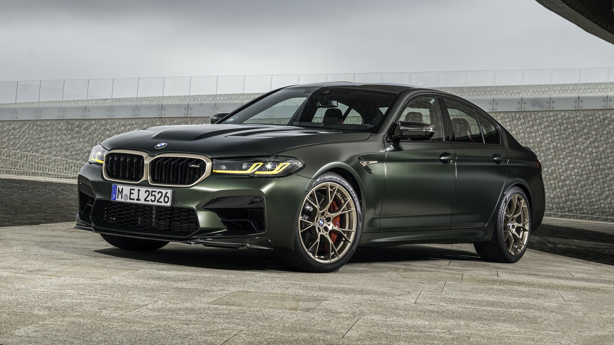 To achieve that weight reduction, BMW molds the M5 CS's hood, front splitter, rear diffuser, rear spoiler, and roof from CFRP. The hood itself features a power dome and vents, and in combination with the already aggressive front bumper, it gives the CS even more attitude than the "standard" M5. There's also less sound-deadening material throughout and the whole car is set off by a set of forged Gold Bronze 20-inch wheels.