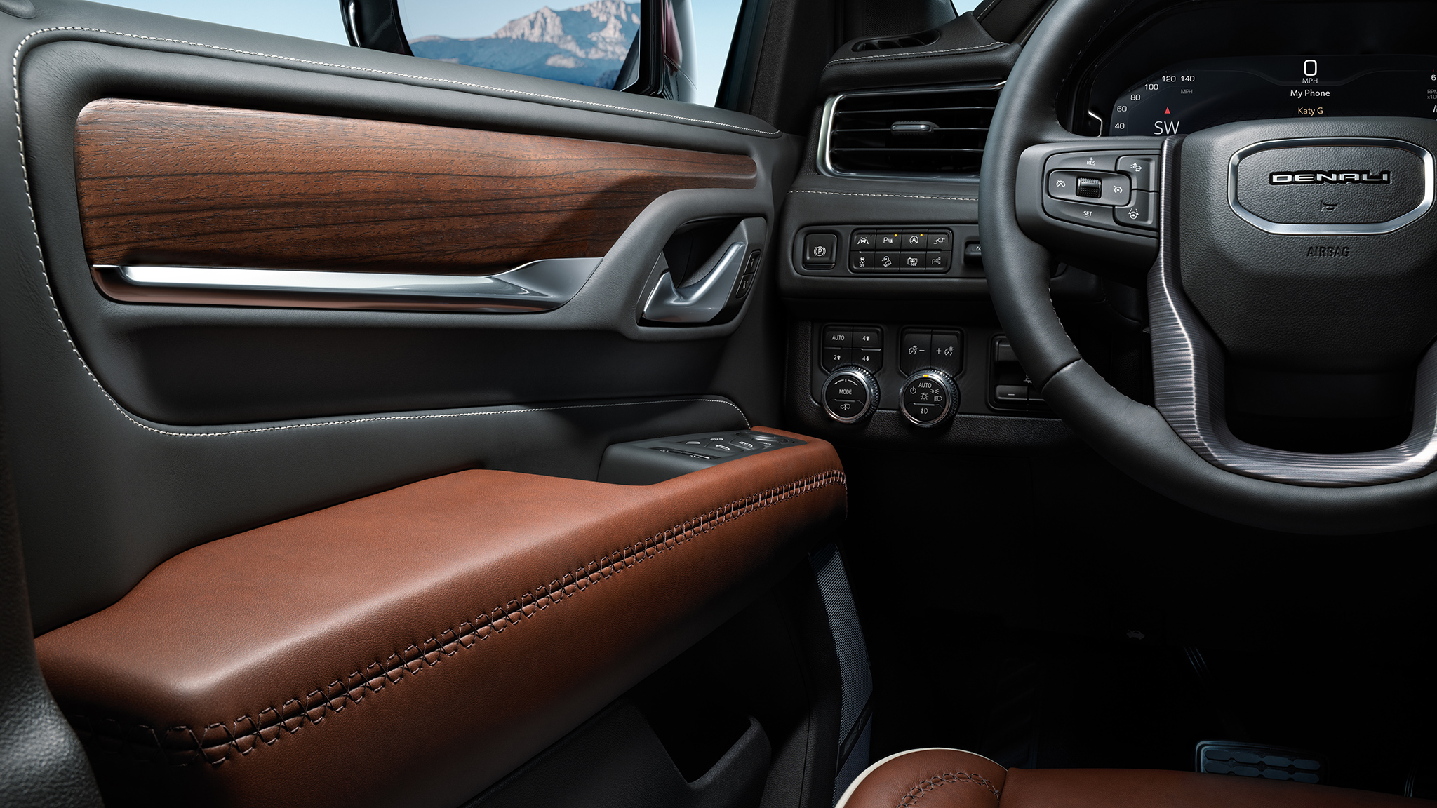 Moving to the inside, there's less plastic and more comfort than ever before. The Alpine Umber interior features full-grain leather seats, arm rests, and center console, capped by elaborate exclusive contrast stitching. The interior trim is a mixture of brushed aluminum and elegant open-pore Paldao woodgrain. A topographical map of Mount Denali is laser-etched into the glovebox of the woodgrain dash trim.