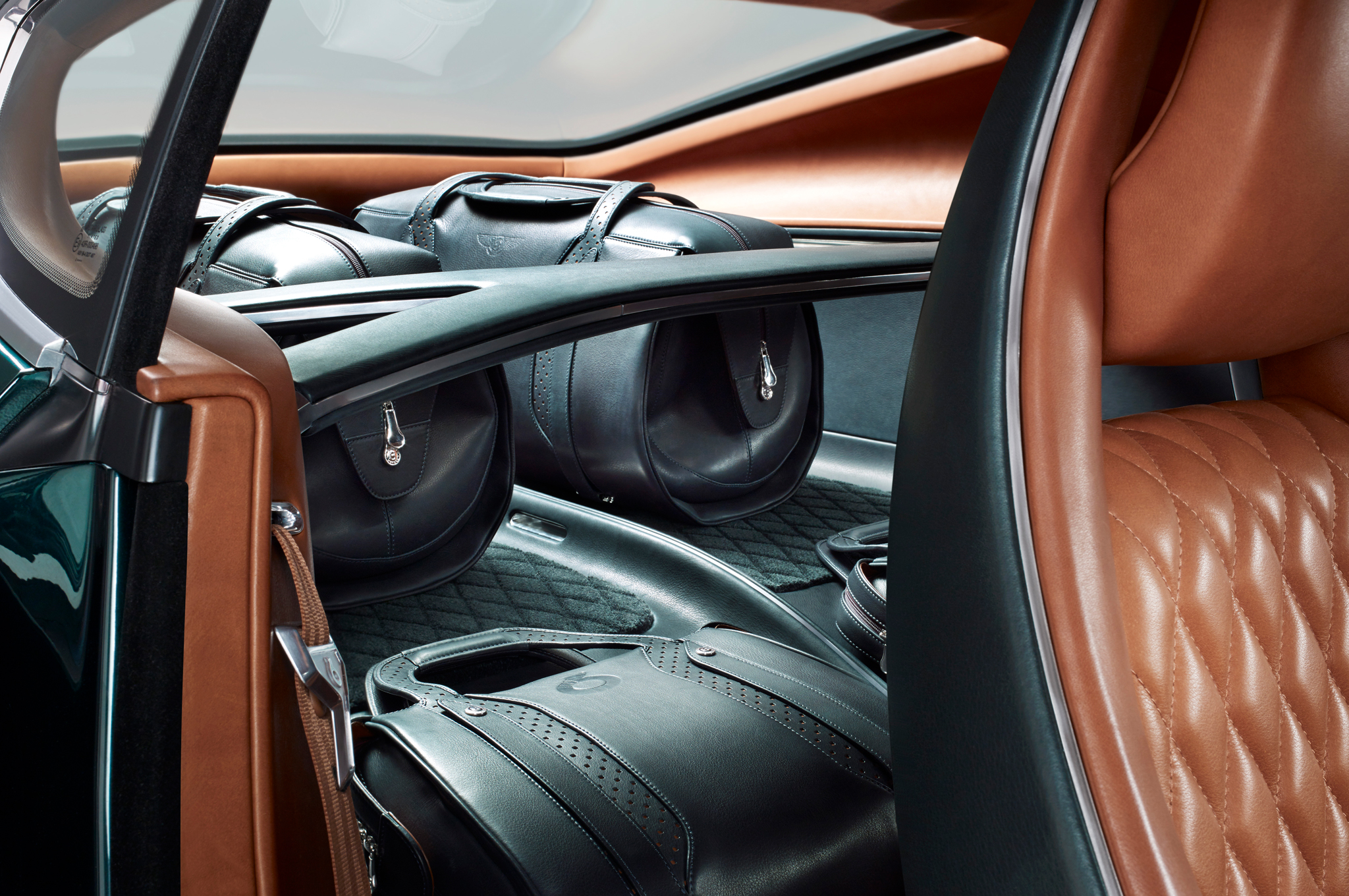 Inside, a curved vertical 12-inch touchscreen dominates the center stack that flows into a full-length center console. Copper, aluminum and steel accent the interior, including the vehicle controls, to create a two-metal 3D texture. Additionally, the door panels feature 3D quilting, milled into a solid straight-grain cherry wood. A combination of digital and mechanical gauges displays vehicle information. A custom-fit four-piece luggage set fits in the rear cargo area. The luggage is made from high-end Poltrona Frau leather.