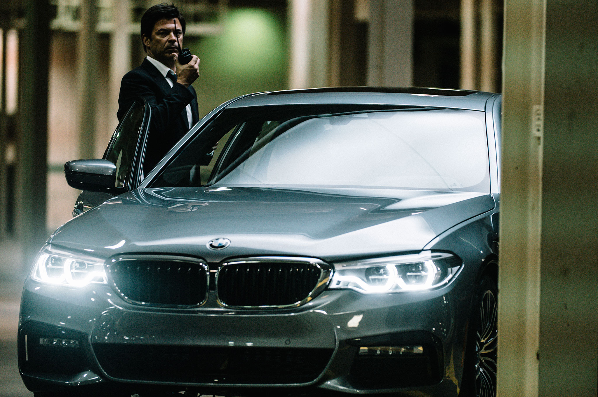 The two get into the car and a chase ensues. Whether it's because something rubs the driver the wrong way about Bernthal or he had ulterior motives the whole time, he veers off course and orders the mercenary out of the car. Now the 5 Series has to evade sniper fire from a helicopter, all while giving the camera glamorous close-up shots of the car's redesigned front end and letting the audience hear that turbocharged 3.0-liter straight-six at full song. The 540i might seem like a questionable choice for a getaway car, but the twin-turbo V-8-powered 550i isn't available at launch. That means the turbo-six's 335 hp and 332 lb-ft of torque will have to do for this big-budget product placement.