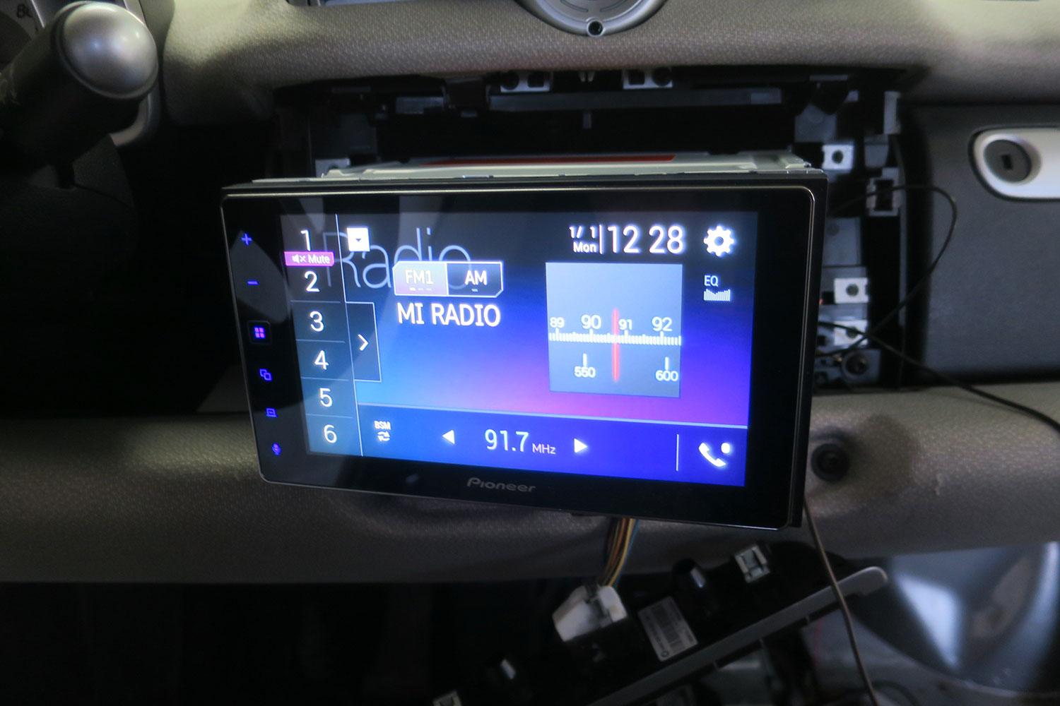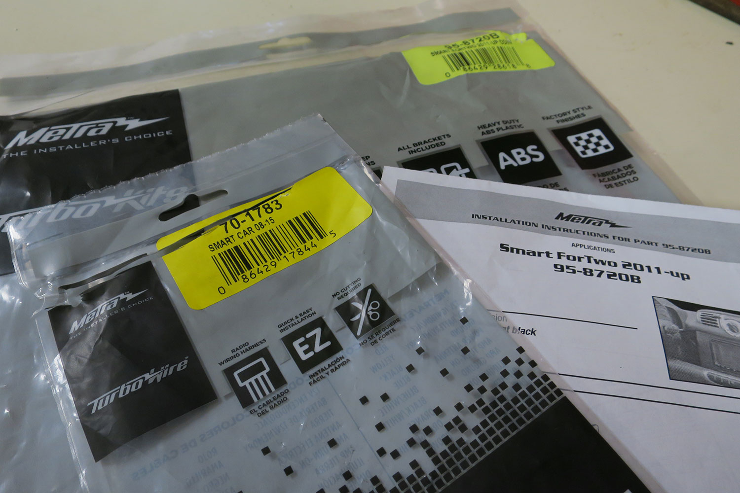 Weeks later at the 2018 Consumer Electronics Show, I discovered a new entry-level stereo on the lavish Pioneer stand featuring Apple CarPlay, Android Auto, and rearview camera compatibility, with a big, bright, high-def 6.2-inch capacitive-touch screen. Priced at $349 on popular catalogue sites, it's not the cheapest way to get these features. A Korean-made Dual brand unit at Walmart sells for $184 and matches most features with a bit more power output than the Thai-manufactured Pioneer (240 watts versus 200), but the Dual lacks an Aux-jack input—still a useful feature for connecting the oldest devices like a Walkman, Discman, vintage iPod, or our portable SiriusXM player. So I ordered a Pioneer MVH-1400NEX head unit, a Pioneer ND-BC8 rear-view camera ($100), and the requisite installation kits to adapt the head unit to the dash and to the stereo's wiring and antenna to the Smart's wiring (sites like Crutchfield.com sell these separately for $15, $13, and $8 but they typically throw them in for free when purchasing the stereo).