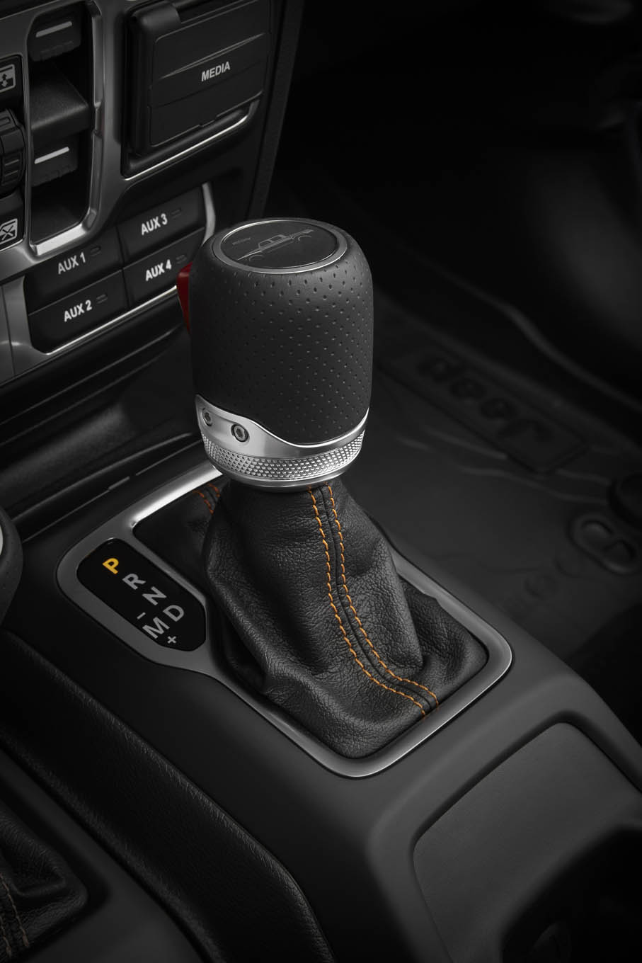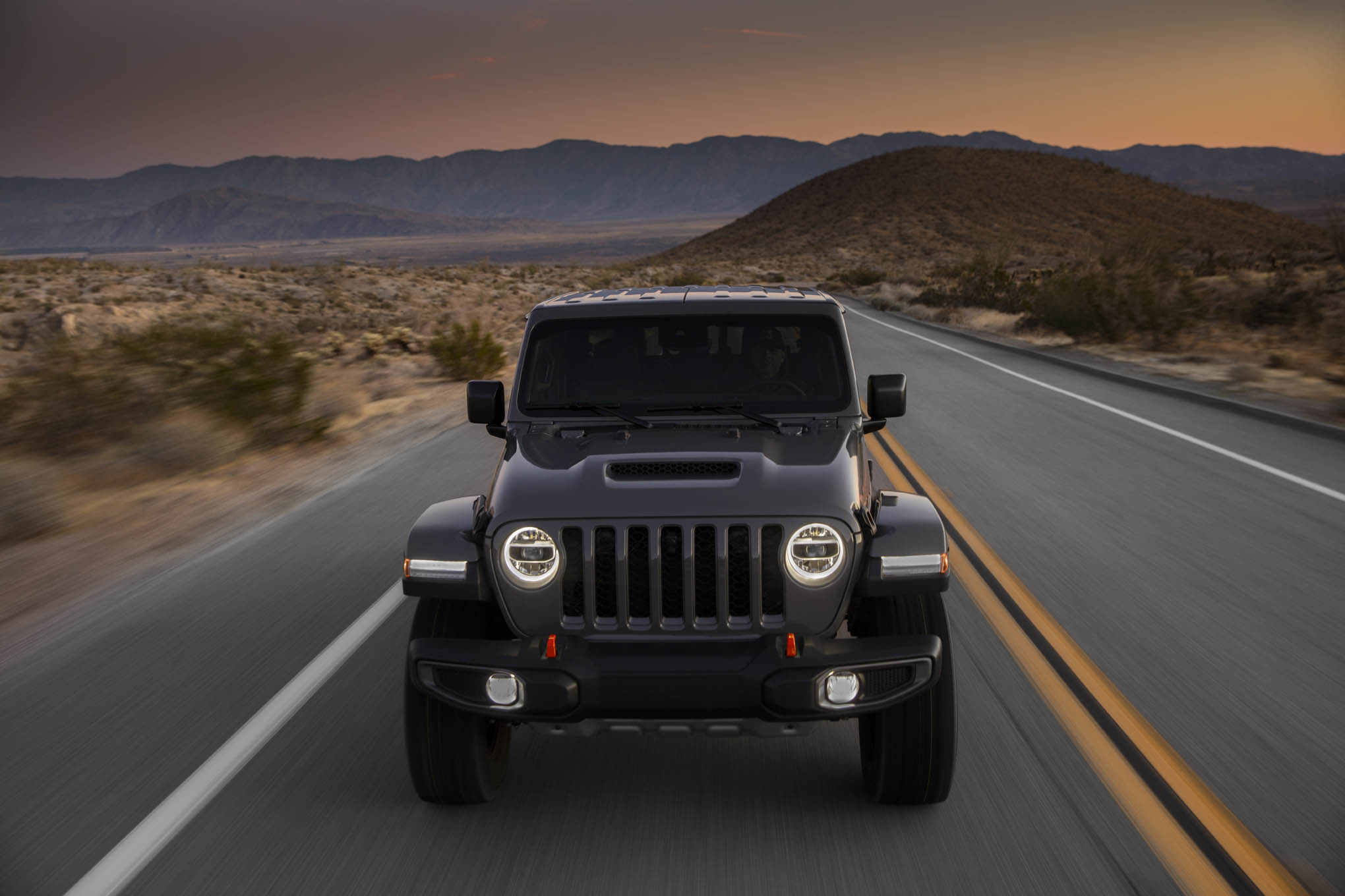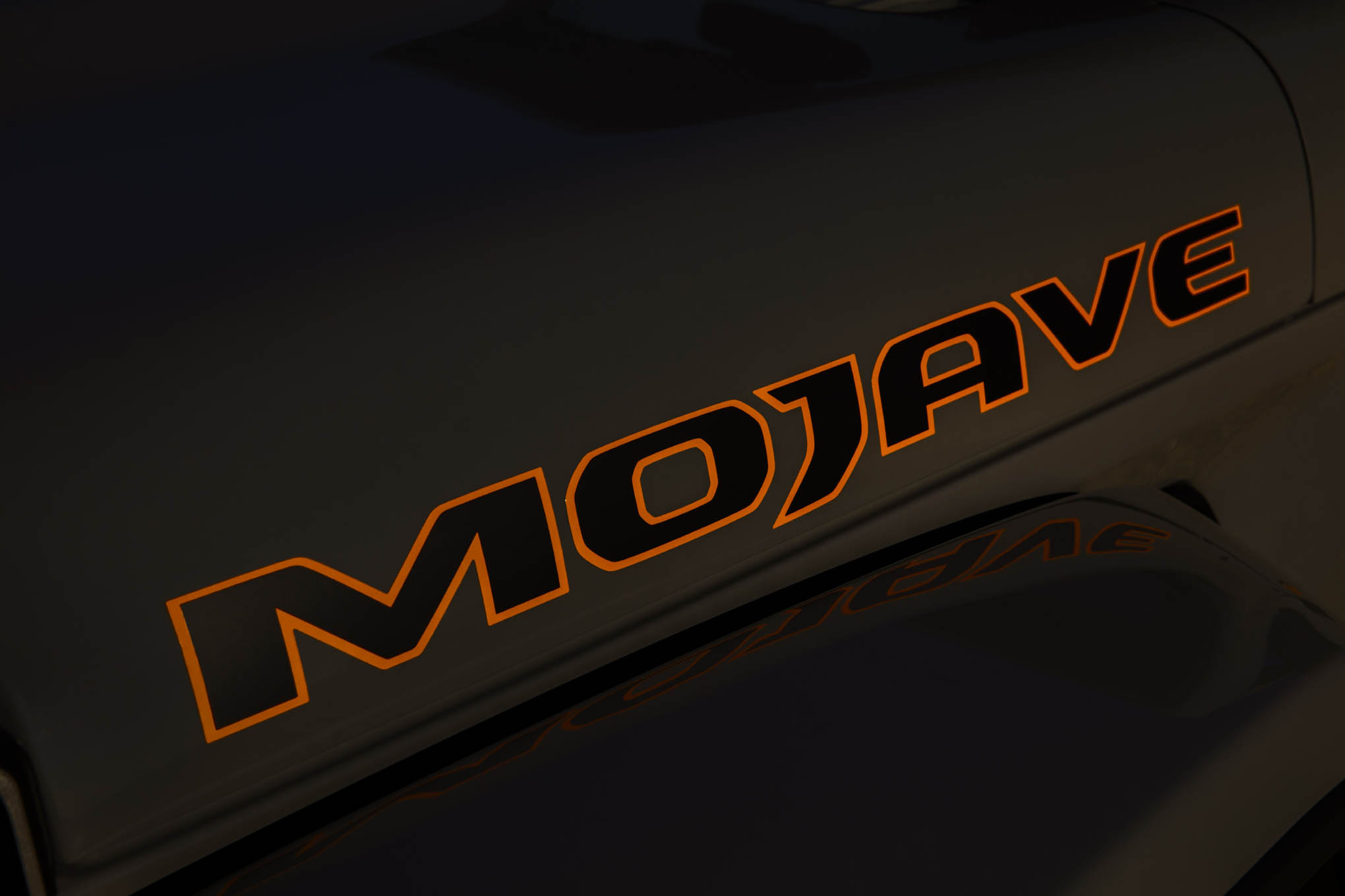 From a simple first glance, it's apparent that Mojave features some identifying styling that will run through the line as other Jeep models perhaps earn the Mojave's new Desert Rated badge. Just as Rubicon made red tow hooks, optional all-steel winch-ready bumpers synonymous with the model, Mojave has its own list of tricks and treats. For starters, in addition to the aforementioned Desert Rated badging, Mojave features special orange-colored tow hooks and orange accents throughout. A special hood (which looks an awful lot like a euro-spec diesel JL hood with a non-functioning vent stuck in it) is standard on Mojave, as are steel Sand Slider steel rocker guards, special cloth or leather seats with orange stitching and deep upper side bolsters to keep you planted during hard maneuvering, special "racing grips" embedded in the steering wheel, and your choice of Black or Steel Gray interior colors. Unlike Rubicon, the all-steel bumpers aren't an option, but Mojave does come standard with the "Max Tow" cooling package that features a larger fan for cooler engine temps when punishing the Gladiator Mojave off-road in the summer.