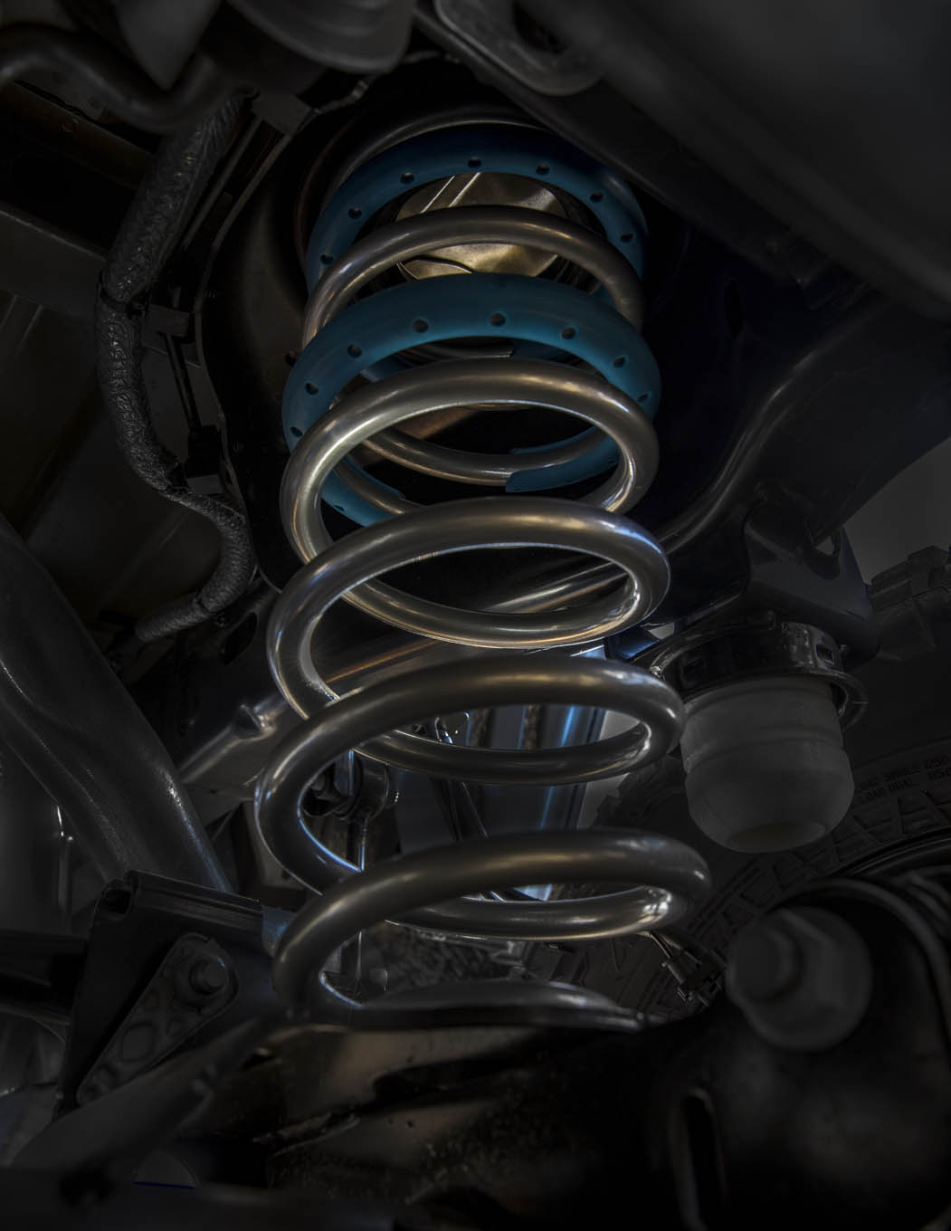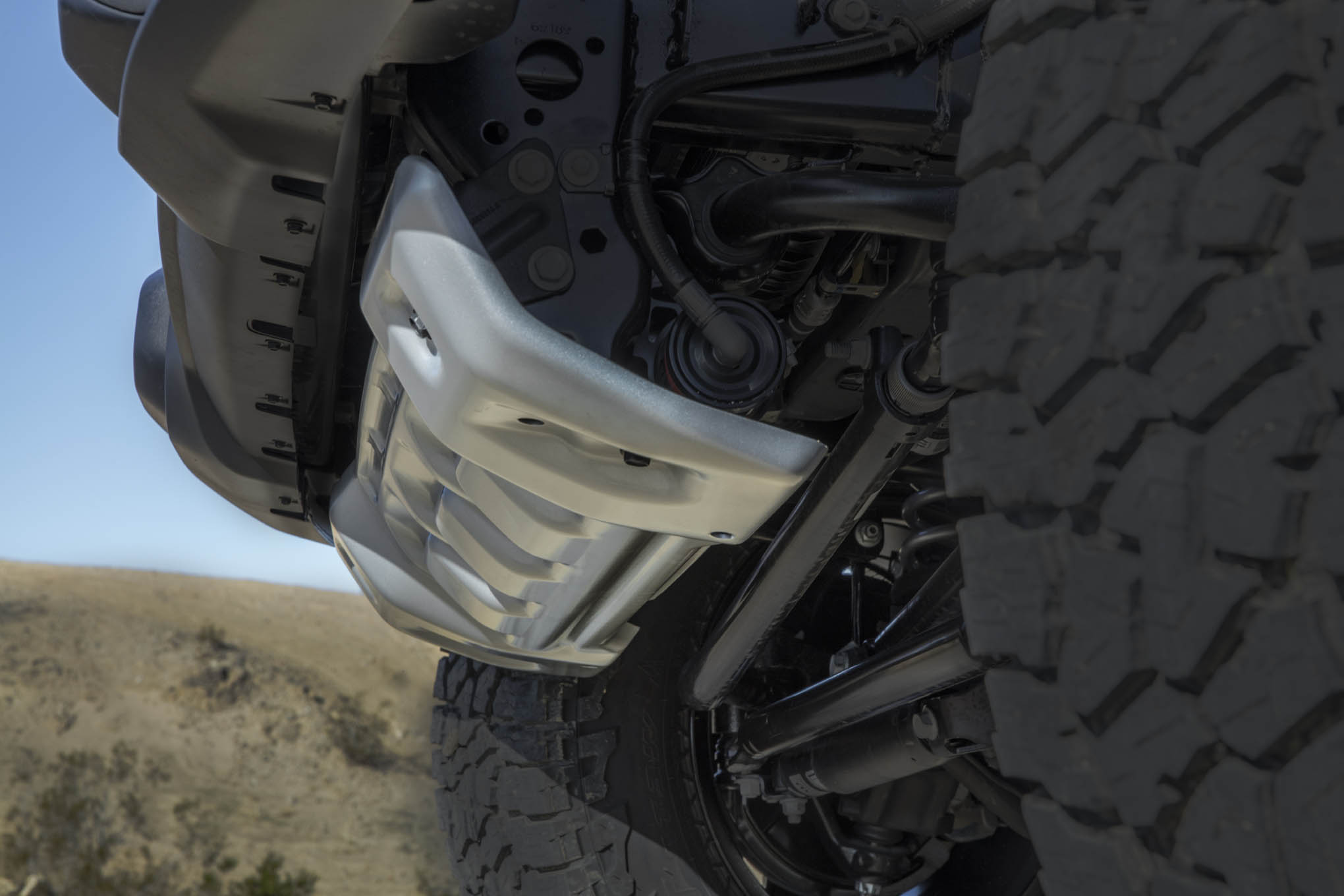 The Jeep Gladiator Mojave package represents the highwater mark of Jeep suspensions to date. While the Rubicon package employs specially tuned springs and monotube Fox shocks front and rear, the Mojave ups the ante, literally. Mojave features a different spring rate than Rubicon, resulting in Mojave sitting 1-inch taller. The extra lift is thanks to the need for more uptravel before the suspension bottoms during hard running off-road and the spring's tuning to complement the Fox shocks. The shocks are specially designed Fox 2.5-inch internal bypass units with remote reservoirs that mount behind the front bumper under a special silver skidplate. In lieu of the standard foam cell jounce bumpers found on the Rubicon, the front of the Mojave package features Fox hydraulic jounce bumpers. We asked specifically and yes, they are hydraulic bumps, not air bumps. The Fox hydraulic bump shafts are protected by a rubbery sleeve to prevent rock, sand, and chip damage. Out back, internal bypass Fox 2.5-inch shocks with external piggyback reservoirs pull damping duties and a reformulated foam jounce bumpers with increased impact handling characteristics compared with Rubicon's rear jounce bumpers the axle from crashing into the frame. As with all bypass shock designs, the internal bypass Fox 2.5-inch shocks allow for a smooth, comfortable ride in small-chatter, low-impact situations on- and off-road, while still being able to ramp up damping force to handle hard hits and landings. The external bypass cans allow increased fluid capacity and aid in shock cooling for fade-free performance in extreme conditions. And finally, where Rubicon package features an electronic-disconnect front swaybar, the Mojave swaybar is fixed and not able to be disconnected.