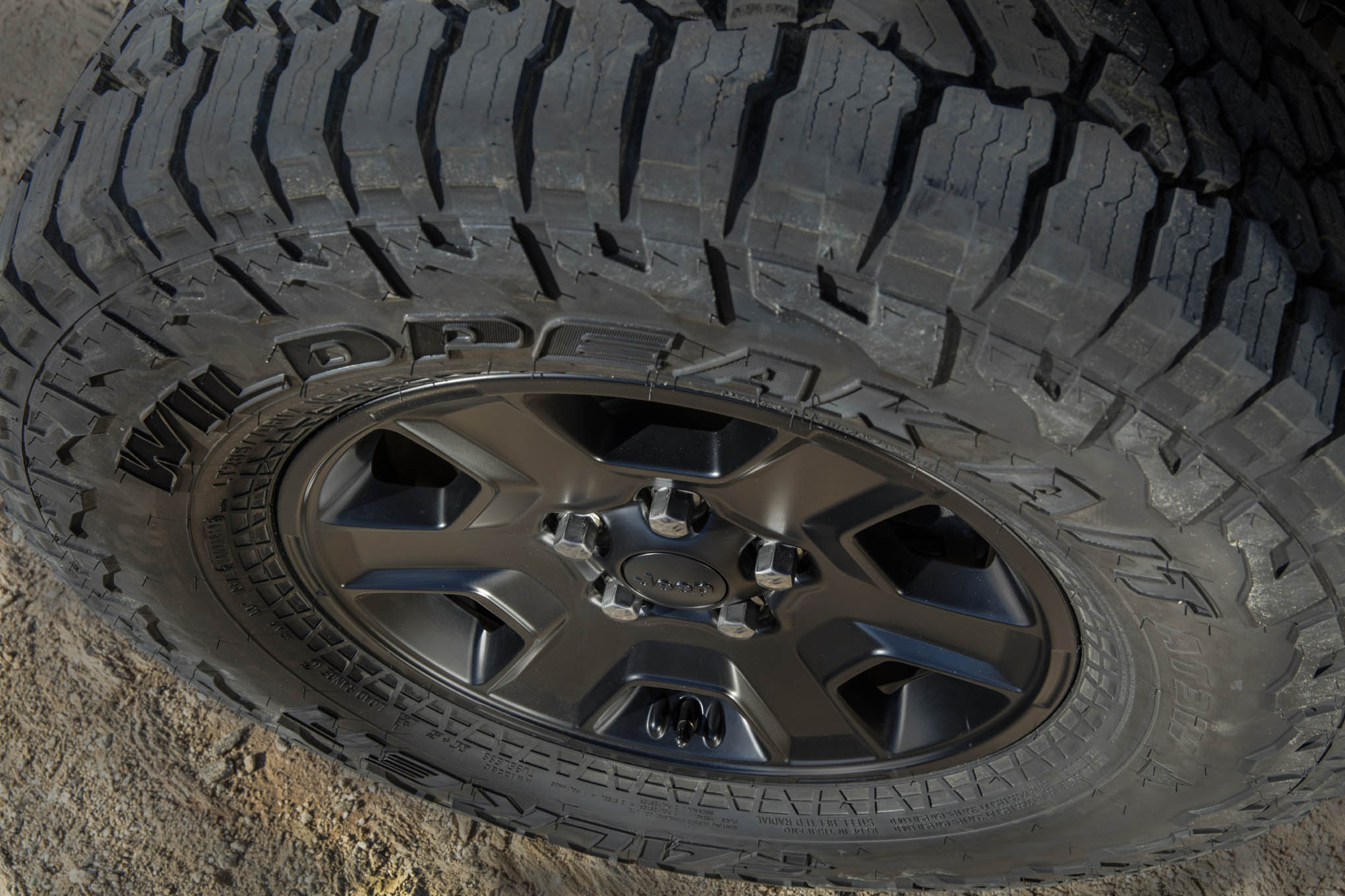 Mojave and Rubicon Gladiator packages both come standard with 33-inch 285/70R17 Falken Wildpeak A/T tires or optional 285/70R15 Falken Wildpeak M/T tires. However, where the Rubicon features 17x7.5 Rubicon-specific polished/painted Granite Crystal wheels standard or 17x7.5 Rubicon-specific polished/painted Mid-gloss Black wheels as an option, the Mojave wheels feature a special 7.5mm-shallower backspacing that punches the wheelbase out 15mm wider than Rubicon. The -inch wider track provides needed clearance for the front shock package, helps Gladiator Mojave's stability off-roading at speed, and just looks more aesthetically pleasing with the 1-inch-taller suspension. Color-wise, the Mojave wheels come standard in Low Gloss Black color or an optional polished/painted Low Gloss Black finish.