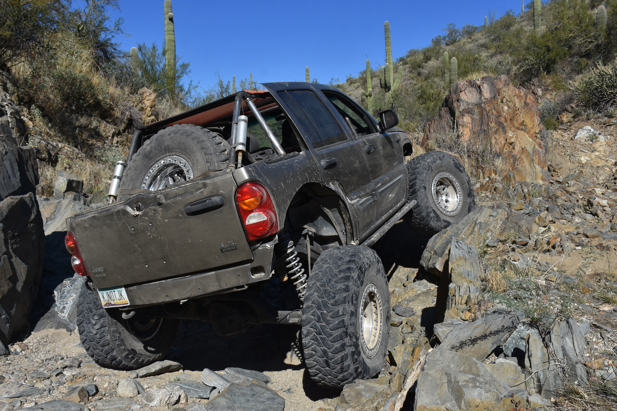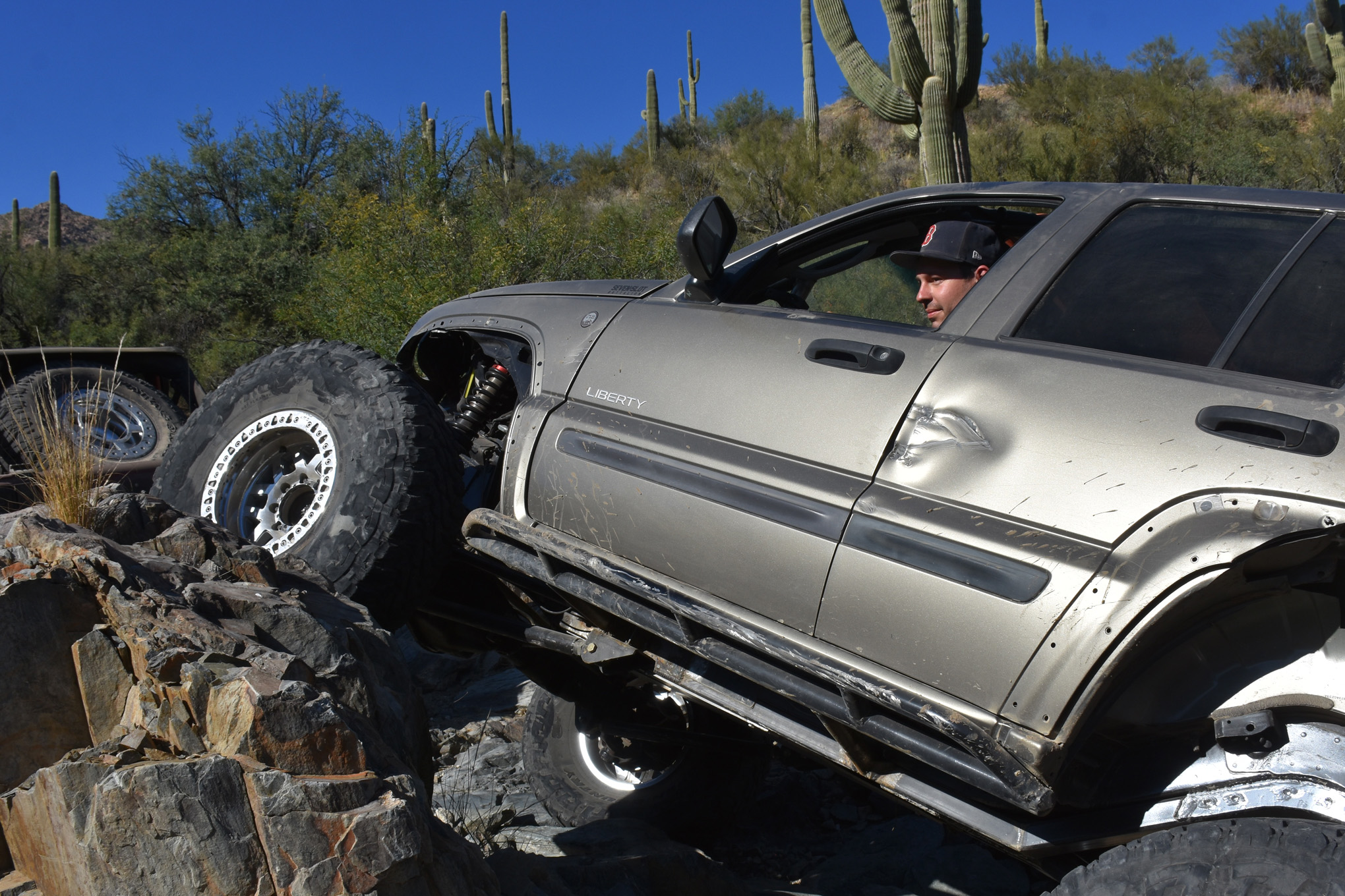 Up front, a 1999 Dodge Ram 2500 Dana 60 is held in place with a three link that Max and his pals engineered. The axle holds 5.38:1 gears on Yukon Zip Locker and Yukon chromoly 35-spline inner axles and 33-spline chromoly stubs from Letzroll Offroad in Mesa, Arizona. The axle has large unit-bearings and lacks locking hubs, but that seems to work well for Max. The rear axle is a 1999 Dodge Dana 60 with like gears and another Zip Locker, Yukon chromoly 35-spline axles and is located under the Liberty with a double triangulated four-link that Max says he researched while web wheeling. The boing and flex of the suspension is controlled by 14-inch travel 2.5 Sway-a-Way remote reservoir shocks up front and 16-inch 2.5 remote reservoir Kings. All of the suspension, including the link ends and shock mounts, are tied to a mild steel tubing and plate-constructed subframe built by Max and his friends. The subframe is then grafted to the Liberty's unibody pseudo frame all the way under the body. The roll cage is also tied into the unibody and subframe.