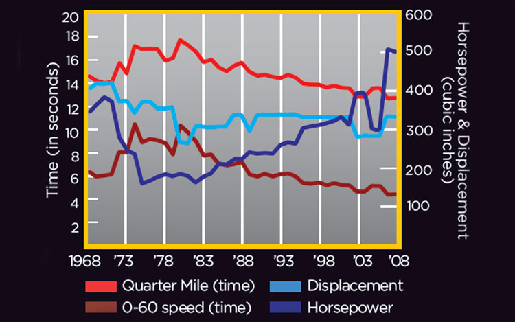 DeJa VuWe've been here before. At the dawn of the 1970s, an escalating horsepower war peaked with big blocks and 400-plus-horsepower claims. Then the industry was hit with a double-whammy: tightening emissions regulations and the 1973 oil embargo. Hydrocarbon and carbon-monoxide emissions were tightened for 1972 (along with NOX in California), and the automakers lowered compression to comply. Providing a fig leaf of sorts, in 1972 SAE began requiring exhaust and accessory systems to be installed during performance measurements, a change that lowered SAE gross figures by about 20 percent. The three-way catalytic converter arrived in 1975 and drastically cut emissions, but until precise fuel metering arrived in the 1980s, engine output remained anemic. Today's vast computing power enables advances in technology and science that give engineers more options for improving performance and fuel economy. Peak power may again decline, but weight will too and any drop in performance should be far milder.