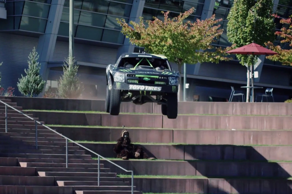 Racer BJ Baldwin chases Bruce the Sasquatch.