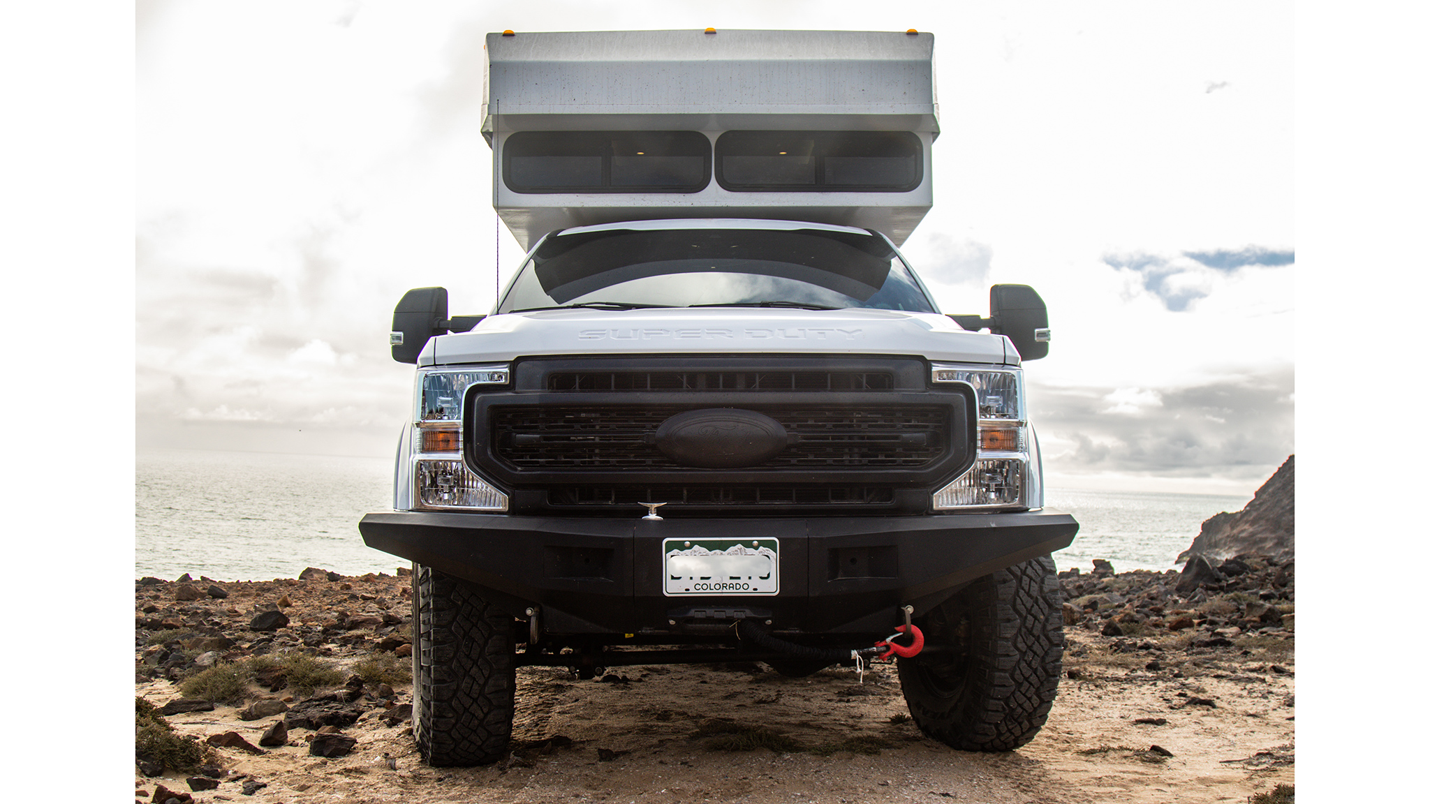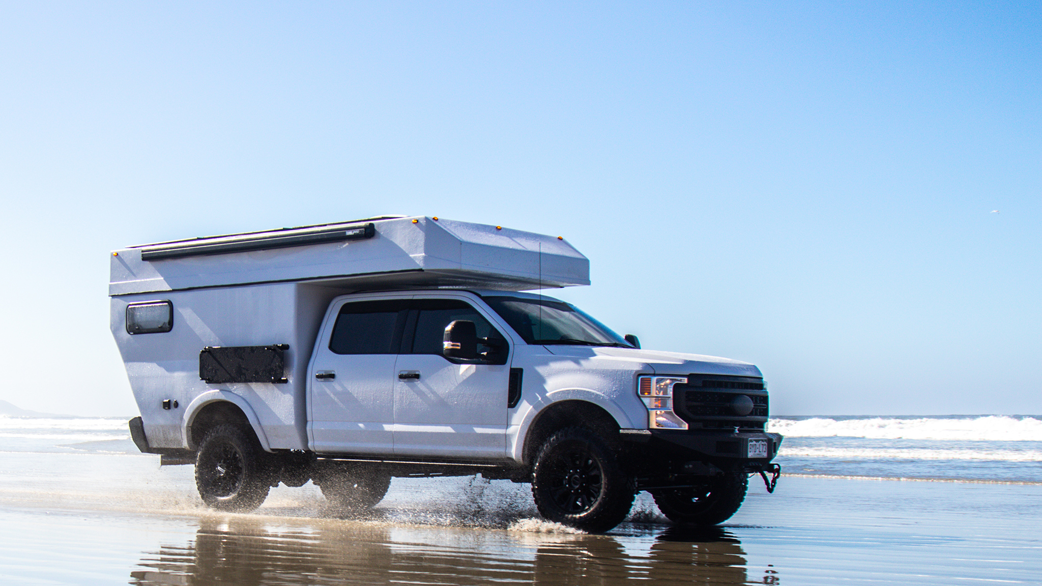 The custom composite Baja truck camper shell is inlaid with a Baja Designs LED light bar. Electric actuators control the rear door, while a 400-watt Zamp solar setup, customizable exterior rear storage racks, a Fiamma awning, and a custom MAXTRAX table mount round out some of the exterior highlights.