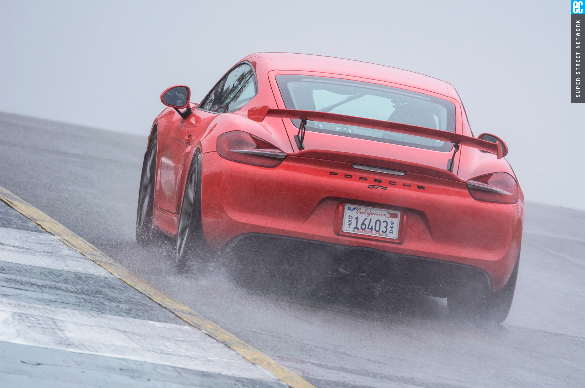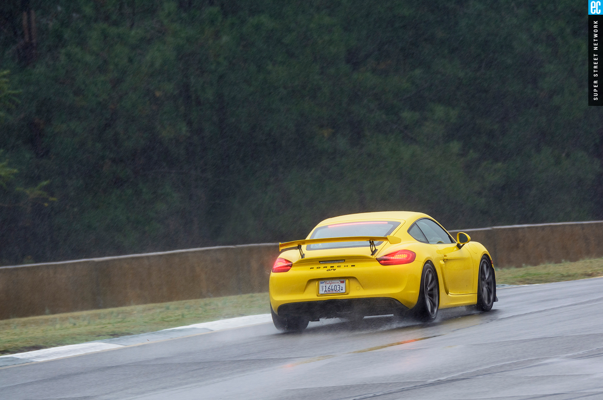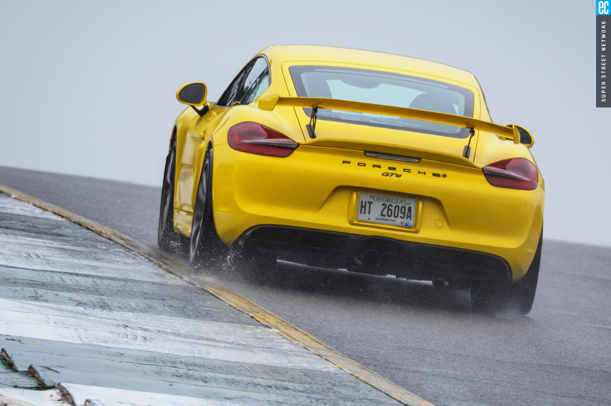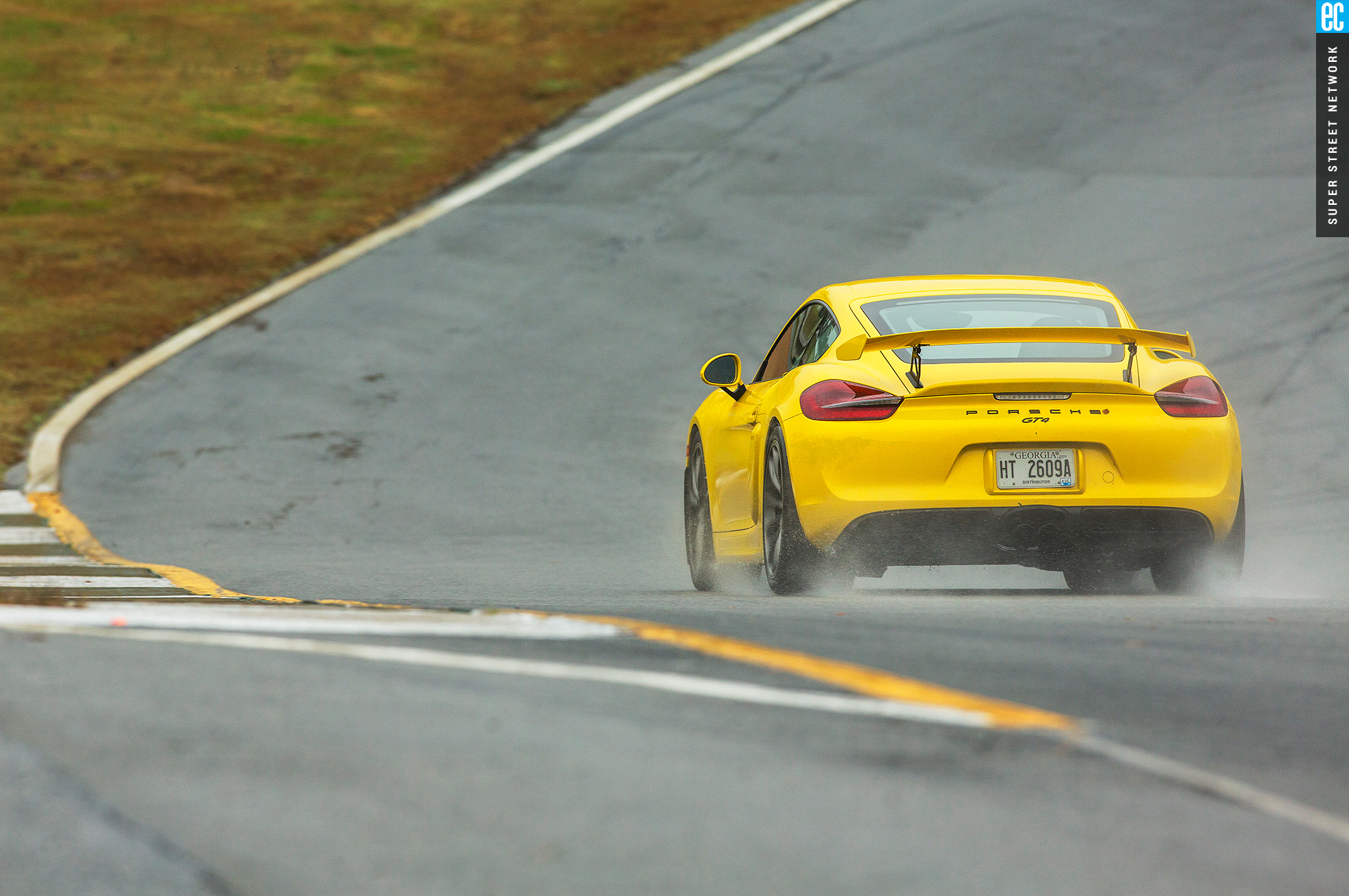 The front suspension of the GT4 was lifted straight from a 911 GT3 with the two-piece lower control arms, adjustable antiroll bars, and even the brakes. It is as accurate here as on its original home, maybe more so with the GT4's weight balance. The conditions at Road Atlanta ranged from almost completely dry to "I'm pretty sure there's a track under all this water." In all but the wettest of conditions, the front gives good feedback; when it stopped, that meant there was no feedback to be had since the tires had turned to flat-bottom boats. It still doesn't shake and kick like an old air-cooled car's steering—go buy a 914 if you want that—but you still know when it's loading up, when it's going to let go, and if you can push harder, and ultimately that's all that matters.