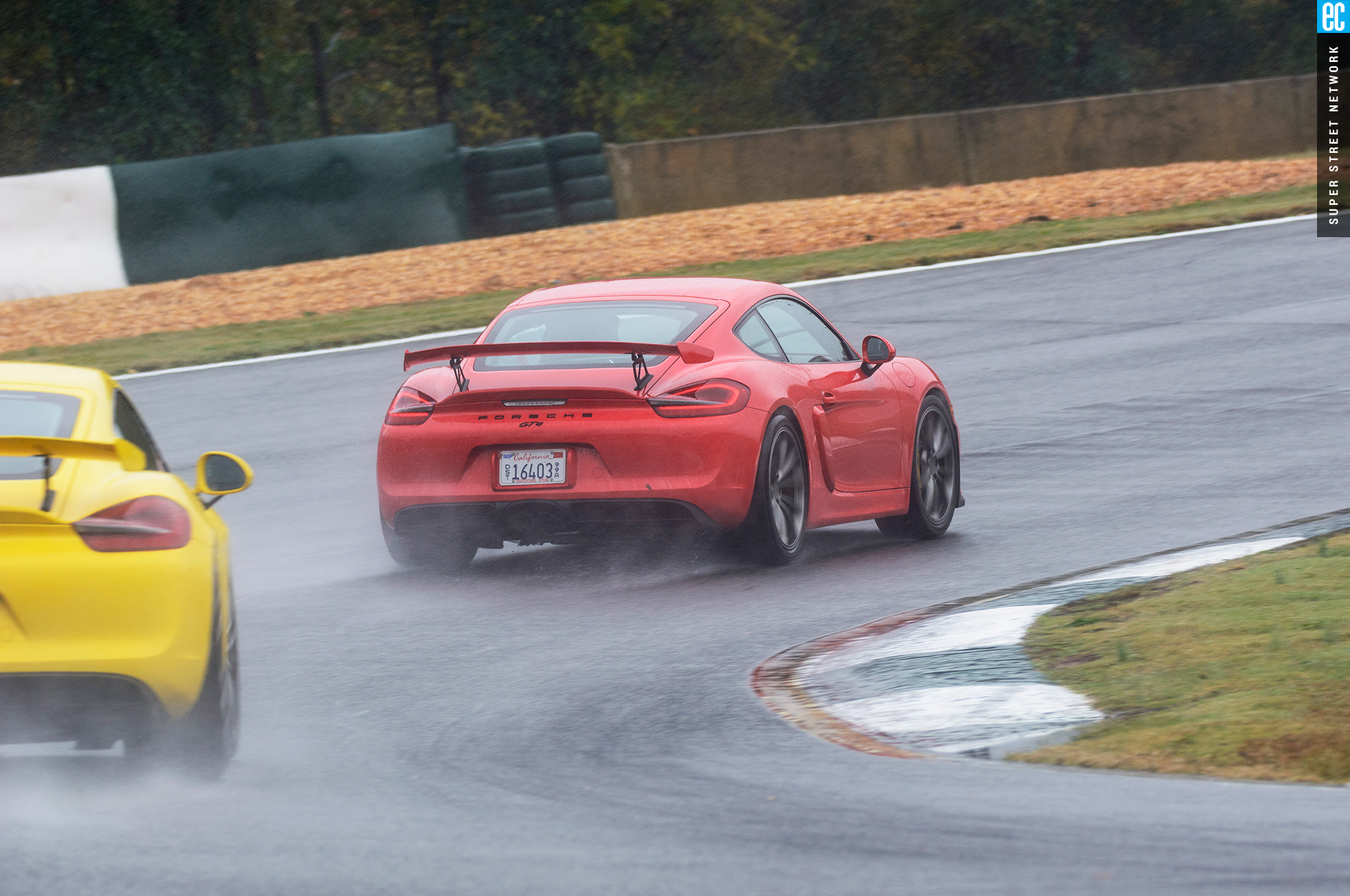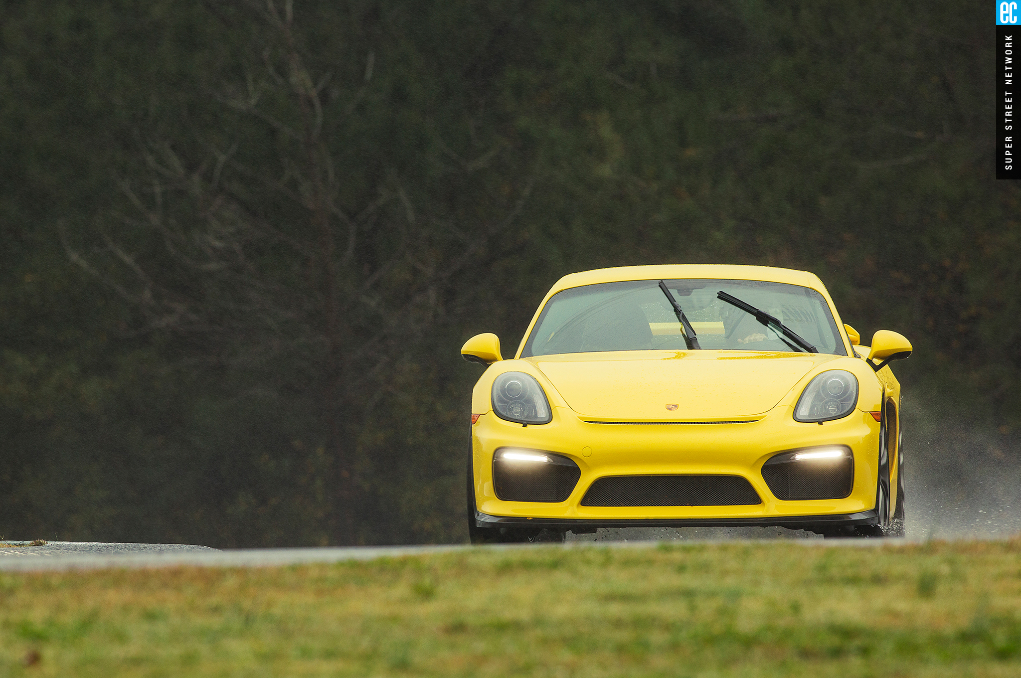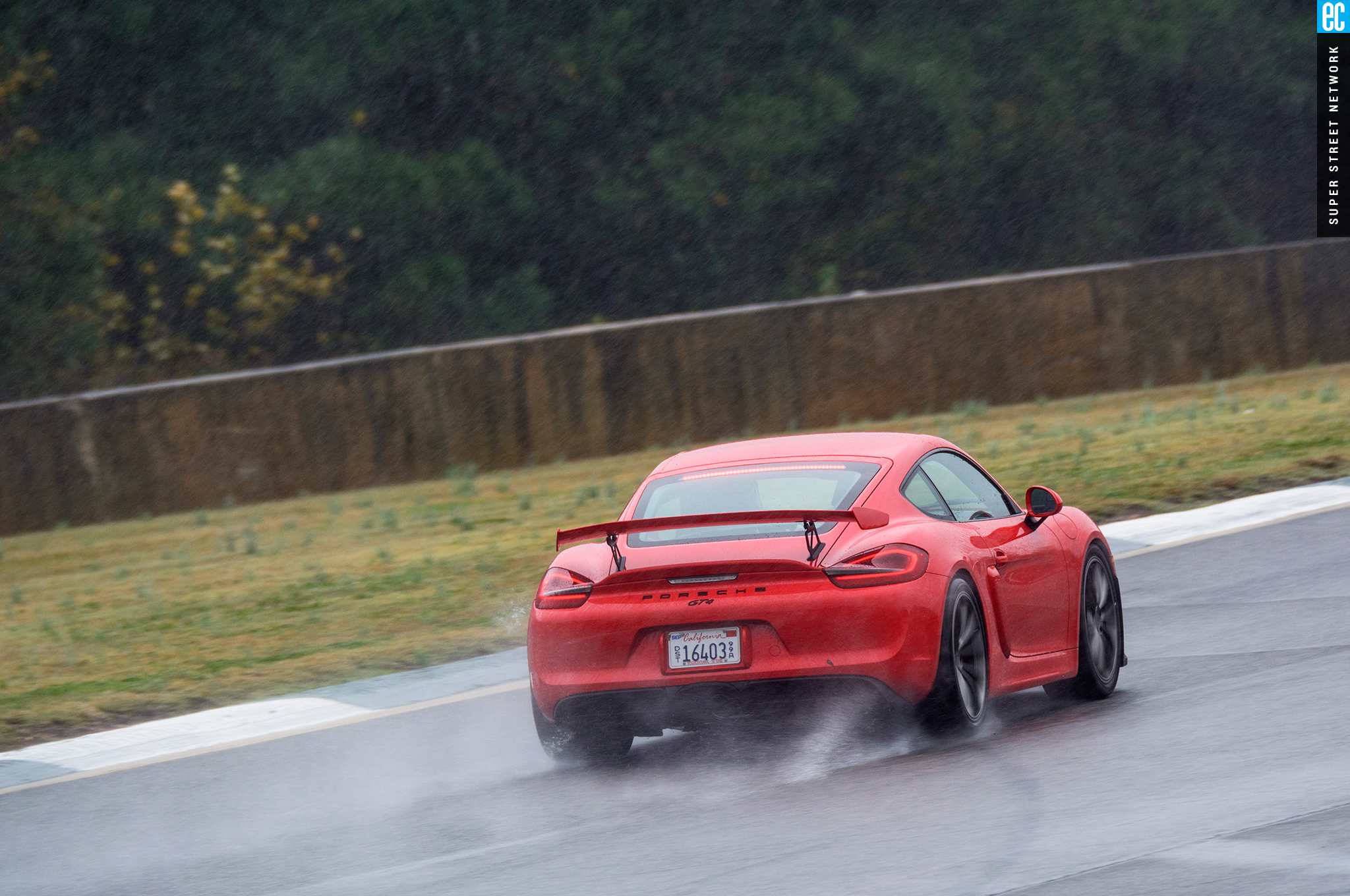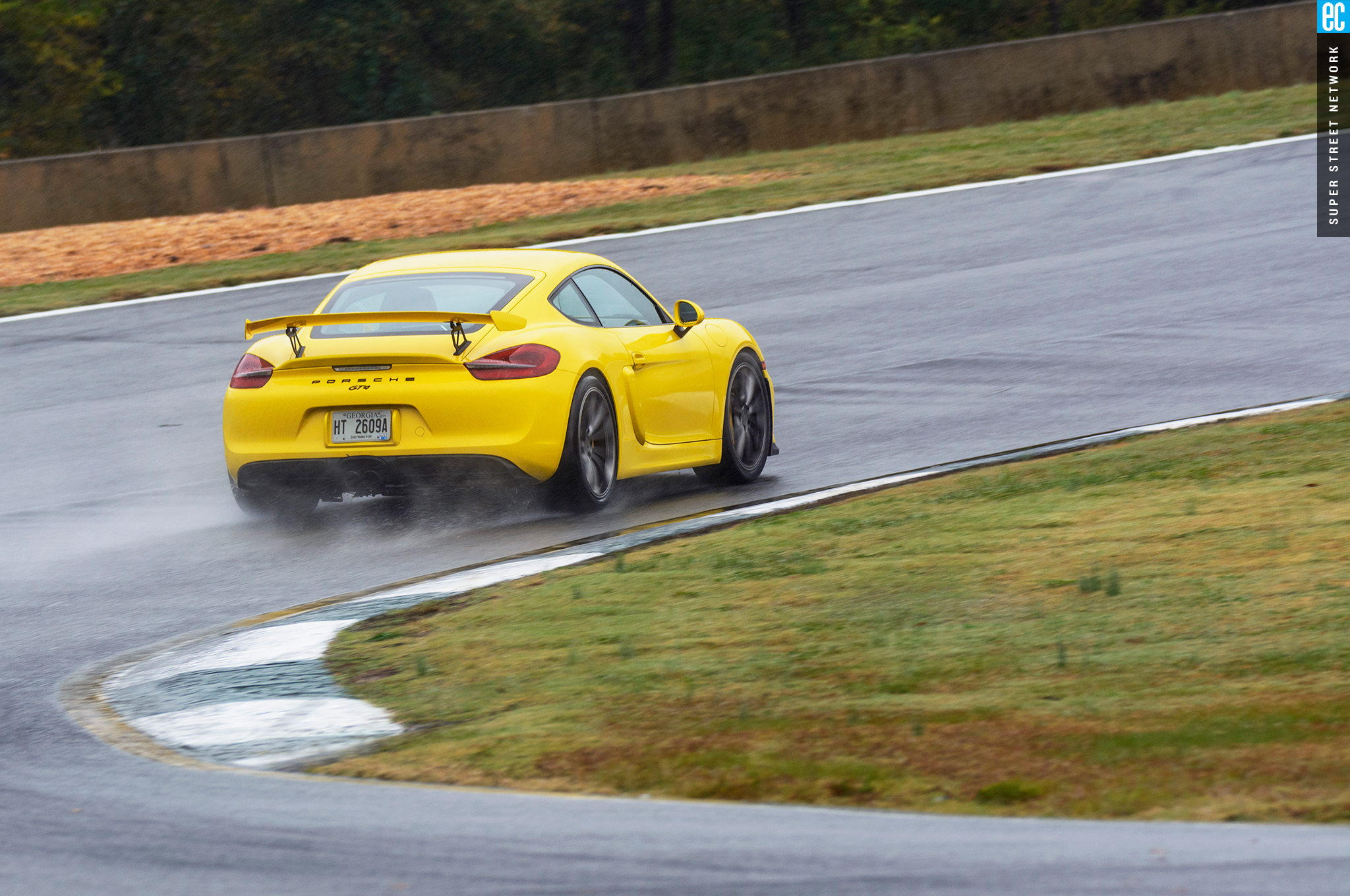 The front suspension of the GT4 was lifted straight from a 911 GT3 with the two-piece lower control arms, adjustable antiroll bars, and even the brakes. It is as accurate here as on its original home, maybe more so with the GT4's weight balance. The conditions at Road Atlanta ranged from almost completely dry to "I'm pretty sure there's a track under all this water." In all but the wettest of conditions, the front gives good feedback; when it stopped, that meant there was no feedback to be had since the tires had turned to flat-bottom boats. It still doesn't shake and kick like an old air-cooled car's steering—go buy a 914 if you want that—but you still know when it's loading up, when it's going to let go, and if you can push harder, and ultimately that's all that matters.