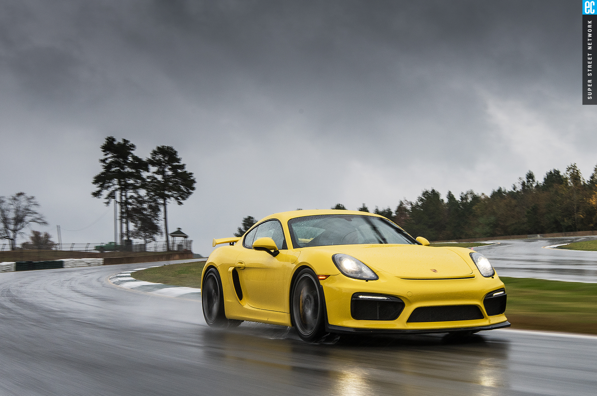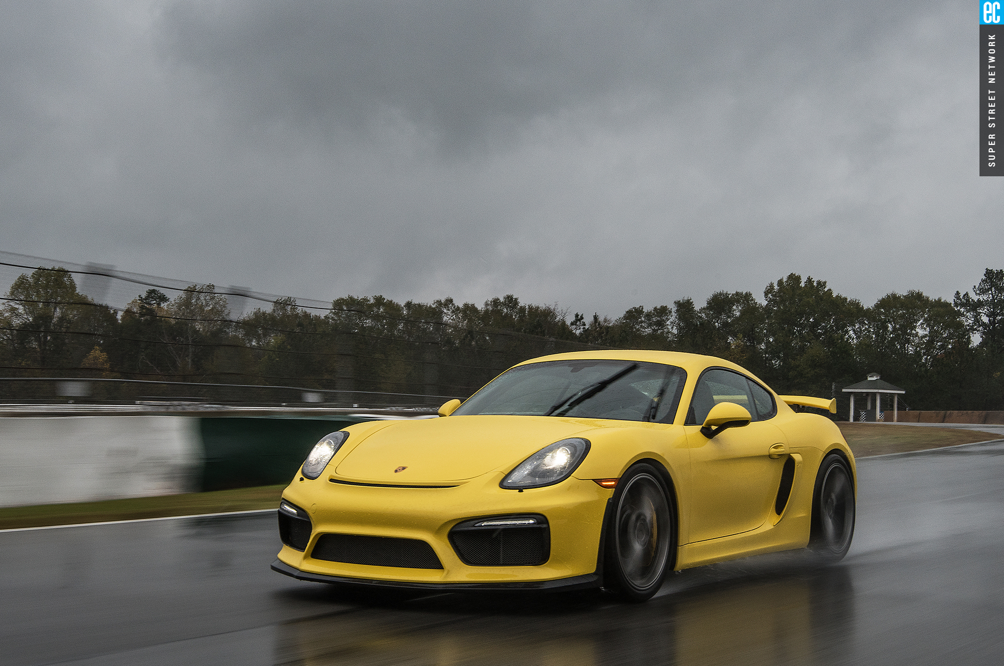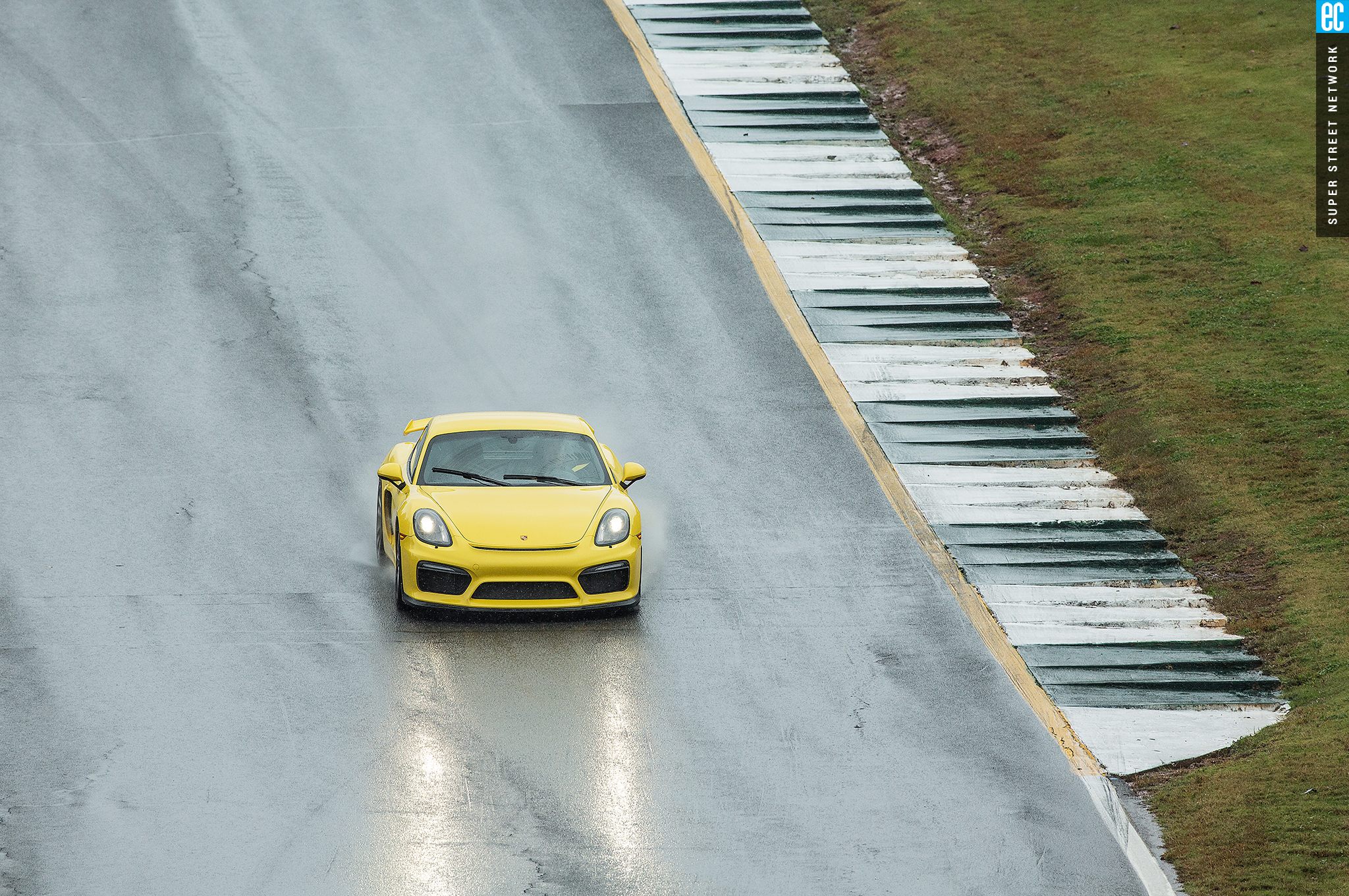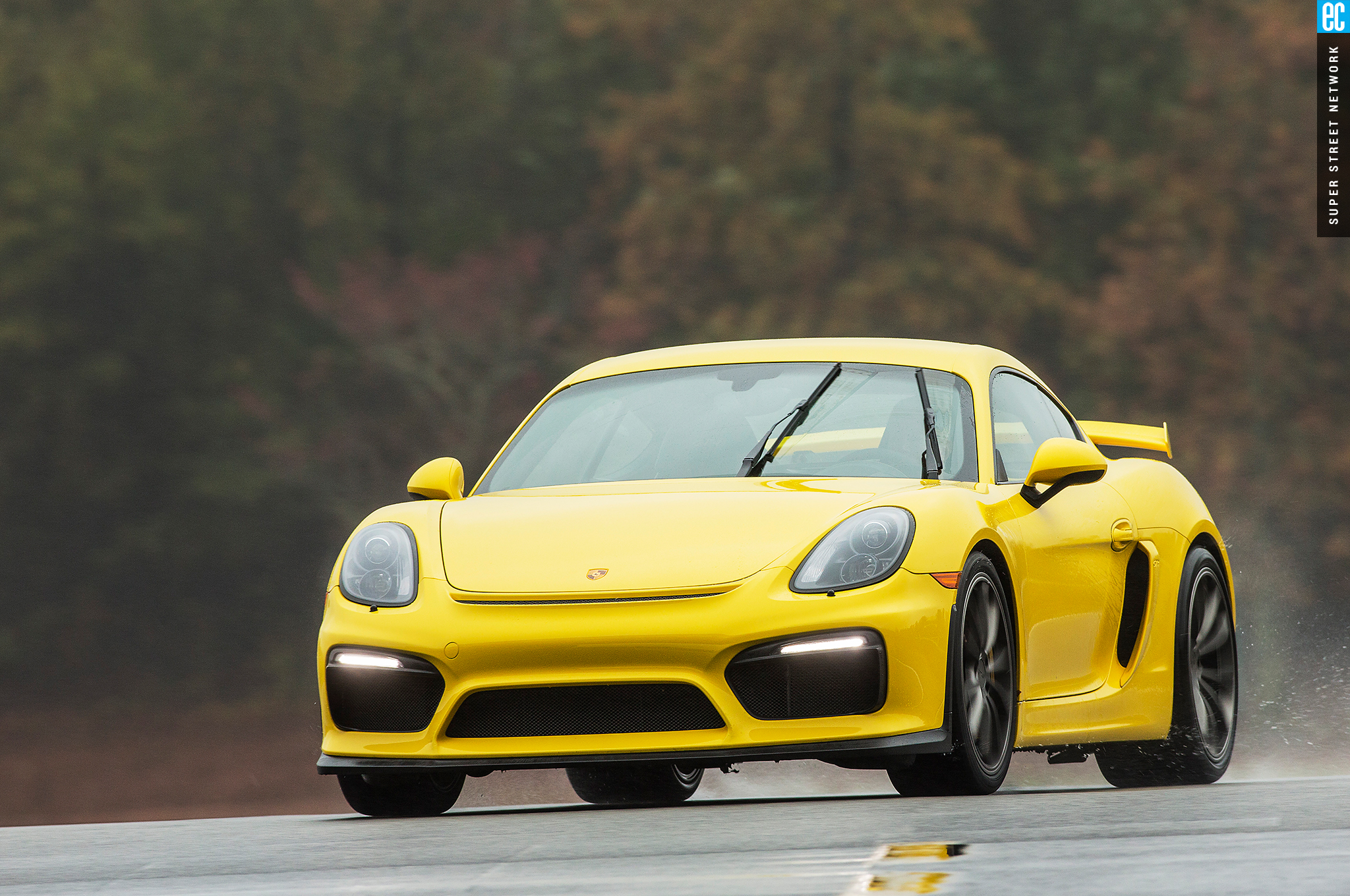 The front suspension of the GT4 was lifted straight from a 911 GT3 with the two-piece lower control arms, adjustable antiroll bars, and even the brakes. It is as accurate here as on its original home, maybe more so with the GT4's weight balance. The conditions at Road Atlanta ranged from almost completely dry to "I'm pretty sure there's a track under all this water." In all but the wettest of conditions, the front gives good feedback; when it stopped, that meant there was no feedback to be had since the tires had turned to flat-bottom boats. It still doesn't shake and kick like an old air-cooled car's steering—go buy a 914 if you want that—but you still know when it's loading up, when it's going to let go, and if you can push harder, and ultimately that's all that matters.
