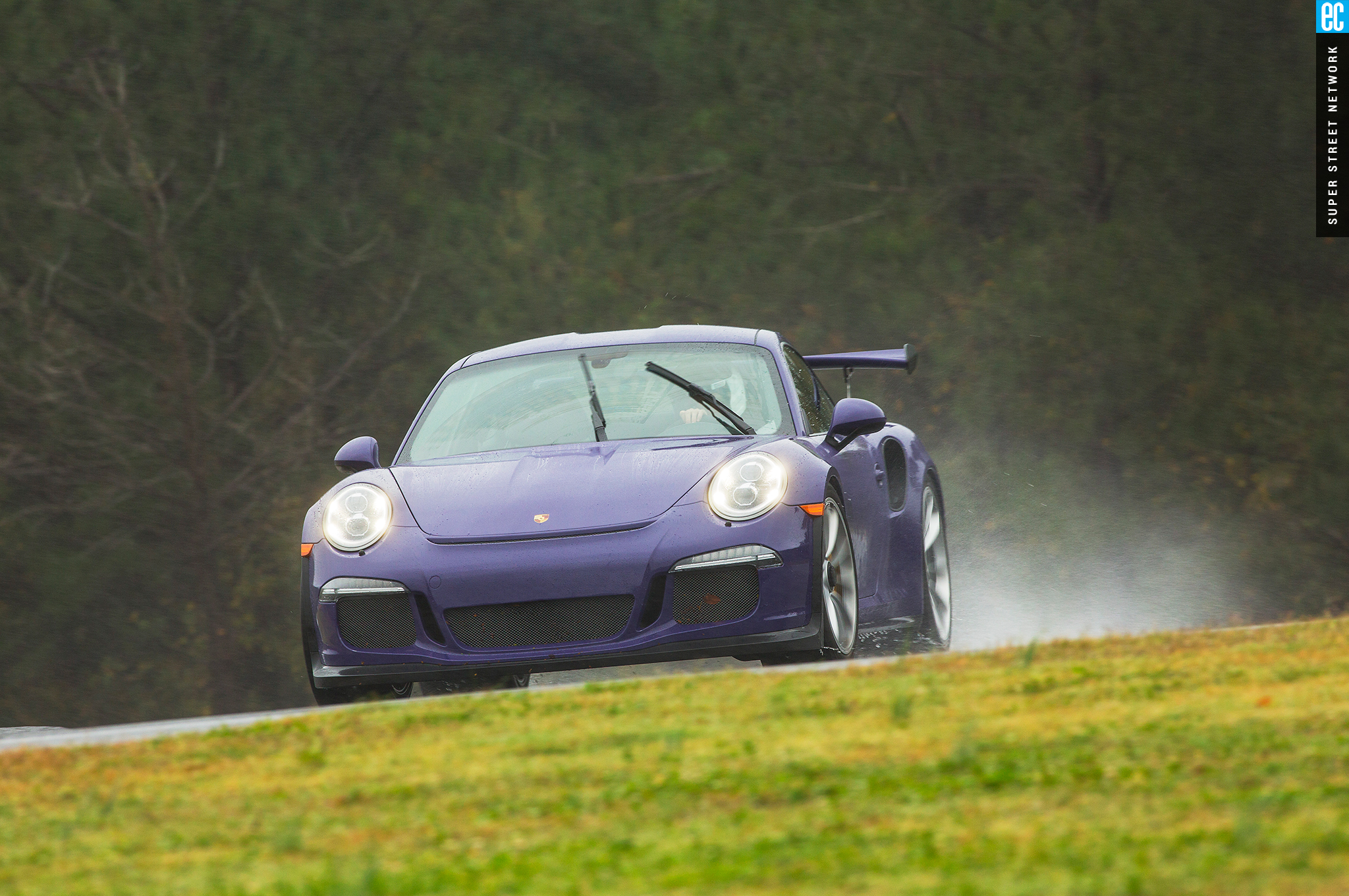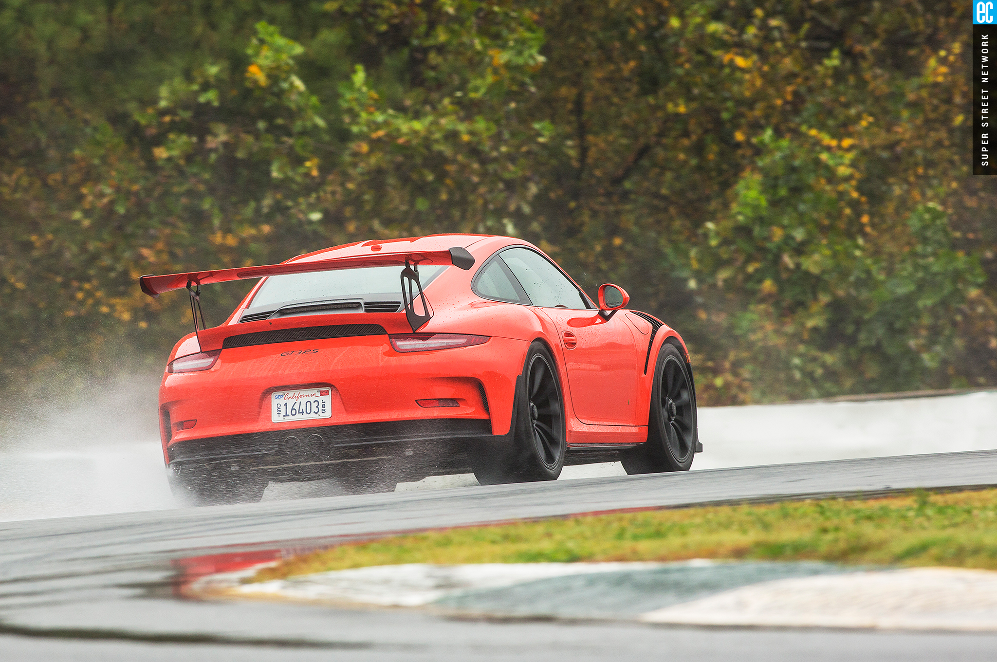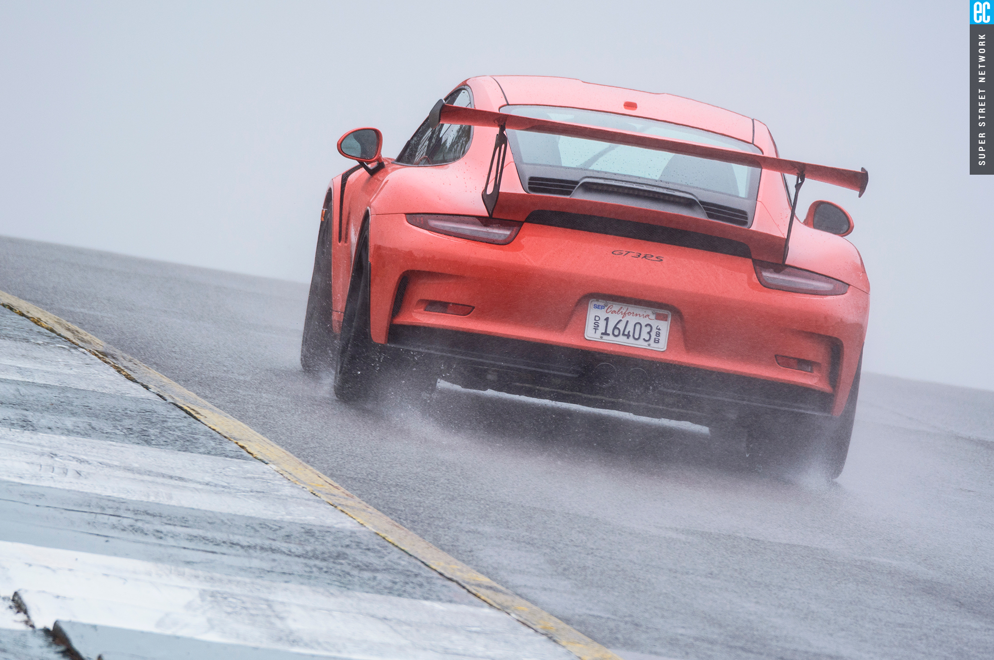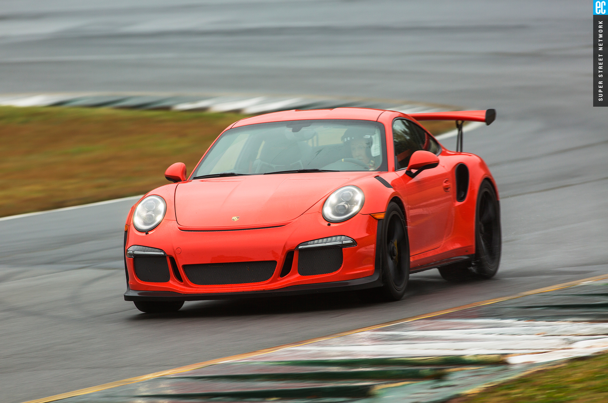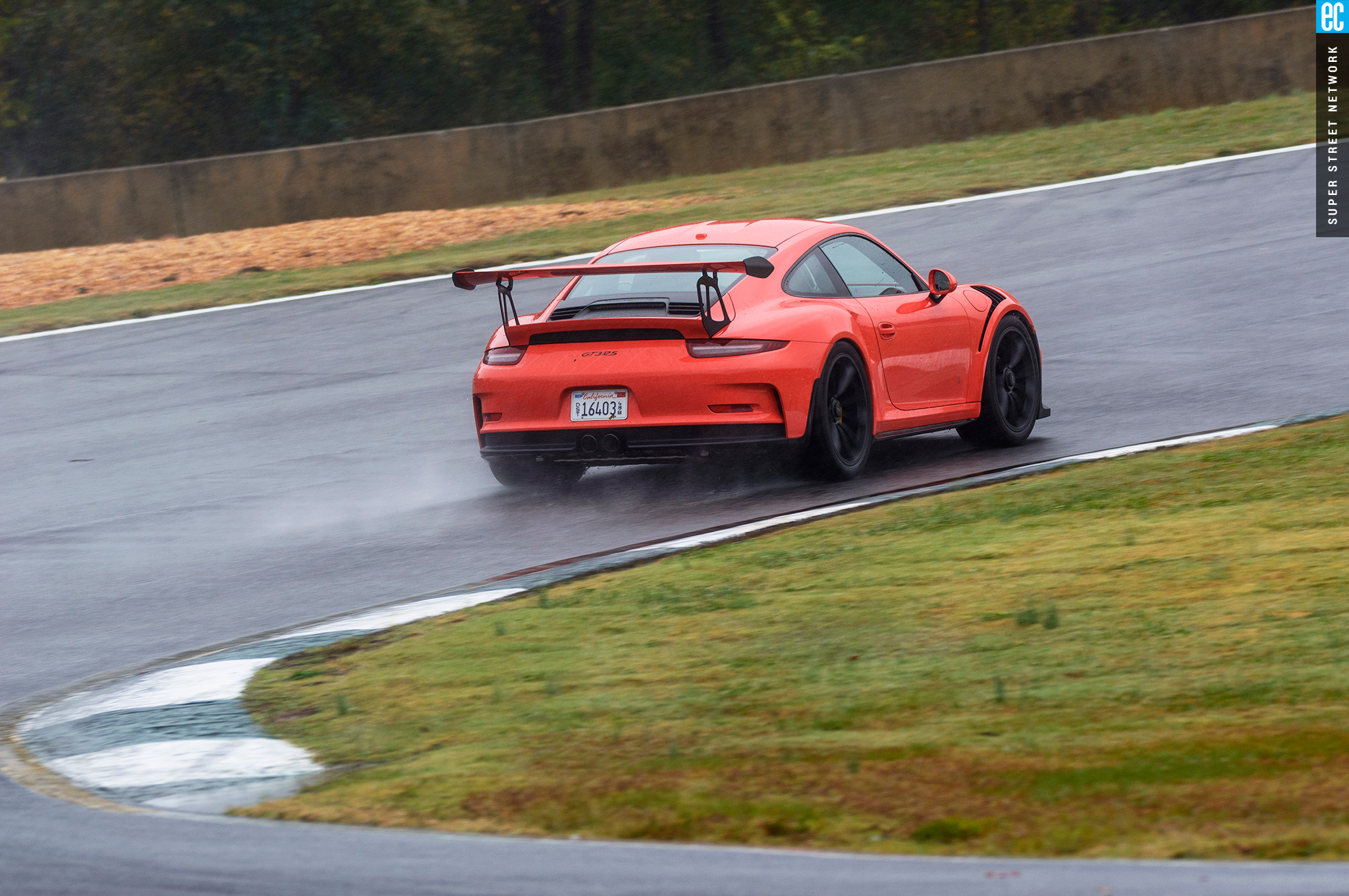 Right before heading out, I'm warned to stay off the curbs and in slow corners, don't commit to the throttle until the front tires are pointed nearly straight. First lap, Turn 3, curbs—check. Easy on the gas, Turn 7—check; lessons learned. Or at least, demonstrated. I stay away from the curbs the rest of the day, but I keep having trouble with the light right foot. I had noticed it in the dry as well. Porsche GT cars have a pretty decent amount of adjustability built in: individual ride heights for corner balancing, antiroll bars, and front and rear downforce. In the back, you can adjust the wing's angle of attack. In the front, you can pull the grilles out of the fender vents, increasing flow. For whatever reason, Porsche seems to like to set up these cars to oversteer on-throttle, a lot. That isn't usually a bad thing, if it's done in a controlled, moderate fashion. The GT3RS, however, lives up to the old 911 legend.