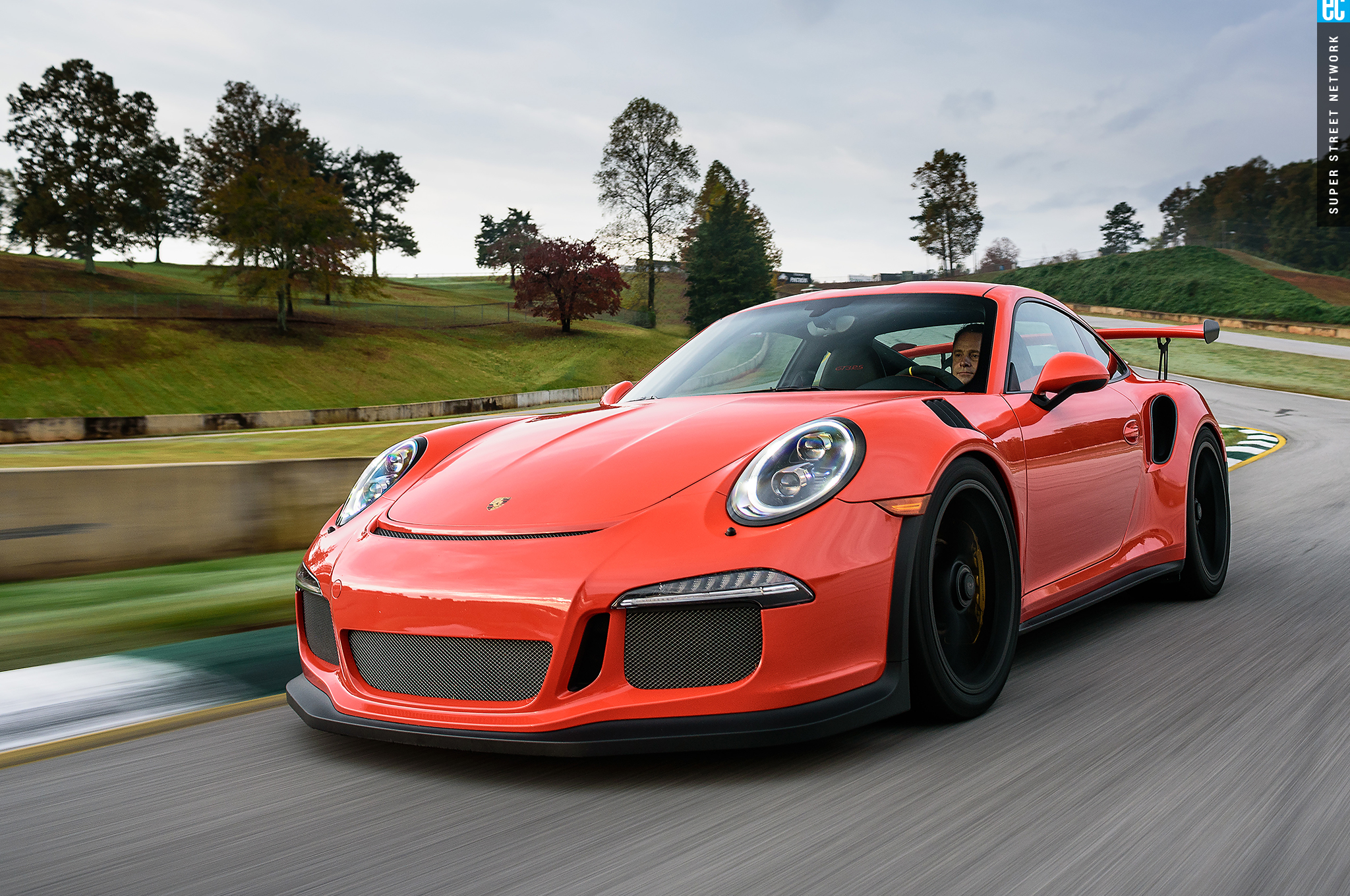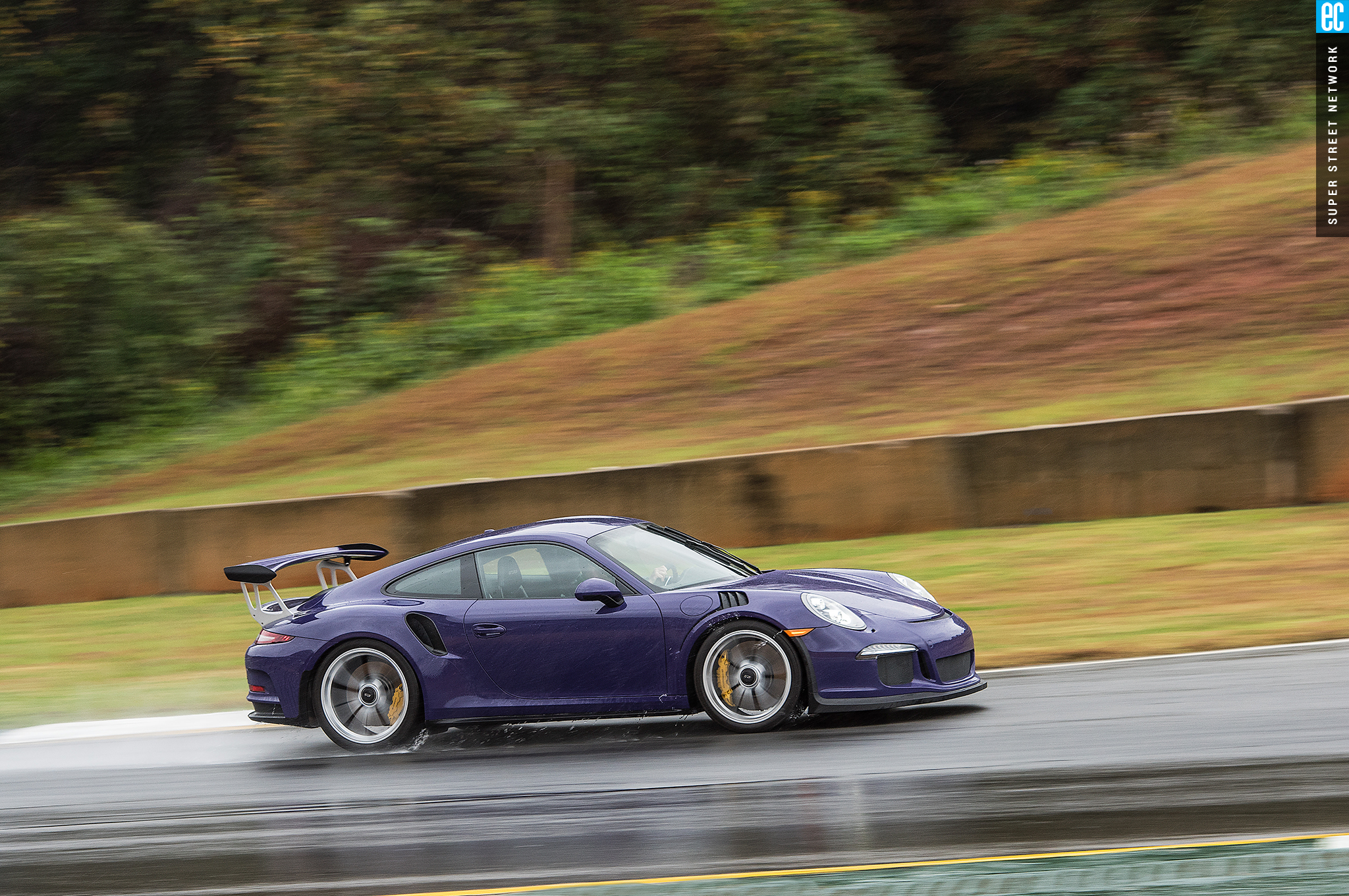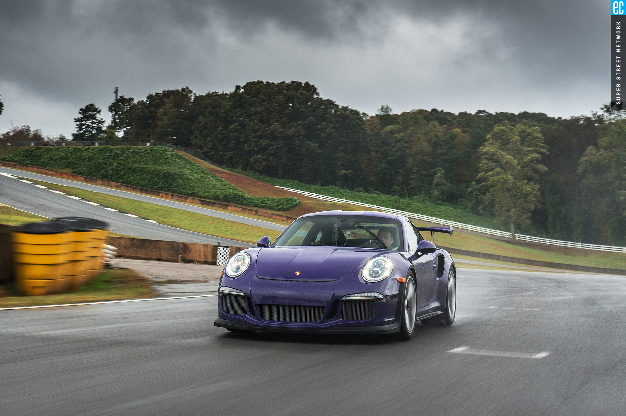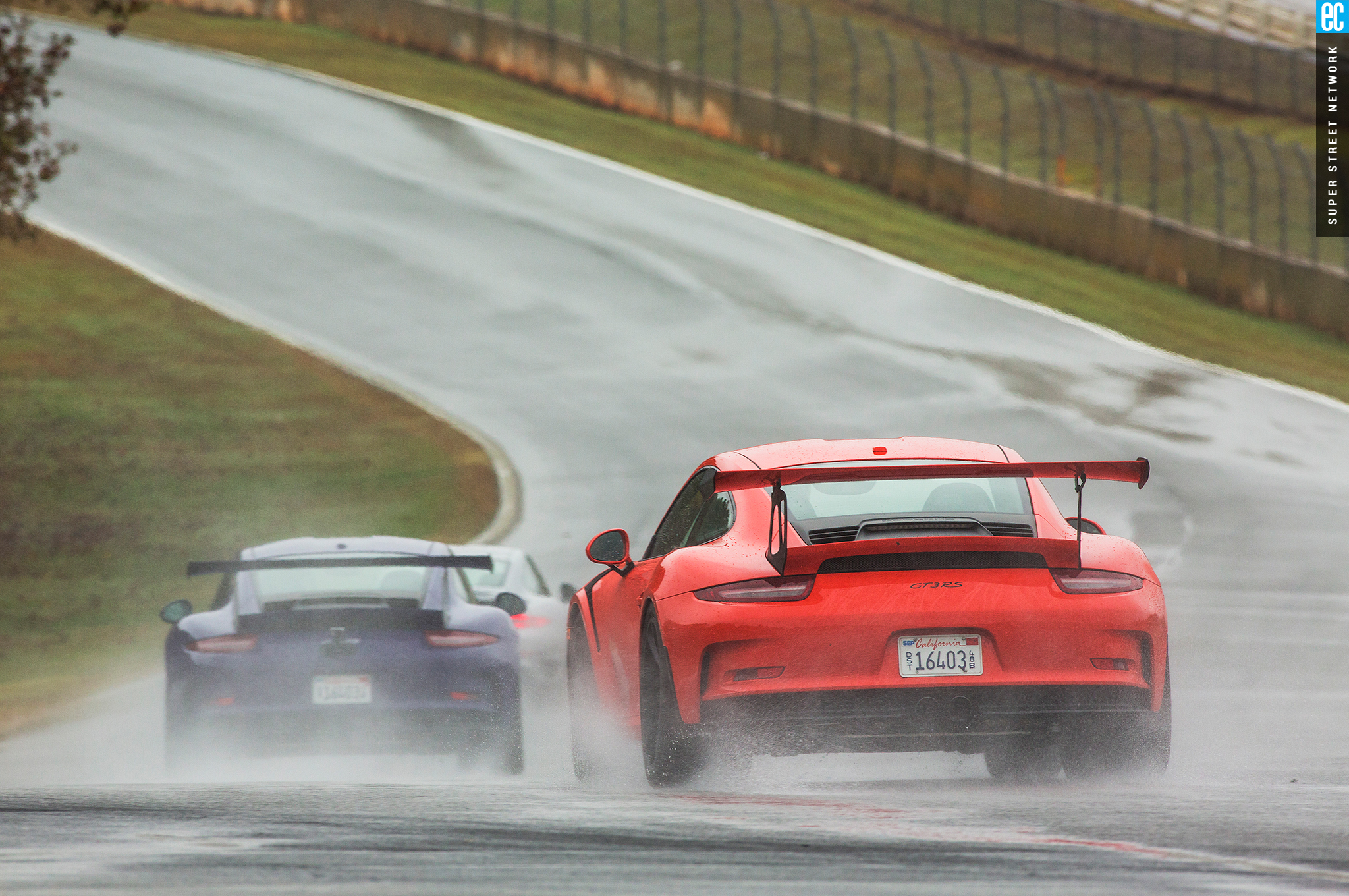 Right before heading out, I'm warned to stay off the curbs and in slow corners, don't commit to the throttle until the front tires are pointed nearly straight. First lap, Turn 3, curbs—check. Easy on the gas, Turn 7—check; lessons learned. Or at least, demonstrated. I stay away from the curbs the rest of the day, but I keep having trouble with the light right foot. I had noticed it in the dry as well. Porsche GT cars have a pretty decent amount of adjustability built in: individual ride heights for corner balancing, antiroll bars, and front and rear downforce. In the back, you can adjust the wing's angle of attack. In the front, you can pull the grilles out of the fender vents, increasing flow. For whatever reason, Porsche seems to like to set up these cars to oversteer on-throttle, a lot. That isn't usually a bad thing, if it's done in a controlled, moderate fashion. The GT3RS, however, lives up to the old 911 legend.
