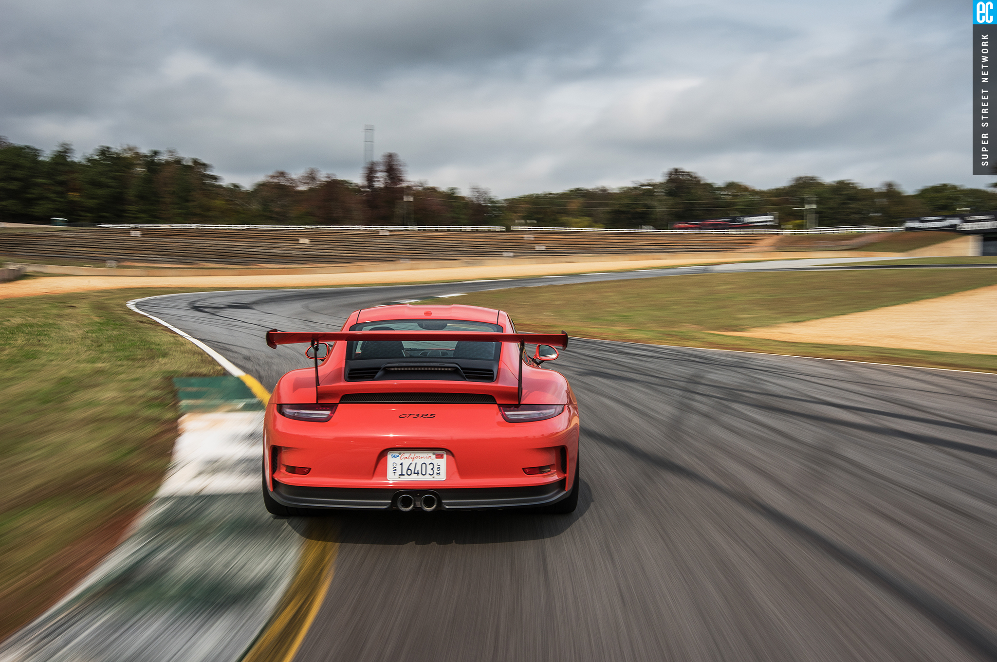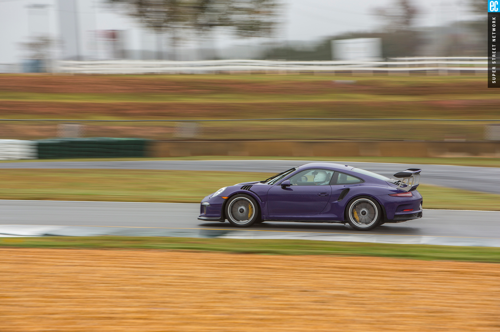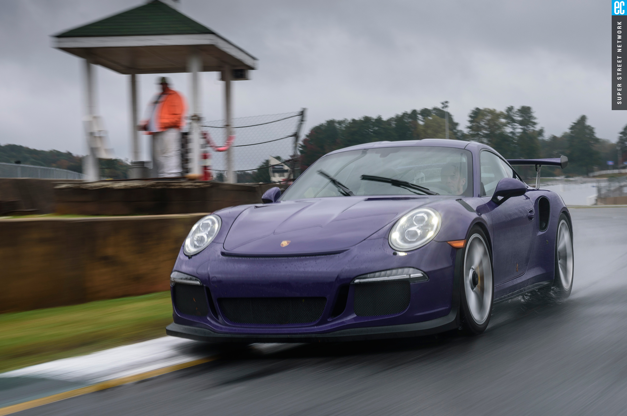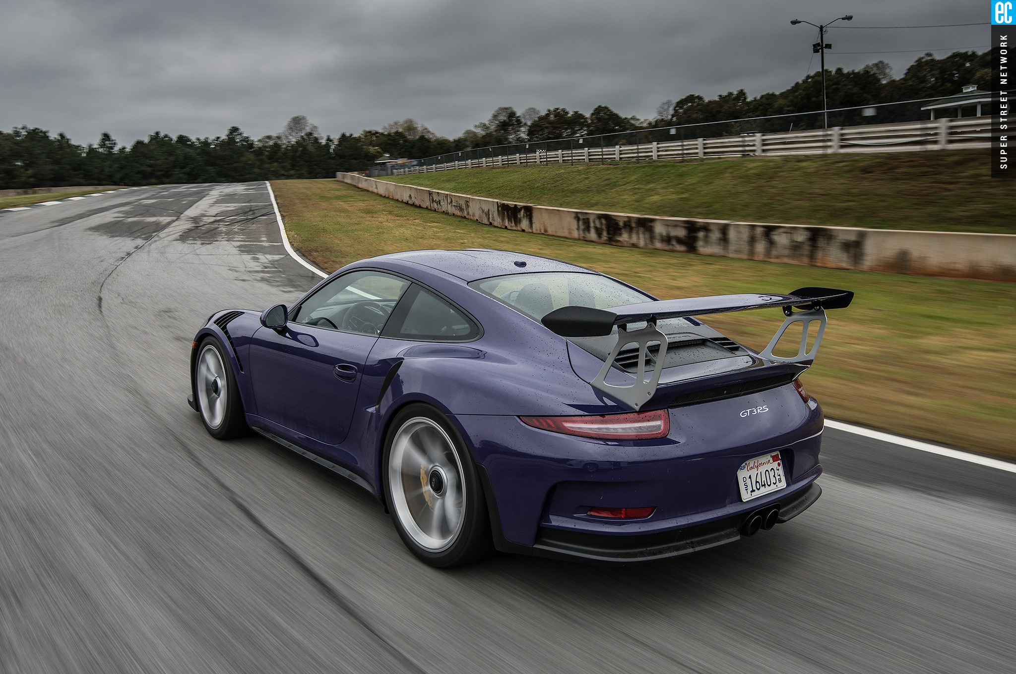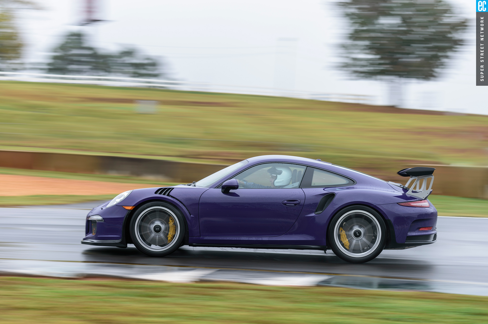 Right before heading out, I'm warned to stay off the curbs and in slow corners, don't commit to the throttle until the front tires are pointed nearly straight. First lap, Turn 3, curbs—check. Easy on the gas, Turn 7—check; lessons learned. Or at least, demonstrated. I stay away from the curbs the rest of the day, but I keep having trouble with the light right foot. I had noticed it in the dry as well. Porsche GT cars have a pretty decent amount of adjustability built in: individual ride heights for corner balancing, antiroll bars, and front and rear downforce. In the back, you can adjust the wing's angle of attack. In the front, you can pull the grilles out of the fender vents, increasing flow. For whatever reason, Porsche seems to like to set up these cars to oversteer on-throttle, a lot. That isn't usually a bad thing, if it's done in a controlled, moderate fashion. The GT3RS, however, lives up to the old 911 legend.