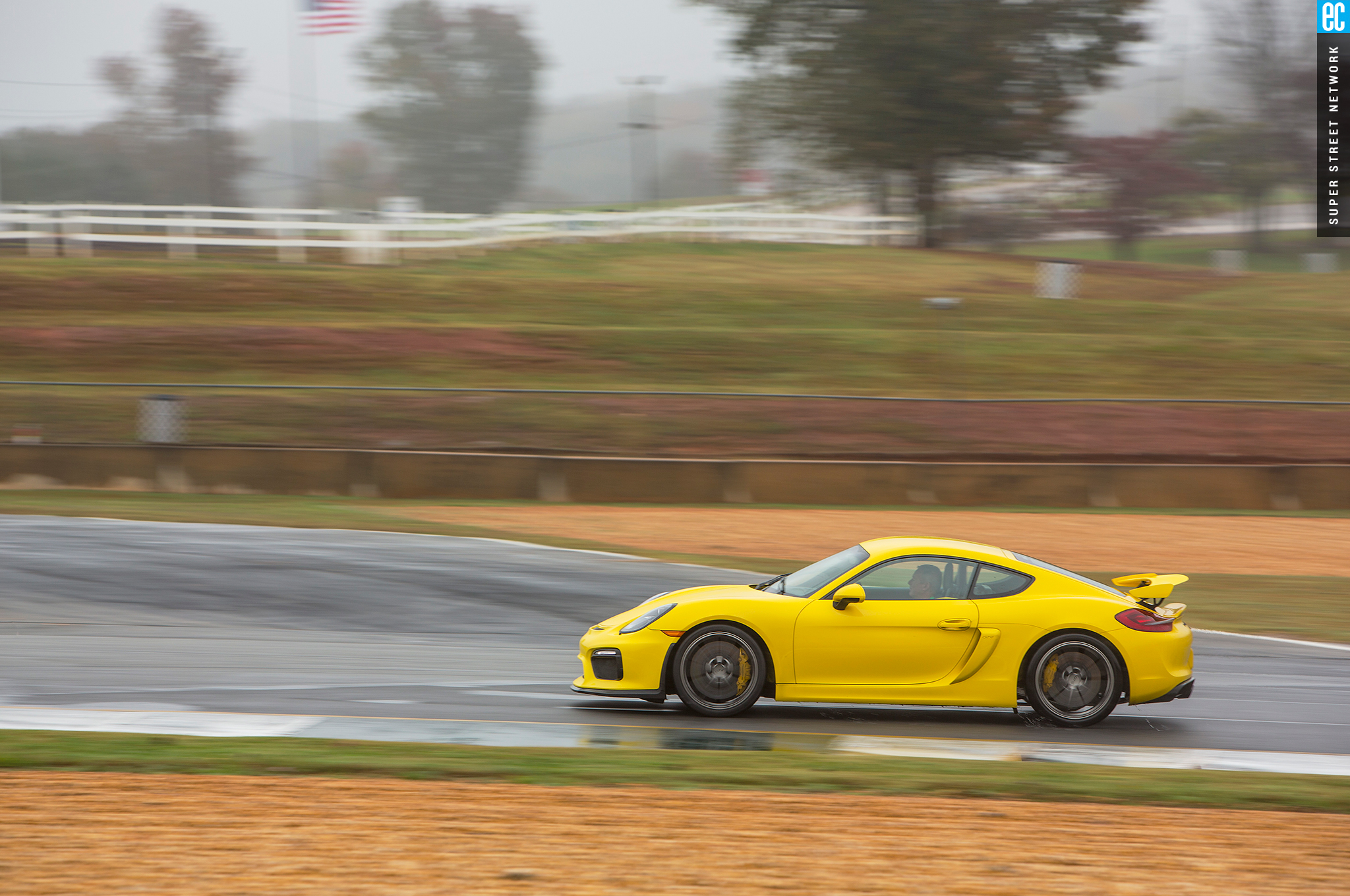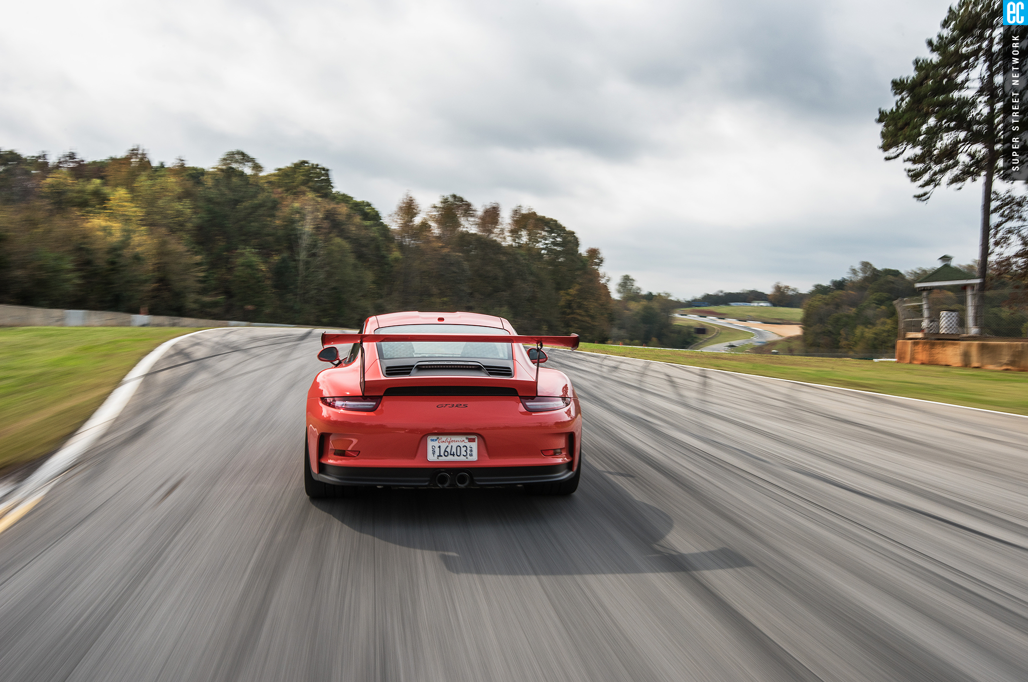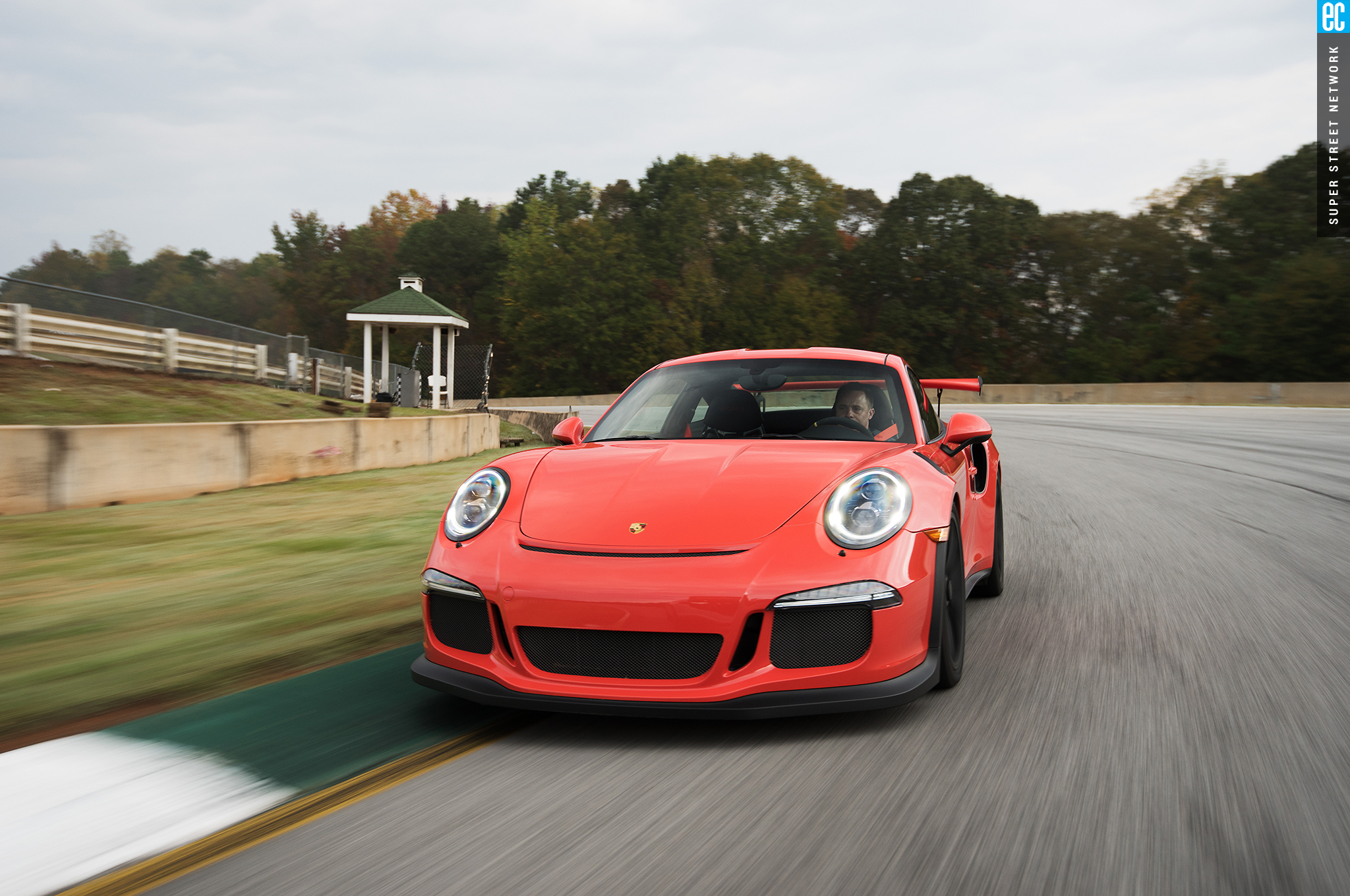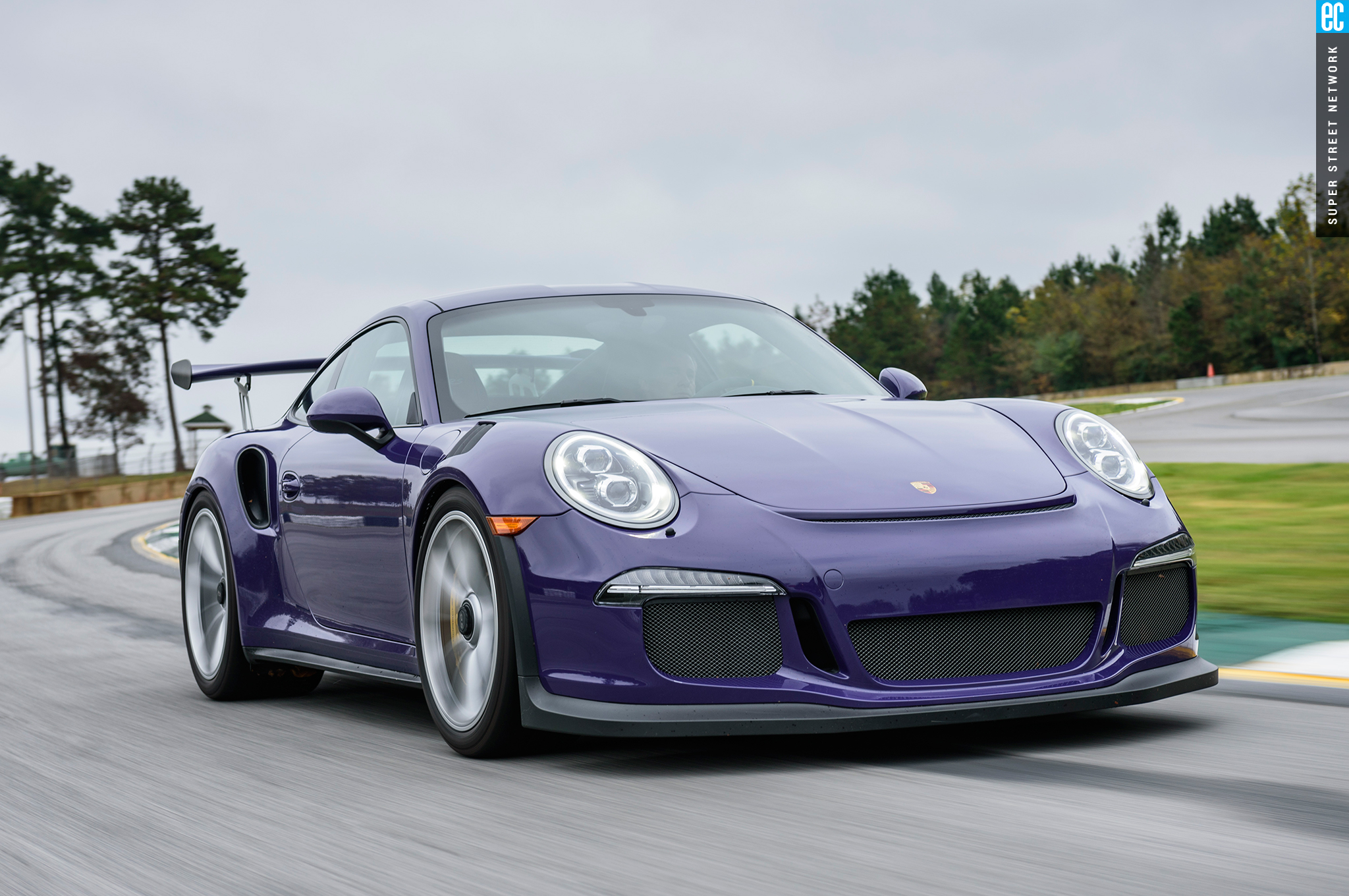 Right before heading out, I'm warned to stay off the curbs and in slow corners, don't commit to the throttle until the front tires are pointed nearly straight. First lap, Turn 3, curbs—check. Easy on the gas, Turn 7—check; lessons learned. Or at least, demonstrated. I stay away from the curbs the rest of the day, but I keep having trouble with the light right foot. I had noticed it in the dry as well. Porsche GT cars have a pretty decent amount of adjustability built in: individual ride heights for corner balancing, antiroll bars, and front and rear downforce. In the back, you can adjust the wing's angle of attack. In the front, you can pull the grilles out of the fender vents, increasing flow. For whatever reason, Porsche seems to like to set up these cars to oversteer on-throttle, a lot. That isn't usually a bad thing, if it's done in a controlled, moderate fashion. The GT3RS, however, lives up to the old 911 legend.
