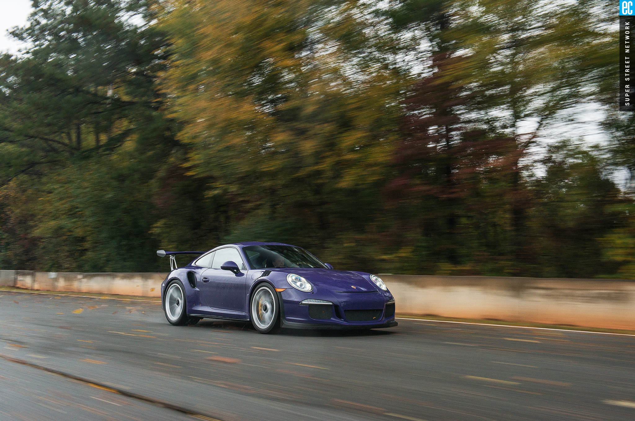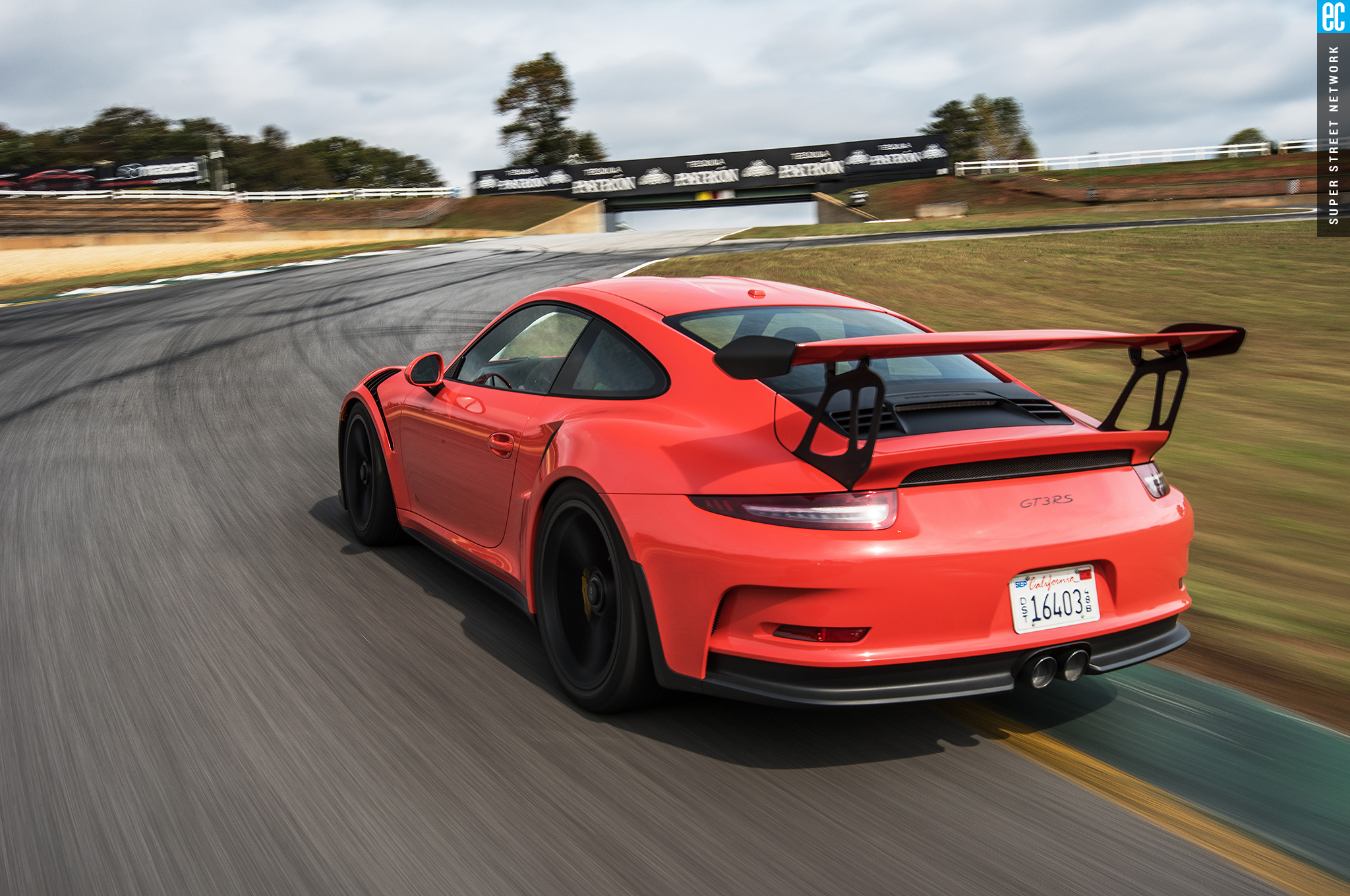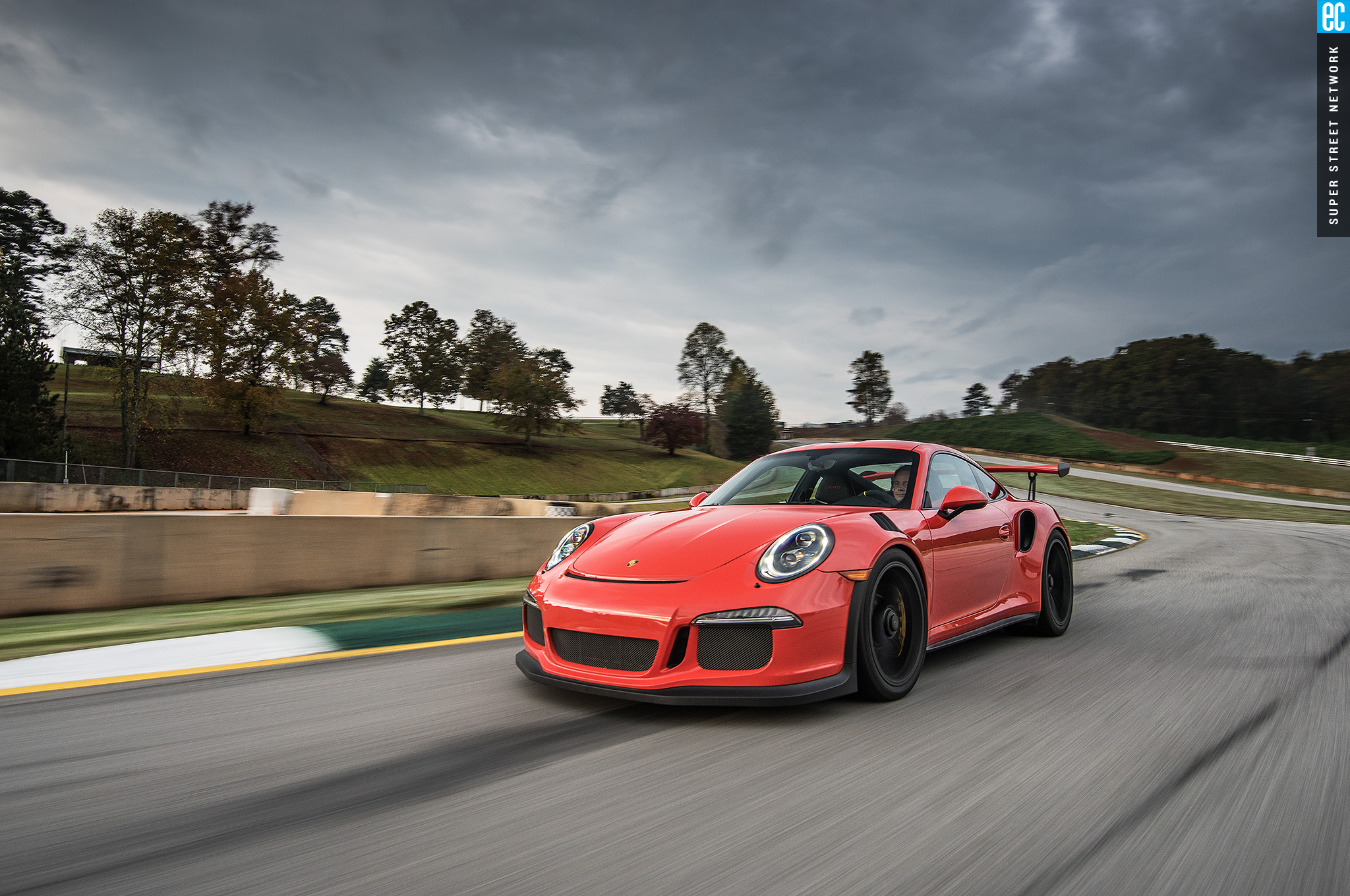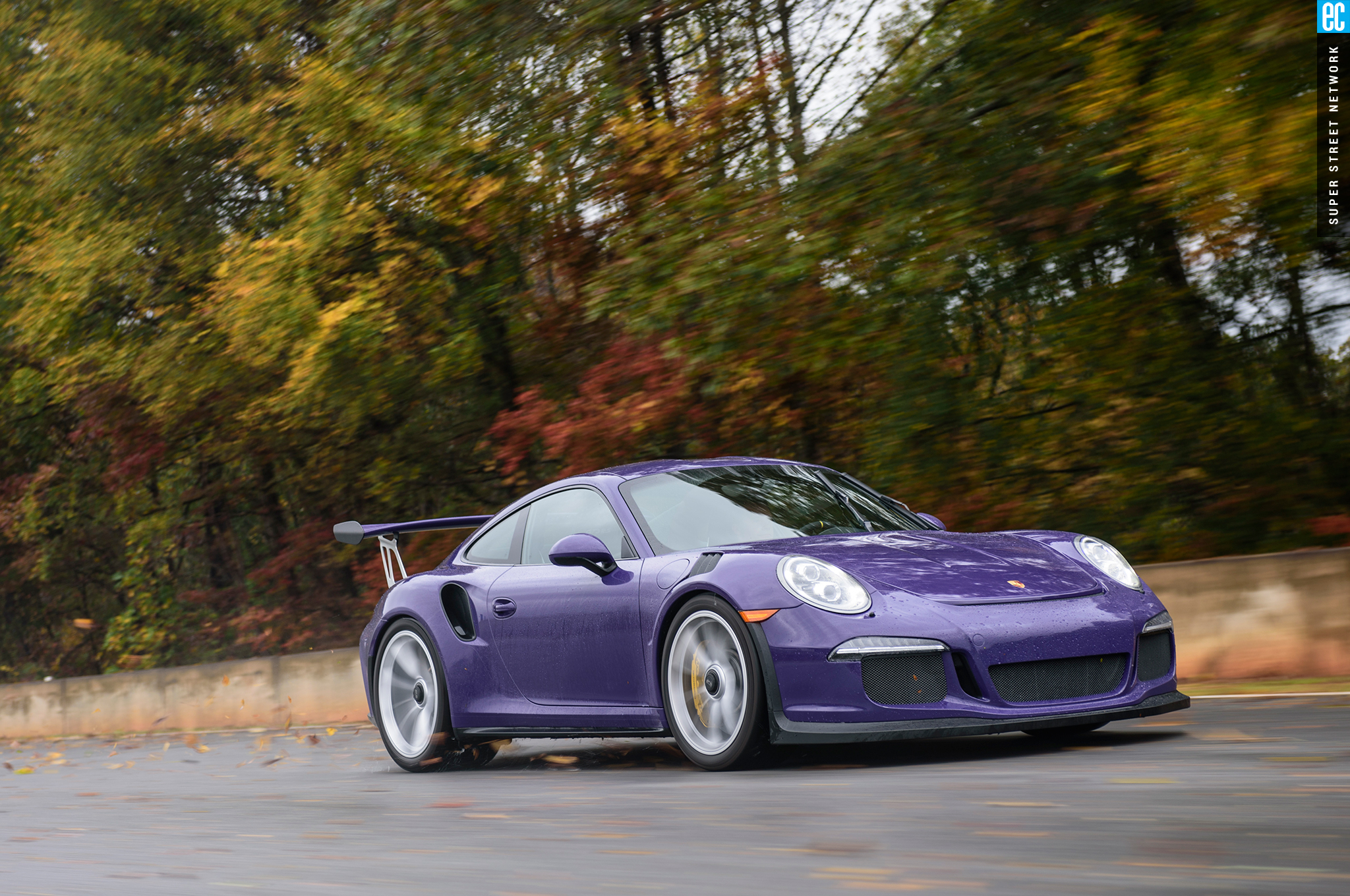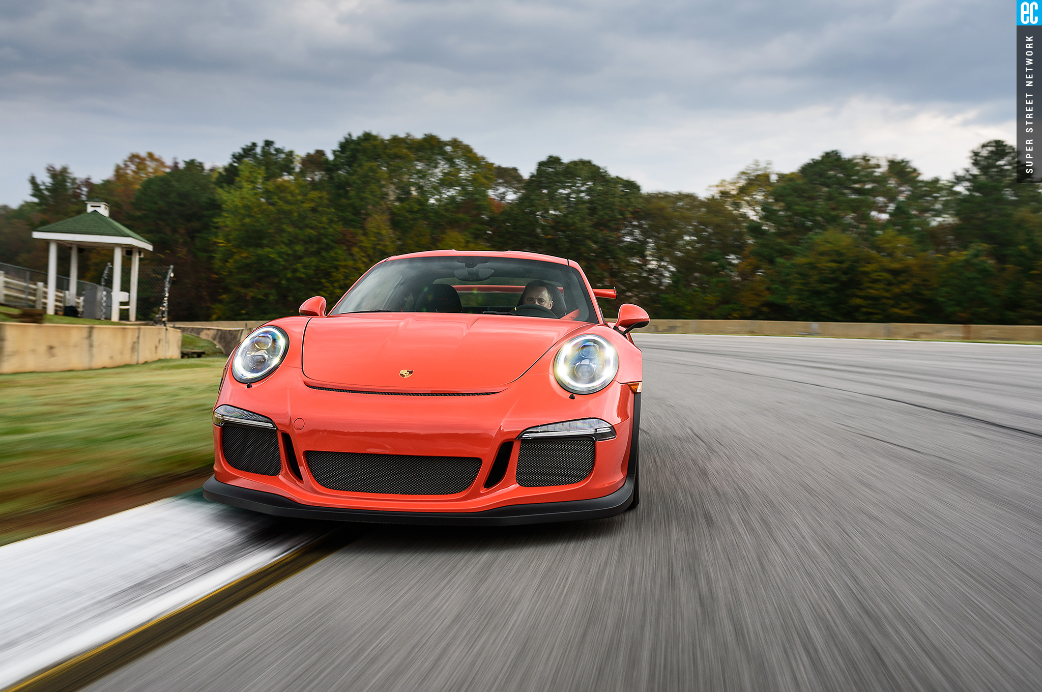 Right before heading out, I'm warned to stay off the curbs and in slow corners, don't commit to the throttle until the front tires are pointed nearly straight. First lap, Turn 3, curbs—check. Easy on the gas, Turn 7—check; lessons learned. Or at least, demonstrated. I stay away from the curbs the rest of the day, but I keep having trouble with the light right foot. I had noticed it in the dry as well. Porsche GT cars have a pretty decent amount of adjustability built in: individual ride heights for corner balancing, antiroll bars, and front and rear downforce. In the back, you can adjust the wing's angle of attack. In the front, you can pull the grilles out of the fender vents, increasing flow. For whatever reason, Porsche seems to like to set up these cars to oversteer on-throttle, a lot. That isn't usually a bad thing, if it's done in a controlled, moderate fashion. The GT3RS, however, lives up to the old 911 legend.