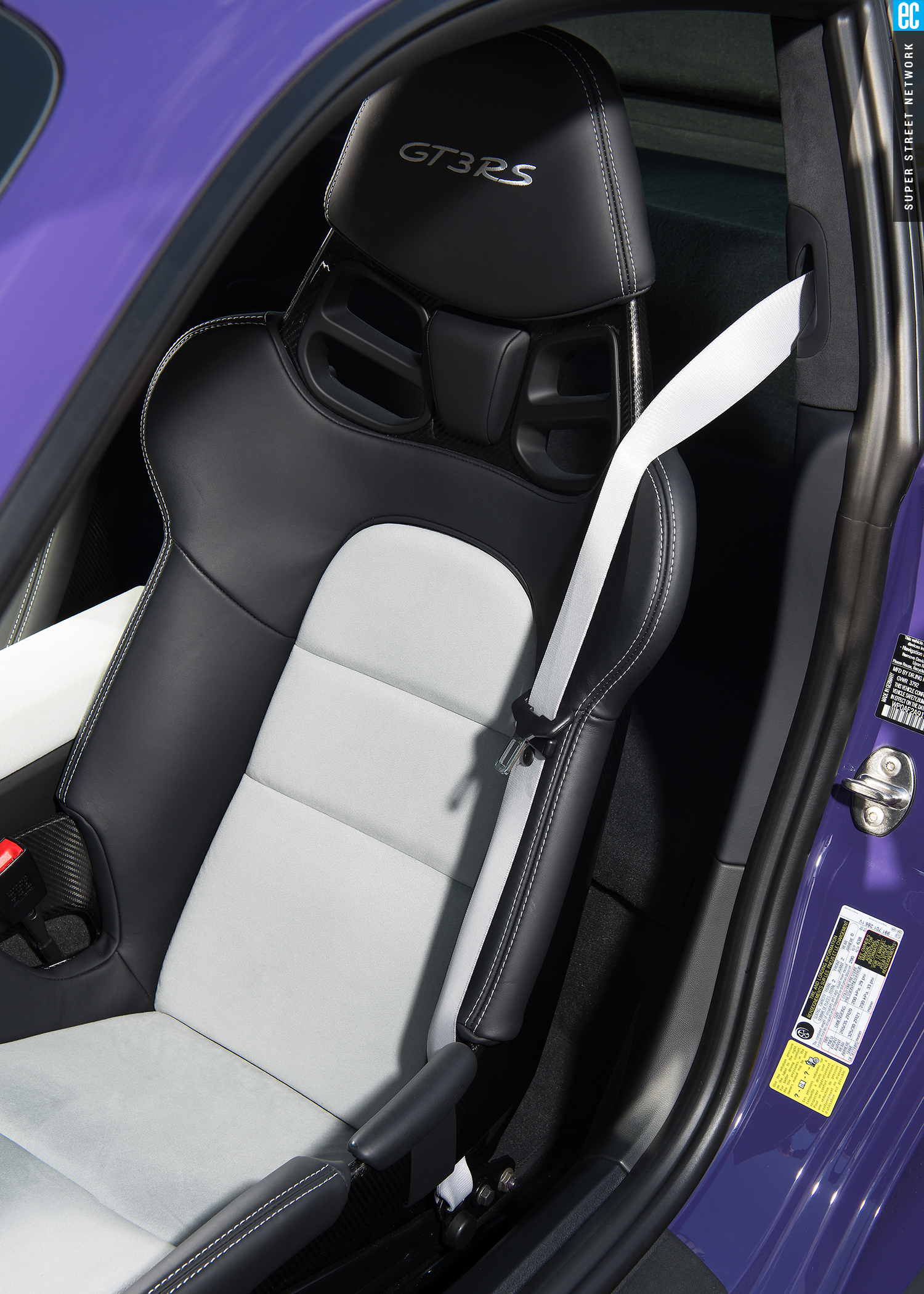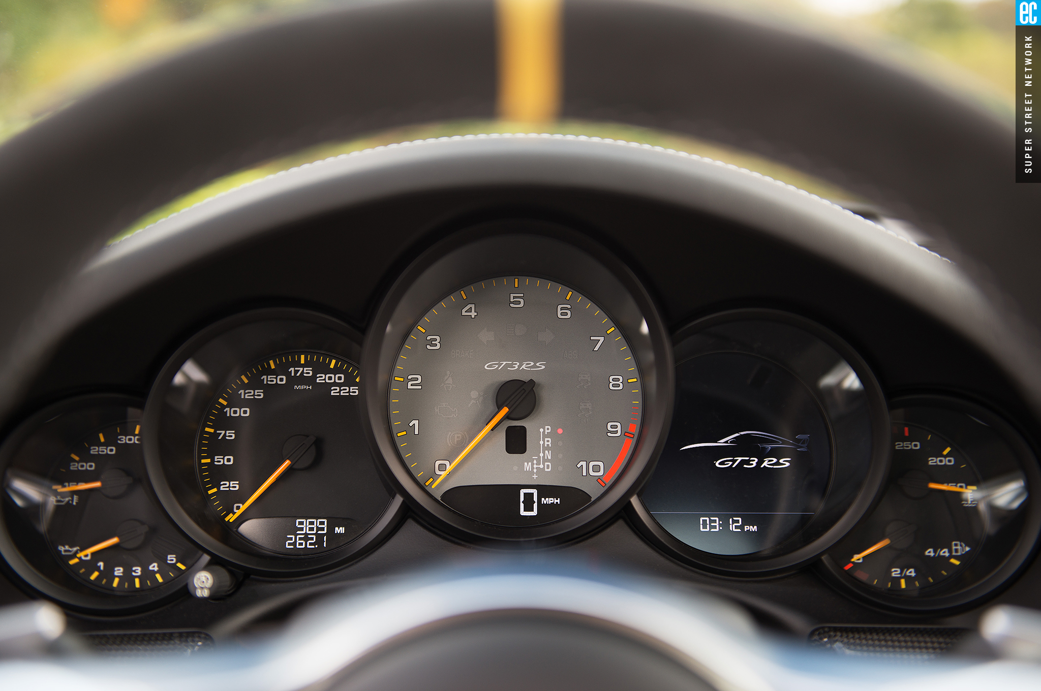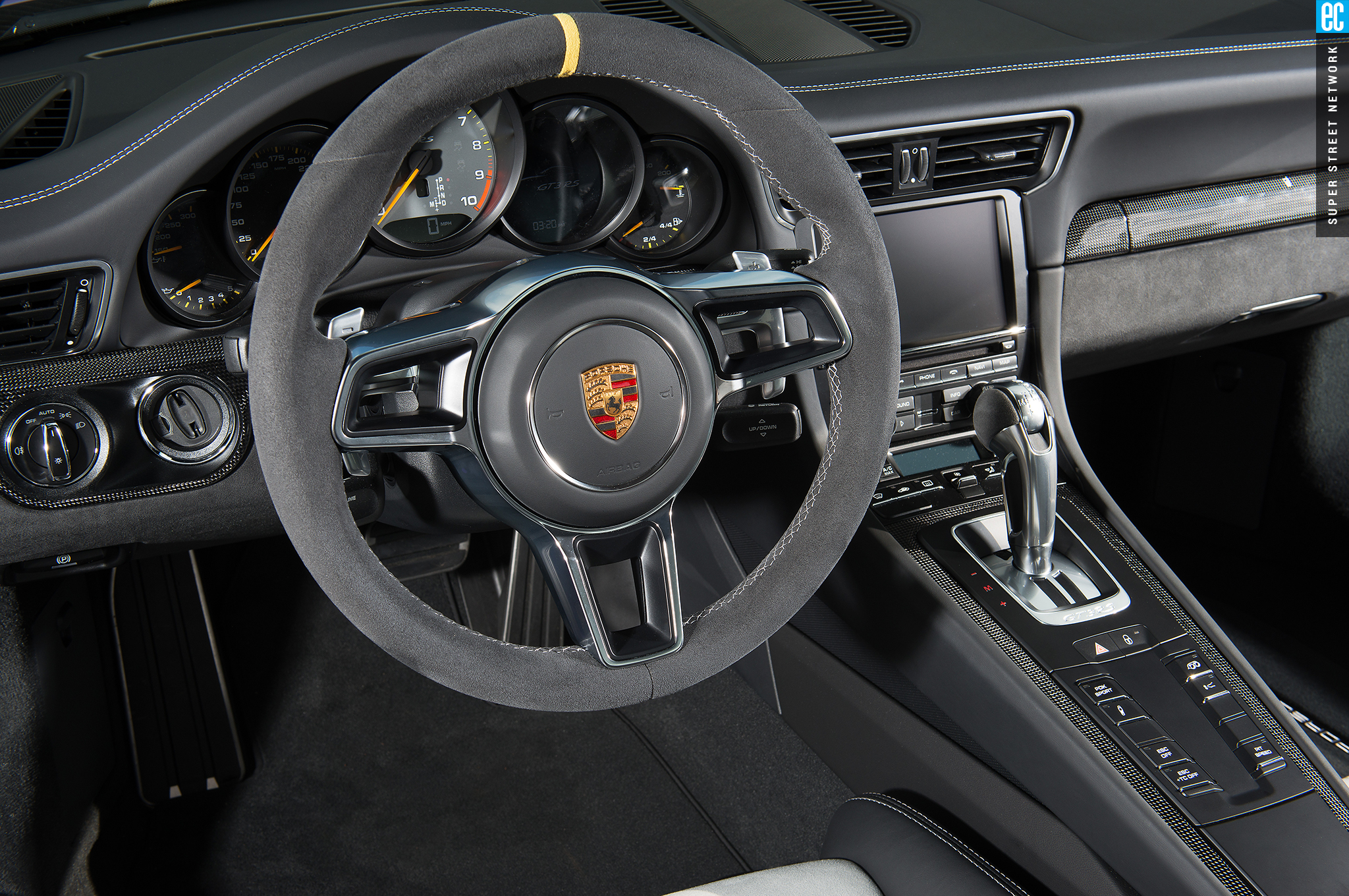 The GT3RS has more energy sitting still than the GT4 has cruising at part-throttle. Idling in the pits, the RS radiates mechanical purpose. The GT4 says, "Let's go drive." The RS grumbles, "I'm going to crush some lap times, if you're driver enough." It's powerful, it's demanding, and it's imposing—and you know this before you've started moving. There are two pedals and two steering wheel–mounted paddles in front of you, just like any modern race car. For a driver, this is where you work, not play. The full bucket seats are good, really good for something the DOT will sign off on, but if this were my car, it would have FIA-approved racing buckets and harnesses in addition to a rollcage.