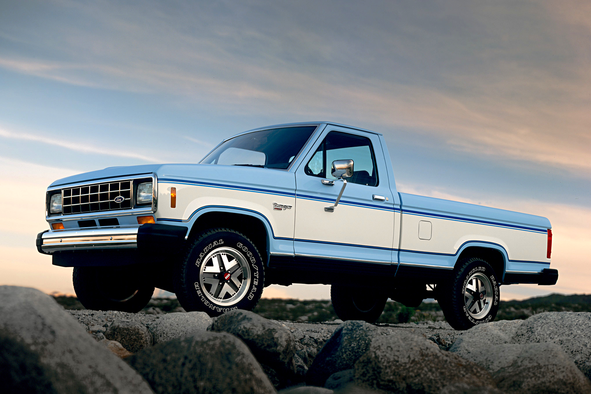No longer content to sell a rebaged, lightly restyled Mazda as the Courier, Ford applied the Ranger name to its new compact pickup—and 11 years later began building the Mazda B-series based on the Ranger. Although the Ranger grew slightly over its nearly 30-year run, which included 17 straight years atop the entry-truck sales charts, it remained a compact, with a variety of four- and six-cylinder engines putting out between 72-207 horses, plus one limited-production electric model.