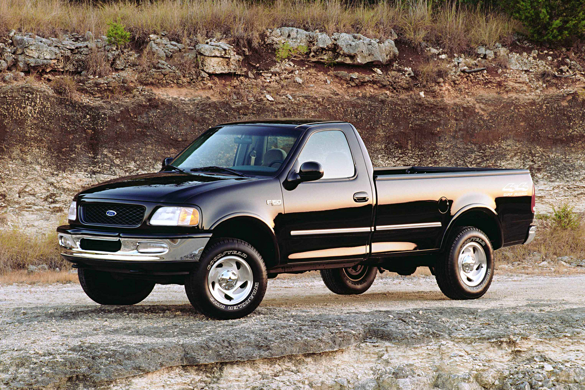 With the rounded (think NASCAR truck racing) body, overhead-cam V-8 ’97 F-series 1/2-tons and HDs became different trucks. The new 1/2-ton used a 4.2L OHV V-6 enlarged from the passenger-car 3.8 Essex, with new SOHC 220hp 4.6L and 235hp 5.4L V-8s replacing previous small-blocks, mated to a four-speed auto or Mazda-sourced five-speed manual. The SuperCab copied GM’s opening passenger-side rear door, and in ’01 the SuperCrew four-door arrived. The second-generation Lightning debuted in ’99, sporting a supercharged 5.4 V-8, 295 Eagle F1s, sport suspension, and a power/weight ratio similar to today’s 3.5L turbo.