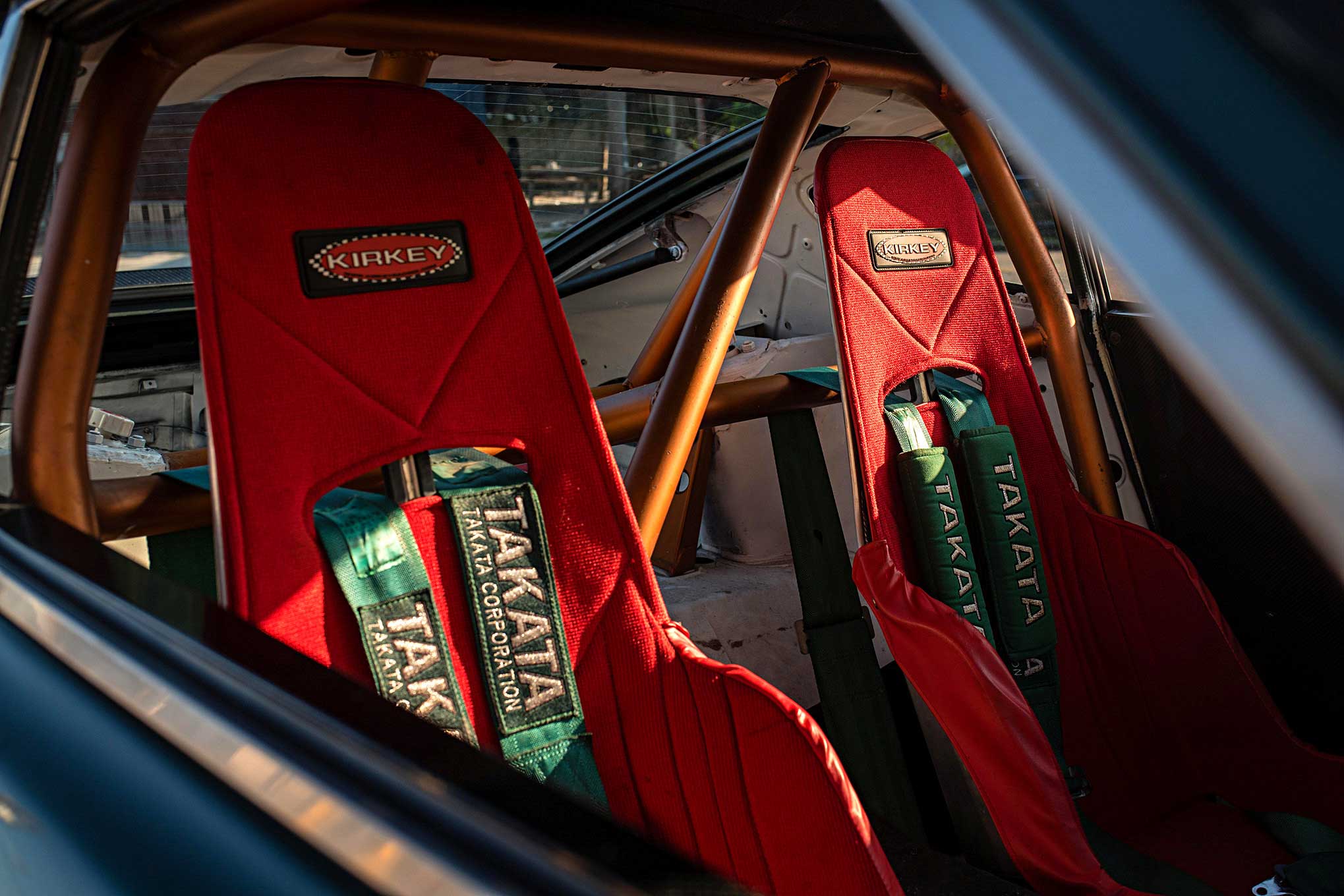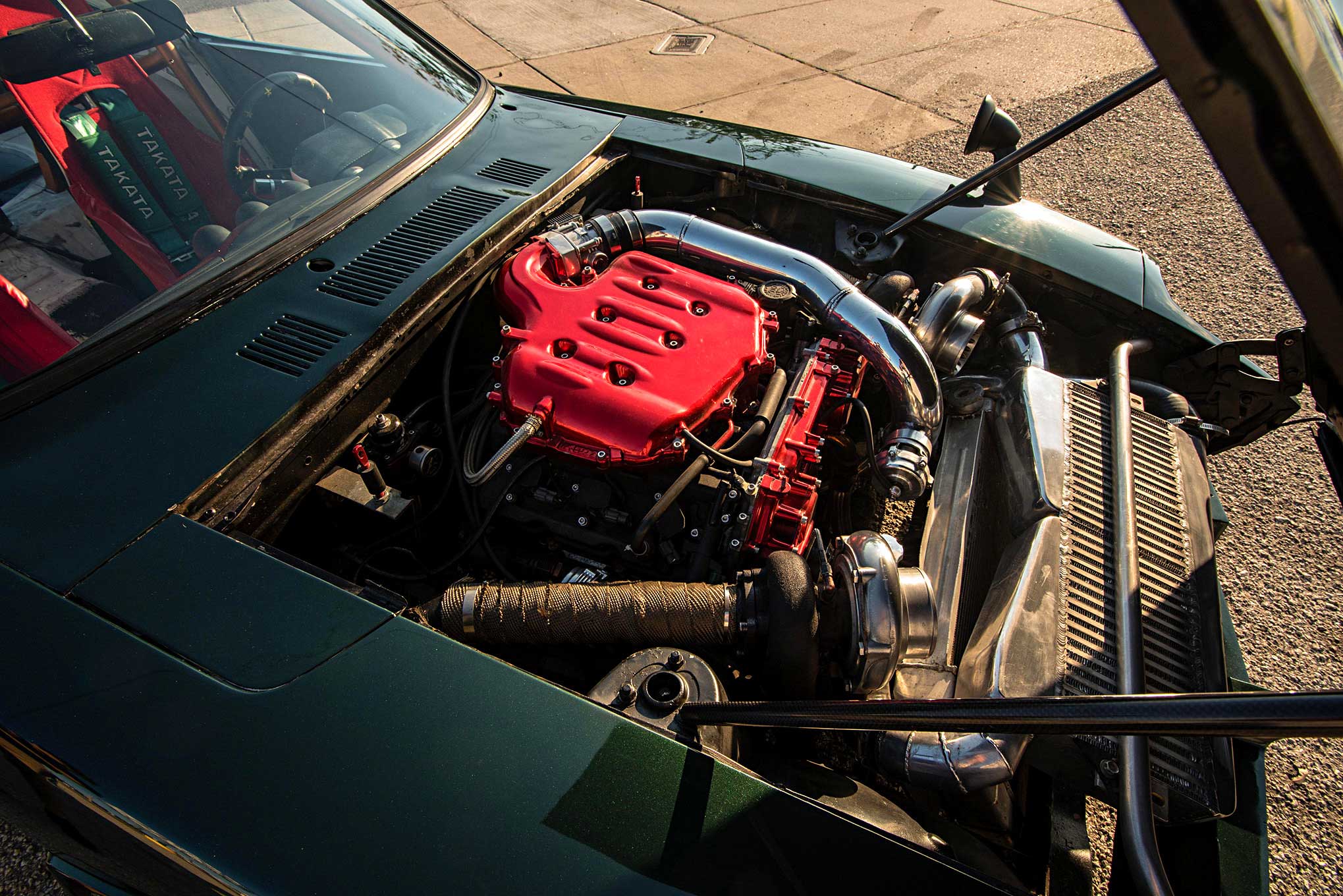 The interior is a combination of 350Z and function over form. The gold rollcage, bright red bucket seats, and green Takata harnesses were added to make the cabin pop and carry a race-inspired theme.