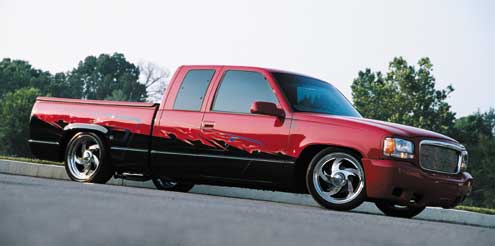 Cadillac Motors has been associated with luxury and comfort in cars since the get-go. The recent expansion of General Motors prompted Cadillac to produce a sport/utility based on Chevrolet’s ½-ton chassis. The Escalade was born and billed as GM’s luxury truck for the “connoisseur” of a fine auto. So as with all new designs, it was only a matter of time until someone got an idea, broke out a pen and checkbook, and started to create. Scott Curry of Tampa, Florida, did exactly that. His ’98 Chevy Silverado has turned into a dream mix of Cadillac and Chevy, the best of both worlds.We ran into Scott at last year’s Slamfest. His truck caught our eye as an unusual mix—a rare breed of modification. The Chevrolade features a full Cadillac Escalade frontend with a simply great assortment of goodies. Scott spent three months creating this beauty. He started off by dumping the stock frontend completely and adding the replacement from a ’99 Caddy. Scott went with Belltech spindles with a drop of 3 inches and lowered the stance another 2 inches using Belltech springs. The rear was brought to level with a rear flip kit, a C-notch kit, and springs, all from Belltech. The result is an altitude 6 inches lower out back and 5 inches up front.Now that it rides like an Escalade, it has to look like one. The factory front grille and bumper were removed and a Caddy bug catcher put in place. A Trendz billet grille replaces the famous Cadillac marquee and cleans up the front. A walk around the truck and you can’t help but notice just oodles of modifications. A hard-shell tonneau cover by Godfather Customs covers the rear. Chevrolade’s antenna and gas door were both shaved for streamlining. The gas-filler neck has been tucked away in the interior of the bedbox. The tail has been substantially cleaned up with a roll pan that is formed into the rear fenders.Frenched taillights were donated from a ’98 Toyota Supra and placed in the Alter Images roll pan. To top it off, the tailgate latch-handle was shaved and relocated. Eddie Curry used stock GM Red, GM Black, purple fade, pearl red, viper blue, patience, and a steady hand to complete the radical paint job.Chevrolade’s interior has just the right mix of additions to get the staffers at Sport Truck jealous. A custom dash supplied by Billet Specialties gives the white instrumentation a stylish home. The interior is highlighted with custom woodgrain inserts in the dash and doors. Billet aluminum pedals and column shifter provide forward control. And the American dream has now been fulfilled with a TV, VCR, and monitor from Eclipse. Oh, how we’d love to be able to drive a truck to a show, pop a tape in the VCR, leave for a few hours, and come back to watch the Lakers win. The monitor acts as the stereo head unit and controls a CD changer mounted aft. The console was customized to hold the VCR, which has been integrated to the stereo and its 600-watt sound system from Divine Sounds of Tampa. A Clifford alarm system provides security and the options of remote engine starting, window control, and a starter-kill switch. All this juice is channeled through a Stinger wiring harness. Scott chose to leave the engine “as-is.” With an estimated horsepower of 325 at the crank, little was needed. The only modification to the stock 5.7L hummer is a K&N Filtercharger and Smartchip to tweak performance levels. Ground connection is made by 20-inch Visions wheels set in Yokohama AVS Sport tires. Relocated exhaust dumps give the Yokis just a bit more stick by throwing hot fumes in front of the rear tires. Scott has put just over 20,000 miles on his dream machine. Chevrolade’s combination of electronics, paint, interior, and frontend makes for a perfect truck. Just what a fan of ballgames and truck shows needs.