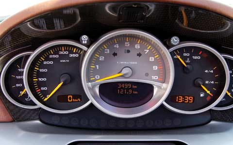 Otherwise, you just walk up to the Carrera GT, hop in, twist the key (on your left, naturally), and go tearing off in a car that delivers a thrilling level of real-racer flavor, including snappy reflexes, ultra-fine control, and 200-plus-mph velocities any moment you have the urge and the opportunity, with absolutely none of the grief associated with a true sports-prototype racing implement. The Carrera GT's cockpit leaves on display the beautiful, gloss-finished, three-dimensional weave of carbon fiber that gives even this open roadster astounding structural rigidity. (Porsche says the chassis is stiffer than a steel 911 GT3 coupe's with the racing rollcage welded in!) But unlike the Enzo's, the rest of the interior is finished to the same high standard as your typical 911's, with leather and satin aluminum trim, a real glovebox, a wood-capped shift knob (placed high in the center stack, beside the wheel rim), and a great Bose stereo and a nav system you can specify or not, without charge.