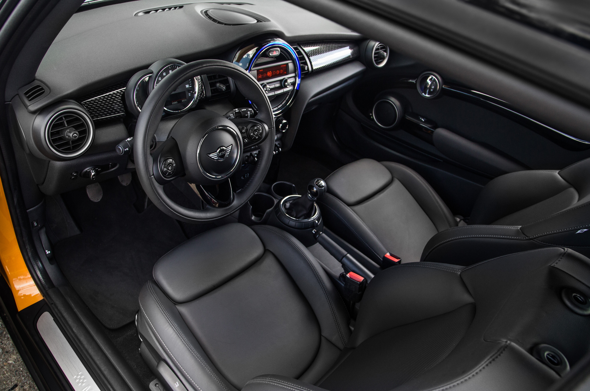 The duo seated in the rear will find it easier to climb aboard, and once belted, will revel in the bigger seats and added leg (up 2.9 inches) and shoulder room (up 3.1 inches). Front riders experience an entirely redesigned dash having that aforementioned toggle switch (no more fob insertion needed) and climate controls at its lower section, and above them, a smallish 4-line TFT display surrounded by plastic cladding. (The optional Mini navigation system with 8.8-inch screen and Mini Connected Services would likely add flavor to the bleak landscape.) As is the trend for Minis nowadays, window switches are thankfully located on the doors and not the center stack.