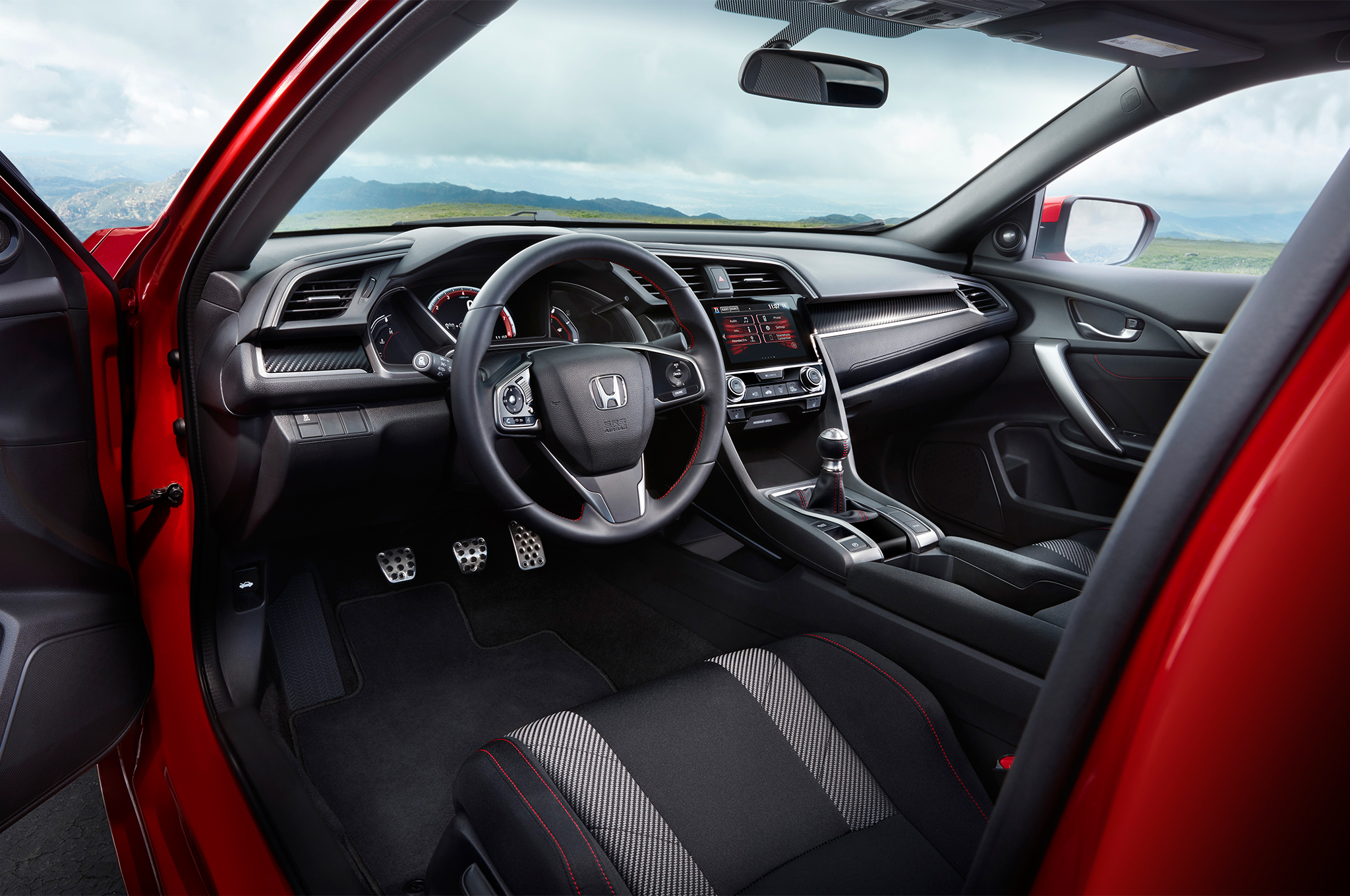 The Si gets all the same features as the EX-T trim, which includes an electronic parking brake, dual-zone climate control, heated front seats, and rain-sensing wipers. The Si also get a 7.0-inch Display Audio touchscreen infotainment system that's compatible with Apple CarPlay and Android Auto and a 450-watt, 10-speaker sound system with SiriusXM satellite radio and Pandora streaming radio capability. The front sport seats, shift boot, and door panels get red stitching. There's also an aluminum shift knob, and the front seat backs are emblazoned with the Si logo. Meanwhile, the TFT screen in the gauge cluster and audio system are illuminated red.