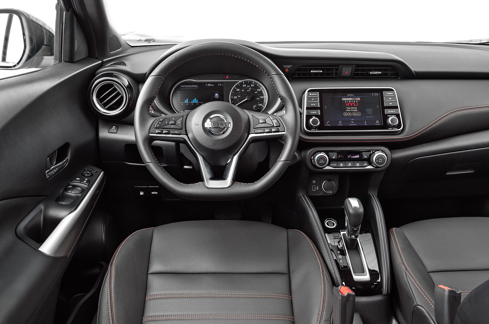 Although the HR-V's suspension is on the harsher side, the Kicks' suspension provides excellent ride quality over harsh pavement. You shouldn't need to brace yourself over every road imperfection or freeway expansion joint—though you'll probably hear them. Inside, our 2018 Kicks SR tester looked impressively decked out for a $22,630 car. Sure, the door panels are mostly hard black plastic, but there are positive spots, too. Most vehicles at this price won't offer the Kicks' 7.0-inch instrument cluster display included on the Kicks SV and SR (complete with a tire pressure monitoring system with readouts for every tire), or the leather-like material on the passenger side of the dash and the similar material on either side of the center console. Four control knobs (volume, tuning, air temperature, and air flow level) keep things straightforward, though I wish the center-stack touchscreen was mounted higher for better visibility. The Kicks lacks a covered center console storage area, but the driver does get an armrest on the right side. In back, it'd be cool if rear-seat passengers had a central armrest that folds out of the middle rear seat … but did we mention the Kicks starts at just $18,965?