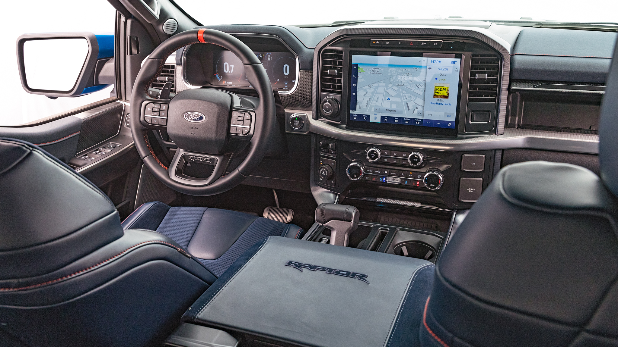 All this is wrapped in an F-22 Raptor-inspired body that's 6.0 inches wider than the standard F-150's. Ah yes, we can hear the eagle scream and the flap of the ol' Stars and Stripes at the idea of a fighter-jet-inspired off-road truck. According to exterior designer Tom Liu, the new Raptor aims to inspire "American power and might," so we expect each and every one of you to stand at attention with a burger in hand and apple pie on your face every time one of these buzzes by your home. It's a patriot's duty, after all. Inside you can expect all the same updates levied upon the 14th-generation F-150, including the collapsible shift handle and large digital displays for the gauge cluster and infotainment. Raptor-specific tinsel includes unique fabric, colors, trim, and optional Recaro seats.