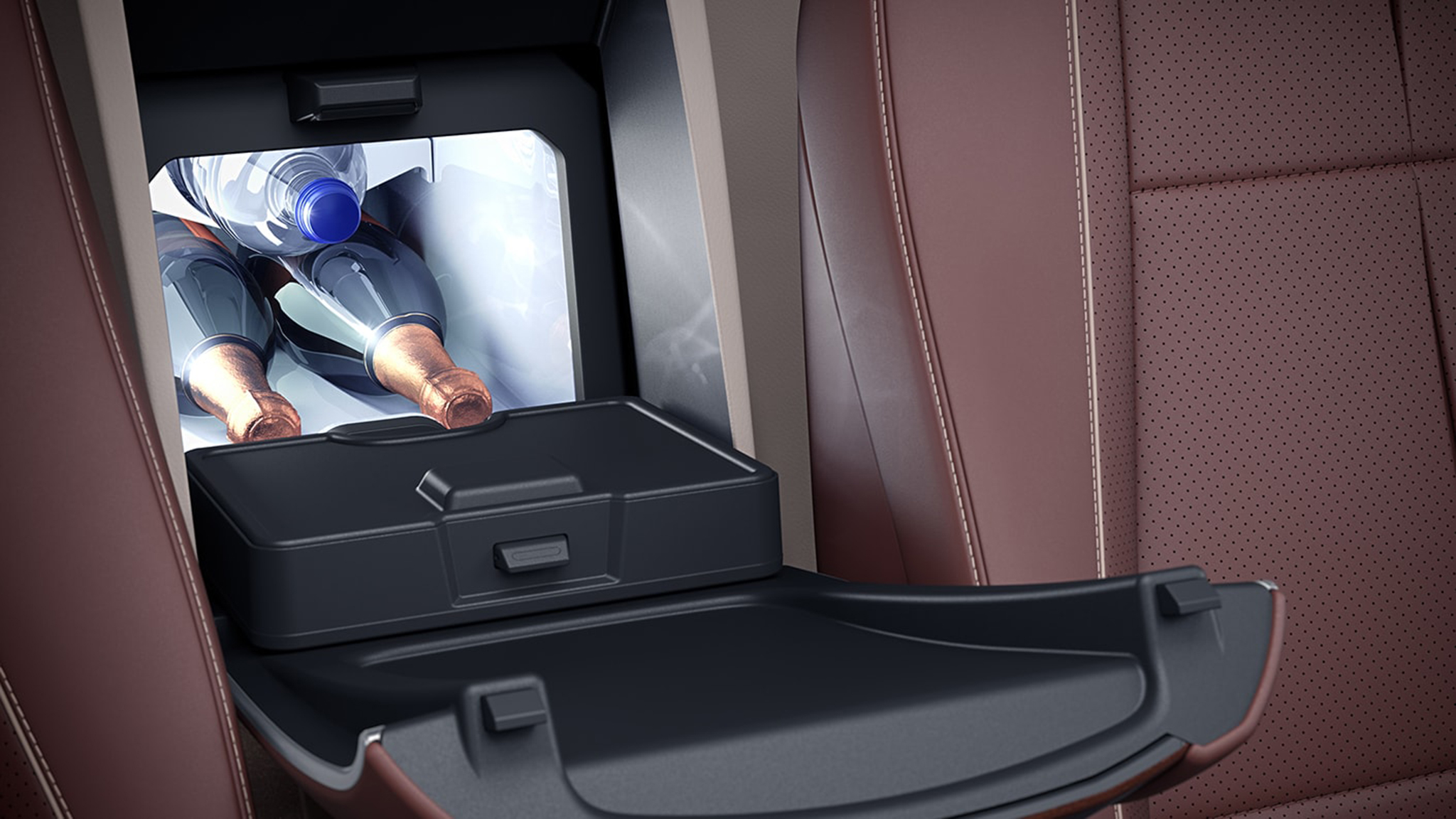 Below the optional seat-back-mounted rear infotainment screens are the $1,800 pullout folding trays, much like on an airplane, with a rubberized surface so you can sip bubbly safely while listening to the 27-speaker Burmester surround-sound audio system. The trays can be positioned in portrait or landscape configuration, making the pair more convenient for work or play. A charging pad is available for your devices.