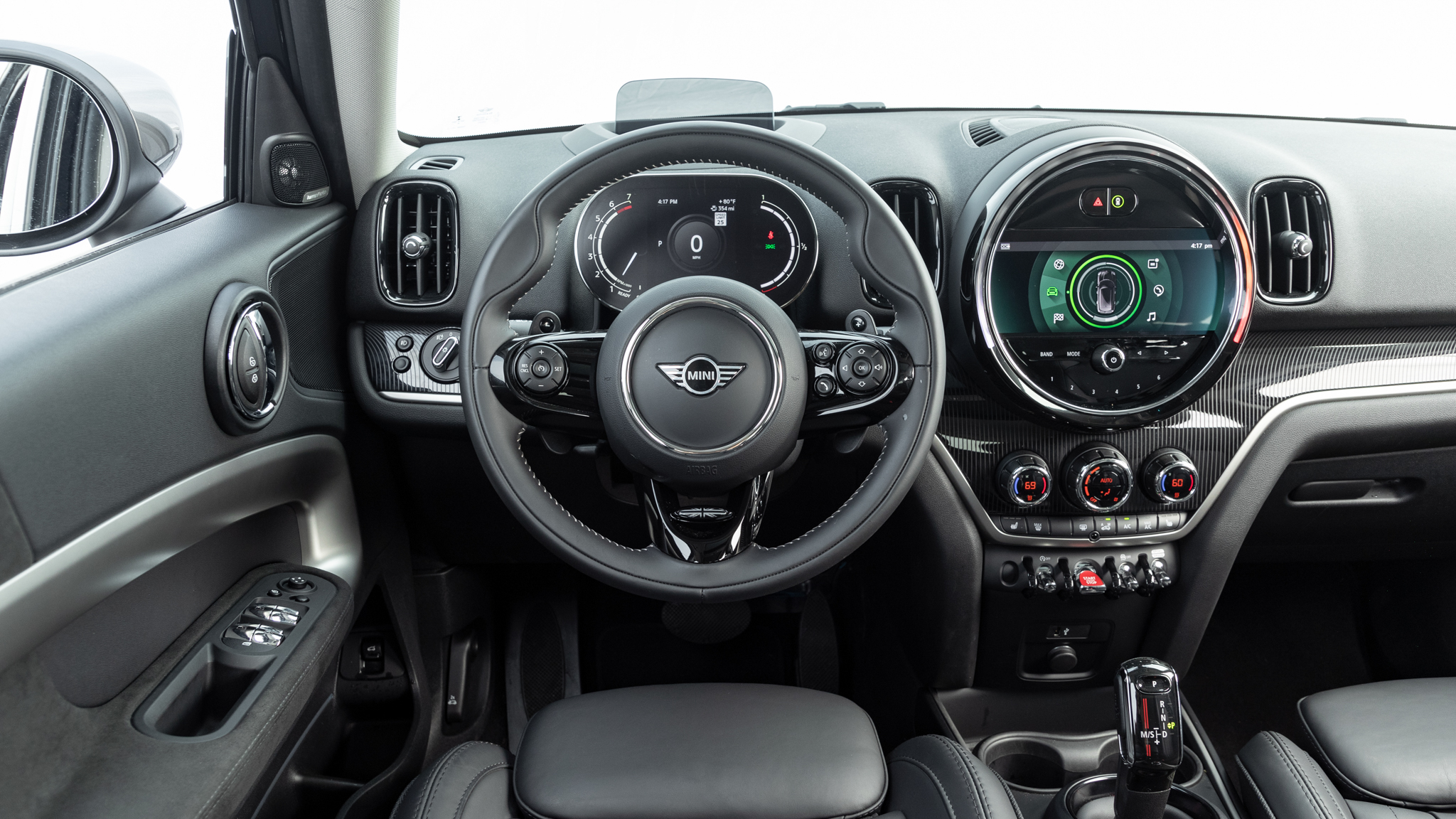 The 2021 Mini Cooper S Countryman has a charming appearance and proper packaging. Inside, you find classic Mini features such as the round 8.8-inch touchscreen, the bubbly steering wheel, faux aluminum switches, and a tiny 5.0-inch digital instrument cluster. The power-adjustable, heated sport seats are well bolstered and comfortable. And if you look closely, the Union Jack flag in the headrests is a nice touch.